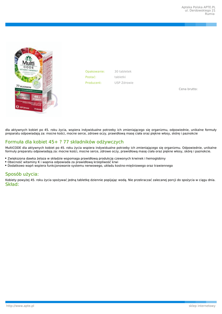 Apteka Polska APTE.PL ul. Derdowskiego 21 Rumia Opakowanie: 30 tabletek Postać: tabletki Producent: USP Zdrowie Cena brutto: dla aktywnych kobiet po 45. roku życia, wspiera indywidualne potrzeby ich zmieniającego się organizmu, odpowiednie, unikalne formuły preparatu odpowiadają za: mocne kości, mocne serce, zdrowe oczy, prawidłową masę ciała oraz piękne włosy, skórę i paznokcie Formuła dla kobiet 45+ ? 77 składników odżywczych MultiCODE dla aktywnych kobiet po 45. roku życia wspiera indywidualne potrzeby ich zmieniającego się organizmu. Odpowiednie, unikalne formuły preparatu odpowiadają za: mocne kości, mocne serce, zdrowe oczy, prawidłową masę ciała oraz piękne włosy, skórę i paznokcie. Zwiększona dawka żelaza w składzie wspomaga prawidłową produkcję czewonych krwinek i hemoglobiny Obecność witaminy K i wapnia odpowiada za prawidłową krzepliwość krwi Dodatkowo wapń wspiera funkcjonowanie systemu nerwowego, układu kostno-mięśniowego oraz trawiennego Sposób użycia: Kobiety powyżej 45. roku życia spożywać jedną tabletkę dziennie popijając wodą. Nie przekraczać zalecanej porcji do spożycia w ciągu dnia. Skład: http://www.apte.pl sklep internetowy Apteka Polska APTE.PL ul. Derdowskiego 21 Rumia http://www.apte.pl sklep internetowy Apteka Polska APTE.PL ul. Derdowskiego 21 Rumia http://www.apte.pl sklep internetowy