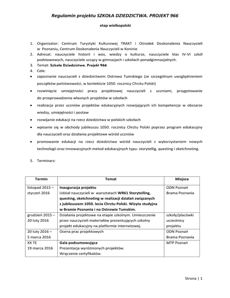 Regulamin projektu SZKOŁA DZIEDZICTWA. PROJEKT 966 etap wielkopolski 1. Organizator: Centrum Turystyki Kulturowej TRAKT i Ośrodek Doskonalenia Nauczycieli w Poznaniu, Centrum Doskonalenia Nauczycieli w Koninie 2. Adresat: nauczyciele historii i wos, wiedzy o kulturze, nauczyciele klas IV-VI szkół podstawowych, nauczyciele uczący w gimnazjach i szkołach ponadgimnazjalnych. 3. Temat: Szkoła Dziedzictwa. Projekt 966 4. Cele: zapoznanie nauczycieli z dziedzictwem Ostrowa Tumskiego (ze szczególnym uwzględnieniem początków państwowości, w kontekście 1050. rocznicy Chrztu Polski) rozwinięcie umiejętności pracy projektowej nauczycieli z uczniami, przygotowanie do przeprowadzenia własnych projektów w szkołach realizacja przez uczniów projektów edukacyjnych rozwijających ich kompetencje w obszarze wiedzy, umiejętności i postaw rozwijanie edukacji na rzecz dziedzictwa w polskich szkołach wpisanie się w obchody jubileuszu 1050. rocznicy Chrztu Polski poprzez program edukacyjny dla nauczycieli oraz działania projektowe wśród uczniów promowanie edukacji na rzecz dziedzictwa wśród nauczycieli z wykorzystaniem nowych technologii oraz innowacyjnych metod edukacyjnych typu: storytellig, questing i sketchnoting. 5. Terminarz: Termin listopad 2015 – styczeń 2016 grudzień 2015 – 20 luty 2016 20 luty 2016 – 5 marca 2016 XX TE 19 marca 2016 Temat Inauguracja projektu Udział nauczycieli w warsztatach WR61 Storytelling, questing, sketchnoting w realizacji działań związanych z jubileuszem 1050. lecia Chrztu Polski. Wizyta studyjna w Bramie Poznania i na Ostrowie Tumskim. Działania projektowe na etapie szkolnym. Umieszczenie przez nauczycieli materiałów prezentujących szkolny projekt edukacyjny na platformie internetowej. Ocena prac projektowych Gala podsumowująca Prezentacja wyróżnionych projektów. Wręczenie certyfikatów. Miejsce ODN Poznań Brama Poznania szkoły/placówki uczestnicy projektu ODN Poznań Brama Poznania MTP Poznań Strona | 1 Regulamin projektu SZKOŁA DZIEDZICTWA. PROJEKT 966 etap wielkopolski 6. Warunki udziału w projekcie: Udział nauczycieli w warsztatach WR61 Storytelling, questing, sketchnoting w realizacji działań związanych z jubileuszem 1050. lecia Chrztu Polski. Wizyta studyjna w Bramie Poznania i na Ostrowie Tumskim. Przeprowadzenie etapu szkolnego: grudzień 2015 – 20 luty 2016 Działania projektowe na etapie szkolnym. Zrealizowanie wybranego tematu projektowego: 966-2016 domy wczoraj i dziś 966-2016 kuchnia wczoraj i dziś 966-2016 stroje wczoraj i dziś 966-2016 życie wczoraj i dziś Jak decyzja Mieszka wpłynęła na przebieg historii Polski? Czy jeden człowiek może wpłynąć na losy społeczności? Gdyby Mieszko dzisiaj do nas przyszedł to … Mieszku, co byś nam dzisiaj powiedział? Gdyby nie było Chrztu Polski? Jeżeli nie chrzest to co? Moja miejscowość w historii 966-2016 Temat zaproponowany przez szkołę. Umieszczenie przez nauczycieli materiałów prezentujących szkolny projekt edukacyjny na platformie internetowej (opis projektu, filmy, zdjęcia, nagrania, relacje, itp.) Udział nauczycieli i uczniów w gali podsumowującej projekt podczas XX Targów Edukacyjnych. 7. Podsumowanie projektu: 19 marca 2016 Udział w gali podsumowującej projekt podczas XX Targów Edukacyjnych. Wręczenie certyfikatów. 8. Informacje organizacyjne: Organizator zastrzega sobie prawo do wprowadzania zmian w regulaminie Informacje bieżące będą wysyłane na adresy mailowe opiekunów grupy projektowej w danej szkole/placówce. Informacji udziela: Piotr Gołdyn telefon: 63 2457520 w. 212 [email protected] Strona | 2