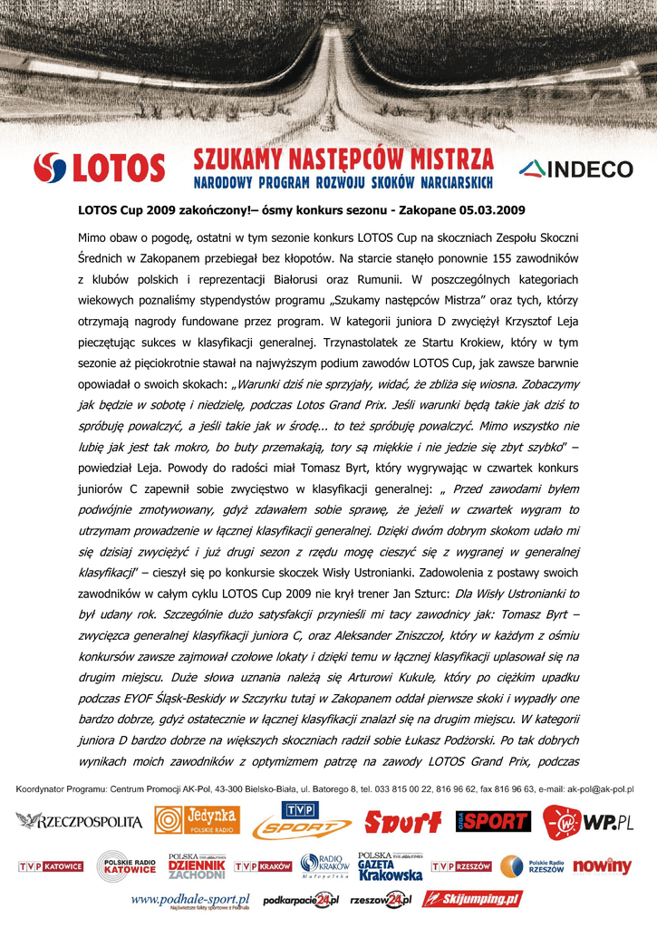 LOTOS Cup 2009 zakończony!– ósmy konkurs sezonu - Zakopane 05.03.2009 Mimo obaw o pogodę, ostatni w tym sezonie konkurs LOTOS Cup na skoczniach Zespołu Skoczni Średnich w Zakopanem przebiegał bez kłopotów. Na starcie stanęło ponownie 155 zawodników z klubów polskich i reprezentacji Białorusi oraz Rumunii. W poszczególnych kategoriach wiekowych poznaliśmy stypendystów programu „Szukamy następców Mistrza” oraz tych, którzy otrzymają nagrody fundowane przez program. W kategorii juniora D zwyciężył Krzysztof Leja pieczętując sukces w klasyfikacji generalnej. Trzynastolatek ze Startu Krokiew, który w tym sezonie aż pięciokrotnie stawał na najwyższym podium zawodów LOTOS Cup, jak zawsze barwnie opowiadał o swoich skokach: „Warunki dziś nie sprzyjały, widać, że zbliża się wiosna. Zobaczymy jak będzie w sobotę i niedzielę, podczas Lotos Grand Prix. Jeśli warunki będą takie jak dziś to spróbuję powalczyć, a jeśli takie jak w środę... to też spróbuję powalczyć. Mimo wszystko nie lubię jak jest tak mokro, bo buty przemakają, tory są miękkie i nie jedzie się zbyt szybko” – powiedział Leja. Powody do radości miał Tomasz Byrt, który wygrywając w czwartek konkurs juniorów C zapewnił sobie zwycięstwo w klasyfikacji generalnej: „ Przed zawodami byłem podwójnie zmotywowany, gdyż zdawałem sobie sprawę, że jeżeli w czwartek wygram to utrzymam prowadzenie w łącznej klasyfikacji generalnej. Dzięki dwóm dobrym skokom udało mi się dzisiaj zwyciężyć i już drugi sezon z rzędu mogę cieszyć się z wygranej w generalnej klasyfikacji” – cieszył się po konkursie skoczek Wisły Ustronianki. Zadowolenia z postawy swoich zawodników w całym cyklu LOTOS Cup 2009 nie krył trener Jan Szturc: Dla Wisły Ustronianki to był udany rok. Szczególnie dużo satysfakcji przynieśli mi tacy zawodnicy jak: Tomasz Byrt – zwycięzca generalnej klasyfikacji juniora C, oraz Aleksander Zniszczoł, który w każdym z ośmiu konkursów zawsze zajmował czołowe lokaty i dzięki temu w łącznej klasyfikacji uplasował się na drugim miejscu. Duże słowa uznania należą się Arturowi Kukule, który po ciężkim upadku podczas EYOF Śląsk-Beskidy w Szczyrku tutaj w Zakopanem oddał pierwsze skoki i wypadły one bardzo dobrze, gdyż ostatecznie w łącznej klasyfikacji znalazł się na drugim miejscu. W kategorii juniora D bardzo dobrze na większych skoczniach radził sobie Łukasz Podżorski. Po tak dobrych wynikach moich zawodników z optymizmem patrzę na zawody LOTOS Grand Prix, podczas których, jeśli tylko warunki będą równe dla wszystkich, to nasi zawodnicy powinni zajmować czołowe lokaty. W klasyfikacji generalnej juniora E triumfował Dawid Jarząbek, a oba czwartkowe konkursy tej grupy wygrał Rumun Stefan Blega: Jestem z tego powodu bardzo szczęśliwy. Polscy skoczkowie skakali dobrze, ale udało mi się ich pokonać – powiedział młody skoczek rumuński. Wyniki: Dziewczęta open – pierwszy konkurs czwartkowy – skocznia HS-38 1. Joanna Gawron TS Wisła Zakopane GMS – 28,5 m i 28,5 m – nota łączna 166,7 pkt 2. Dana Haralambie (ROM) – 25 m i 25 m – nota łączna 135,0 pkt 3. Denisa Torok (ROM) – 24,5 m i 23 m – nota łączna 121,0 pkt 4. Joanna Szwab TS Wisła Zakopane – 22,5 m i 23 m - nota łączna 113,5 pkt 5. Magdalena Pałasz UKS Sołtysianie Stare Bystre SMS – 20,5 m i 21 m - nota łączna 98,4 pkt 6. Maja Stachowska UKS Regle Kościelisko – 15 m i 19,5 m – nota łączna 69,2 pkt Wystartowało 7 zawodniczek Dziewczęta open – drugi konkurs czwartkowy – skocznia HS-38 1. Joanna Gawron TS Wisła Zakopane GMS – 27,5 m i 26,5 m – nota łączna 154,4 pkt 2. Dana Haralambie (ROM) – 25 m i 25,5 m – nota łączna 139,3 pkt 3. Denisa Torok (ROM) – 23 m i 22,5 m – nota łączna 115,3 pkt 4. Joanna Szwab TS Wisła Zakopane – 22 m i 21 m - nota łączna 106,8 pkt 5. Magdalena Pałasz UKS Sołtysianie Stare Bystre SMS - 20 m i 20 m - nota łączna 91,0 pkt 6. Maja Stachowska UKS Regle Kościelisko – 17 m i 18,5 m – nota łączna 75,3 pkt Wystartowało 7 zawodniczek Klasyfikacja generalna dziewcząt LOTOS Cup 2009 1. Joanna Szwab TS Wisła Zakopane – 660 pkt 2. Magdalena Pałasz UKS Sołtysianie Stare Bystre SMS – 570 pkt 3. Joanna Gawron TS Wisła Zakopane GMS-ne – 500 pkt 4. Monika Luber PKS Olimpijczyk Gilowice – 410 pkt 5. Maja Stachowska UKS Regle Kościelisko – 310 pkt 6. Kamila Bafia TS Wisła Zakopane UKS Chochołów – 90 pkt Junior E (1997 i młodsi) – pierwszy konkurs czwartkowy – skocznia HS-38 1. Stefan Blega (ROM) – 30,5 m i 29,5 m – nota łączna 183,5 pkt 2. Krzysztof Kabot KS Wisła Ustronianka – 29 m i 29,5 m – nota łączna 176,6pkt 3. Eduard Torok (ROM) – 30 m i 29 m – nota łączna 176,4 pkt 4. Julian Pitea (ROM) – 29 m i 28,5 m – nota łączna 176 pkt 5. Dawid Jarząbek TS Wisła Zakopane – 27,5 m i 28 m - nota łączna 167,3 pkt 6. Bartłomiej Jarząbek TS Wisła Zakopane – 28 m i 27 m – nota łączna 161,5 pkt Wystartowało 38 zawodników Junior E (1997 i młodsi) – drugi konkurs czwartkowy – skocznia HS-38 1. Stefan Blega (ROM) – 30 m i 29,5 m – nota łączna 183,7 pkt 2. Krzysztof Kabot KS Wisła Ustronianka – 29,5 m i 28,5 m – nota łączna 173,8 pkt 3. Dawid Jarząbek TS Wisła Zakopane – 29,5 m i 28 m - nota łączna 170,5 pkt 4. Bartłomiej Jarząbek TS Wisła Zakopane – 28,5 m i 28 m – nota łączna 169,9 pkt 5. Eduard Torok (ROM) – 28,5 m i 28,5 m – nota łączna 167,2 pkt 6. Krystian Kołodziej Start Krokiew Zakopane – 27,5 m i 28,5 m – nota łączna 165,1 pkt Klasyfikacja generalna (junior E) LOTOS Cup 2009 1. Dawid Jarząbek TS Wisła Zakopane – 660 pkt 2. Krzysztof Kabot KS Wisła Ustronianka – 602 pkt 3. Andrzej Pałasz UKS Sołtysianie Stare Bystre – 362 pkt 4. Jakub Jarosz KS Wisła Ustronianka – 350 pkt 5. Paweł Wąsek LKS Olimpia Goleszów – 341 pkt 6. Bart