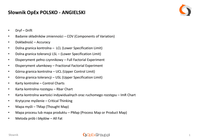 Słownik OpEx POLSKO - ANGIELSKI • Dryf – Drift • Badanie składników zmienności – COV (Components of Variation) • Dokładność – Accuracy • Dolna granica kontrolna – LCL (Lower Specification Limit) • Dolna granica tolerancji LSL – (Lower Specification Limit) • Eksperyment pełno czynnikowy – Full Factorial Experiment • Eksperyment ułamkowy – Fractional Factorial Experiment • Górna granica kontrolna – UCL (Upper Control Limit) • Górna granica tolerancji – USL (Upper Specification Limit) • Karty kontrolne – Control Charts • Karta kontrolna rozstępu – Rbar Chart • Karta kontrolna wartości indywidualnych oraz ruchomego rozstępu – ImR Chart • Krytyczne myślenie – Critical Thinking • Mapa myśli – TMap (Thought Map) • Mapa procesu lub mapa produktu – PMap (Process Map or Product Map) • Metoda prób i błędów – All Fat Słownik 1 Słownik OpEx POLSKO - ANGIELSKI • Obszar wnioskowania – Inference Space • Ocena systemu pomiarowego – MSE (Measurement System Evaluation) • OFAT (One-Factor-At-a-Time) – jeden czynnik w czasie • OpEx – Operational Excellence • Ortogonalność – Orthonality • Planowanie eksperymentów – DOE (Design of Experiments) • Plan próbkowania – Sampling Tree • Powierzchnia odpowiedzi – Response Surface • Precyzja/ powtarzalność – Precision/ Repeatability • Projekt odkrywczy – Discovery Project • Projekt rutynowy – Execution Project • Przeregulowanie – Quincunxing • Przesunięcie – Bias • Przyczyna losowa Common Cause • Przyczyna specjalna – Special Cause • Rezolucja – Resolution Słownik 22 Słownik OpEx POLSKO - ANGIELSKI • Rozdzielczość/ dyskryminacja – Discrimination • Sekwencyjne uczenie się – Sequential Learning • Stabilność – Stability • Stopnie swobody – Df (Degree of Freedom) • Tabela składników zmienności – Rate of Change Table • Uwikłany – Confounded • wewnątrz i pomiędzy – Within & Between • Wykres pudełkowy – Box Plot • Zakłócenia – Noise • Zbalansowany – Balanced • Zmiana – Shift • Zmienność specjalna – Special Cause Variation • Zmienność naturalna/ losowa – Common Cause Variation • Związek przyczynowo skutkowy – Cause & Effects • Źródła zmienności – SOV (Sources of Variation) Słownik 33 Słownik OpEx ANGIELSKO - POLSKI • Accuracy – dokładność • All Fat – metoda prób i błędów • Balanced - zbalansowany • Bias - przesunięcie • Box Plot – wykres pudełkowy • Cause & Effects – związek przyczynowo skutkowy • Common Cause – przyczyna losowa • Common Cause Variation – zmienność naturalna/ losowa • Confounded - uwikłany • Control Charts – karty kontrolne • COV (Components of Variation) – badanie składników zmienności • Critical Thinking – krytyczne myślenie • Df (Degree of Freedom) – stopnie swobody • Discrimination – rozdzielczość/ dyskryminacja • Discovery Project – projekt odkrywczy • DOE (Design of Experiments) – planowanie eksperymentów Słownik 4 Słownik OpEx ANGIELSKO - POLSKI • Drift – dryf • Execution Project – projekt rutynowy • Full Factorial Experiment – eksperyment pełno czynnikowy • Fractional Factorial Experiment – eksperyment ułamkowy • ImR Chart – karta kontrolna wartości indywidualnych oraz ruchomego rozstępu • Inference Space – obszar wnioskowania • LCL (Lower Specification Limit) – dolna granica kontrolna • LSL (Lower Specification Limit) – dolna granica tolerancji • MSE (Measurement System Evaluation) – ocena systemu pomiarowego • Noise – Zakłócenia • OFAT (One-Factor-At-a-Time) – jeden czynnik w czasie • OpEx – Operational Excellence • Orthonality - ortogonalność • PMap (Process Map or Product Map) – mapa procesu lub mapa produktu • Precision/ Repeatability – precyzja/ powtarzalność • Rate of Change Table – tabela składników zmienności Słownik 55 Słownik OpEx ANGIELSKO - POLSKI • Rbar Chart – karta kontrolna rozstępu • Resolution - rezolucja • Response Surface – powierzchnia odpowiedzi • Sampling Tree – plan próbkowania • Sequential Learning – sekwencyjne uczenie się • Shift – zmiana • SOV (Sources of Variation) – źródła zmienności • Special Cause – przyczyna specjalna • Special Cause Variation – zmienność specjalna • Stability - stabilność • Quincunxing - przeregulowanie • TMap (Thought Map) – mapa myśli • UCL (Upper Control Limit) – górna granica kontrolna • USL (Upper Specification Limit) – górna granica tolerancji • Within & Between – wewnątrz i pomiędzy Słownik 66