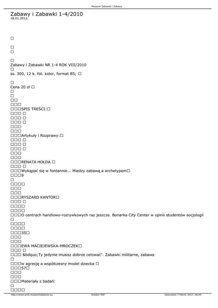 Muzeum Zabawek i Zabawy Zabawy i Zabawki 1-4/2010 18.01.2012. Zabawy i Zabawki NR 1-4 ROK VIII/2010 ss. 300, 12 k. fot. kolor, format B5; Cena 20 zł SPIS TREŚCI: Artykuły i Rozprawy: RENATA HOŁDA Wykąpać się w fontannie... Miedzy zabawą a archetypem 9 RYSZARD KANTOR O centrach handlowo-rozrywkowych raz jeszcze. Bonarka City Center w opinii studentów socjologii 35 EWA MACIEJEWSKA-MROCZEK „Ty jedynie musisz dobrze celować". Zabawki militarne, zabawa w agresję a współczesny model dziecka 57 Materiały z badań: http://www.arch.muzeumzabawek.eu Kreator PDF Utworzono 7 March, 2017, 06:05 Muzeum Zabawek i Zabawy MAGDALENA SZALBOT Przyjemność codzienności. O zabawkach dorosłych 69 MONIKA SZLĘZAK Karnawalizacja codzienności? Tendencje ludyczne w Polsce „po 10 kwietnia" 103 DOROTA CZAKON, PAULINA DYDEK W objęciach jednorękiego bandyty czyli o zabawie prowadzącej do uzależnienia 113 EWA CZEMERYS Portale randkowe - sposób na samotność czy zabawa? 137 SYLWIA JASIAK Wspólnota zabawy. Wirtualna społeczność skupiona wokół gry Ragnarok Online 153 153 TOMASZ MICHALEWSKI Motywy ludyczne w Piastonaliach Opolskich 173 Referaty: AGNIESZKA KOZŁOWSKA-PIASTA W trosce o widza. Czy nadchodzi zmierzch muzealnictwa? 189 http://www.arch.muzeumzabawek.eu Kreator PDF Utworzono 7 March, 2017, 06:05 Muzeum Zabawek i Zabawy ELENA REPRINCEWA Zabawa w życiu sławnych ludzi Rosji 215 Komunikaty: MONIKA ŁATA Jest miasto, jest zabawa 231 Źródła i informacje: RENATA HOŁDA 243 Regina Lilientalowa (1877-1924) 243 REGINA LILIENTALOWA Gry zabawy i zabawki dziecka żydowskiego 247 ANNA SPISS Książki z dziecinnej biblioteczki 261 261 ANNA BAŃKOWSKA Zabawy i zabawki wojennego dziecka 279 KATARZYNA HODUREK-KIEK http://www.arch.muzeumzabawek.eu Kreator PDF Utworzono 7 March, 2017, 06:05 Muzeum Zabawek i Zabawy Vinylowa za(b)jawka 285 RECENZJE 291 Pobierz spis_tresci_010 http://www.arch.muzeumzabawek.eu Kreator PDF Utworzono 7 March, 2017, 06:05