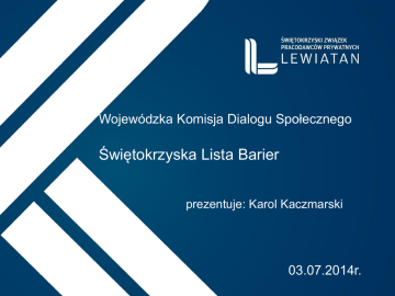 Wojewódzka Komisja Dialogu Społecznego Świętokrzyska Lista Barier prezentuje: Karol Kaczmarski 03.07.2014r. Świętokrzyska Lista Barier – co to jest? Katalog problemów; Źródła barier; Propozycje rozwiązań; SKARŻYSKO KAMIENNA KOŃSKIE SANDOMIERZ WŁOSZCZOWA STARACHOWISCE KIELCE BUSKO ZDRÓJ STASZÓW 13 spotkań; 160 uczestników; 64 strony materiału; 10 kluczowych obszarów; Przedsiębiorcy w świętokrzyskim wskazują kluczowe obszary problemów: 1. Bariery komunikacyjne; 2. Bariery administracyjne; 3. Bariery kompetencyjne; 4. Bariery infrastrukturalne. Bariery komunikacyjne: 1. Klimat nieprzyjazny dla rozwoju przedsiębiorczości; 2. Brak rzetelnej i konsekwentnej współpracy na linii administracja – biznes. Bariery administracyjne: 1. Przewlekłe i skomplikowane procedury (KRS); 2. Niestabilne przepisy; 3. Brak planów zagospodarowania przestrzennego; Bariery kompetencyjne: 1. Niska jakość specyfikacji przetargowych; 2. Środki europejskie – skomplikowane procedury; Bariery infrastrukturalne: 1. Niska dostępność szerokopasmowego internetu; 2. Brak szybkiego połączenia regionu z resztą kraju; 3. Lotnisko Co proponujemy: Stworzenie rankingu samorządów przyjaznych dla biznesu; Stworzenie systemu jednego okienka dla przedsiębiorców; Stworzenie standardu obsługi przedsiębiorcy Tworzenie kompleksowych terenów inwestycyjnych; Działania na rzecz poprawy wizerunku przedsiębiorców; Co proponujemy: Stworzenie rankingu samorządów przyjaznych dla biznesu; Stworzenie standardu obsługi przedsiębiorcy Powiązanie pozyskiwania środków na inwestycje JST z planowaniem przestrzennym Stworzenie systemu motywacyjnego pracowników administracji. Zmiany w systemie stanowienia prawa Co proponujemy: Co proponujemy: Zwiększenie katalogu spraw do załatwienia drogą elektroniczną Przyspieszenie rozbudowy infrastruktury teleinformatycznej Stworzenie drogowej „Grupy Nacisku” Zwiększenie wykorzystania partnerstwa publiczno prywatnego Co proponujemy: Tworzenie kompetentnych zespołów zamówień Określenie terminu rażąco niskiej ceny Wprowadzenie standardów realizacji inwestycji Wprowadzenie obowiązku stosowania kryteriów innych niż cena Co proponujemy: Proste czytelne i jasne kryteria wyboru projektów europejskich Kompleksowa dokumentacja konkursowa Upowszechnianie rozliczeń ryczałtowych Co proponujemy: Bariery infrastruktu ralne • Zmiany wymagające ścieżki legislacyjnej; Bariery administrac yjne Rekomendacje miękkie Rekomendacje twarde Bariery komunikacy jne Bariery kompetenc yjne • Zmiany wymagające oddziaływania na poziomie regionalnym; Co proponujemy - działania: Rekomendacje twarde: Rekomendacje miękkie: Okrągły Stół; Ranking; Konfederacja Lewiatan; Standardy; Opinie i Stanowiska; O biznesie przy kawie; Projekty aktów prawnych; Konferencje, spotkania, debaty. Świętokrzyska Lista barier. Zapraszam do dyskusji