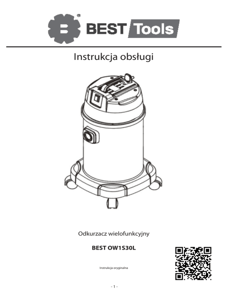 Instrukcja obsługi Odkurzacz wielofunkcyjny BEST OW1S30L Instrukcja oryginalna -1- Gratulujemy i dziękujemy, że zdecydowali się Państwo na zakup niniejszego produktu, dając dowód na to, że nie akceptują Państwo żadnych kompromisów: Liczy się najwyższa jakość. Poniższa instrukcja została stworzona z myślą o kompleksowym zaprezentowaniu Państwu jakości i wysokiej wydajności urządzenia. Sugerujemy uważne zapoznanie się z całą instrukcją przed rozpoczęciem użytkowania urządzenia. Oznakowanie CE znajdujące się na produkcie oznacza, że urządzenie zostało zbudowane zgodnie z europejskimi normami bezpieczeństwa. Producent zastrzega sobie prawo do wprowadzania zmian do niniejszej publikacji bez uprzedzenia w ramach ulepszania produktów. Niniejsza instrukcja nie może być powielana w całości lub w części bez zgody producenta. Spis treści 1. Schemat montażu i instalacji odkurzacza - str. 3 2. Parametry techniczne - str. 4 3. Właściwości produktu - str. 4 4. Bezpieczne użytkowanie urzdzenia - str. 4 5. Instrukcja użytkowania - str. 6. Konserwacja - str. 6 7. Prawidłowa utylizacja produktu - str. 8 8. Dokument przedstawiający treść Deklaracji Zgodności CE - str. 9 9. Gwarancja - str. 10 -2- 1. Schemat montażu i instalacji odkurzacza -3- 2. Parametry techniczne Odkurzacz warsztatowy: OW1S30L BEST Moc (W) 1000 Układ chłodzenia Chłodzenie powietrzem Siła ssąca (kPa) ≥18 Pojemność (l) 30 Średnica pojemnika (mm) 320 Przepływ powietrza (l/s) 53 Napięcie znamionowe (V) 230 Długość kabla zasilającego (m) 4,5 Długość węża (m) 5 3. Właściwości produktu: 1. Odkurzacz do pracy na mokro i na sucho 2. Wyposażony w bardzo wydajny silnik o mocy 1000W 3. Długi przewód zasilający (4.5m) i wąż karbowany (5m) 4. Estetyczny wygląd. Nadaje się do hoteli, biur, innych miejsc użyteczności publicznej. 5. Pojemnik ze stali nierdzewnej. 6. Cicha praca -4- 4. Bezpieczne użytkowanie urządzenia 1. Sprawdzić przed uruchomieniem, czy napięcie zasilania jest takie samo jak w opisie na etykiecie. 2. Nie używać urządzenia w środowisku wybuchowym i w pobliżu łatwopalnych materiałów, aby iskra z silnika nie stała się przyczyną pożaru 3. Nie zatykać otworu wlotowego powietrza, gdyż może to doprowadzić do przegrzania i uszkodzenia silnika. 4. Nie należy zbierać odkurzaczem przedmiotów łatwopalnych i wybuchowych, takich jak żarzące się papierosy, benzyna, itp. Nie zbierać odkurzaczem ostrych przedmiotów. 5. Nie zbierać odkurzaczem substancji, które łatwo przylegają do filtra, takich jak proszek wapienny, zaprawa i proszek grafitowy, gdyż zablokują przepływ powietrza i spowodują uszkodzenie silnika. 6. Przed konserwacją oraz po użyciu wyłączyć urządzenie i wyjąć wtyczkę za każdym razem po jego użyciu lub po naprawie. 7. Nie zostawiać odkurzacza w miejscach silnie nasłonecznionych, lub w pobliżu urządzeń emitujących duże ilości ciepła, aby uniknąć odkształceń części plastikowych. 8. Nie przemieszczać odkurzacza ciągnąć za wąż, nie deptać go, ani nie ciągnąć za niego, aby go nie uszkodzić. 9. Nie zanurzać pojemnika w wodzie, ani nie płukać go wodą, aby woda nie dostała się do elementów elektrycznych i nie spowodowała nieszczęśliwego wypadku. Należy użyć miękkiej szmatki i wykręcić ją mocno, aby pozbyć się nadmiaru wody, i dopiero wtedy lekko przetrzeć pojemnik. 10. Podczas odkurzania schodów należy stosować dodatkowe zabezpieczenie, aby odkurzacz nie spadł na skutek ruchów węża. 11. Nie przewracać urządzenia! Praca tylko w pozycji pionowej! Specjalne wskazówki dotyczące bezpieczeństwa 1. Kiedy zbiornik jest nadmiernie wypełniony wodą, a urządzenie zaczyna pracować, wówczas moc ssania zanika. Urządzenie wytwarza hałas, który wskazuje, że silnik pracuje z wysoką prędkością. W tej sytuacji należy odłączyć zasilanie i usunąć wodę. Włączyć urządzenie, a zacznie ono pracować normalnie. 2. Podłączać tylko do odpowiedniego gniazda z napięciem 220-240 V, 50 Hz. 3. Jeśli przewód zasilający jest uszkodzony należy zlecić jego wymianę producentowi lub jego przedstawicielowi serwisowemu, lub też innym osobom o podobnych kwalifikacjach w celu uniknięcia zagrożenia. 4. Urządzenie to nie jest przeznaczone do użytkowania przez osoby (w tym dzieci) o ograniczonych zdolnościach fizycznych, czuciowych lub psychicznych, albo o ograniczonym doświadczeniu i wiedzy, chyba że będą one nadzorowane lub zostaną poinstruowane na temat użytkowania urządzenia przez osobę odpowiedzialną za ich bezpieczeństwo. 5. Dzieci powinny być nadzorowane, aby nie bawiły się urządzeniem. 6. Przed czyszczeniem i konserwacją urządzenia należy wyjąć wtyczkę z gniazdka. -5- 5. Instrukcja użytkowania 1. Połączenie Włożyć złącze węża do otworu wlotowego powietrza, tak jak pokazano na rysunku i upewnić się, że jest ono dobrze umocowane. Podłączyć wybrane akcesoria, tak jak pokazuje rysunek. 2. Przed uruchomieniem urządzenia sprawdzić, czy filtr stożkowy przeciwpyłowy jest na swoim miejscu. 3. Przed użyciem urządzenia na mokro należy usunąć wszystko z pojemnika. 4. Włożyć wtyczkę do gniazdka zasilania. 5. Wcisnąć włącznik, aby urządzenie zaczęło pracować. Specjalne uwagi dotyczące pływaka (zaworu bezpieczeństwa) 1. Gdy zbiornik urządzenia wypełni się wodą pływak uaktywni się i w tym momencie ssanie zostanie przerwane. Pojawi się nienormalny hałas, który wskazuje, że urządzenie pracuje na wysokich obrotach. Kiedy wystąpi taka sytuacja należy szybko odłączyć zasilanie, wylać wodę, włożyć z powrotem pojemnik. Odkurzacz powróci wówczas do stanu normalnego. 2. Pływak uaktywni się również wtedy, gdy odkurzacz zostanie przewrócony. Należy wtedy szybko wyłączyć zasilanie, ustawić odkurzacz w pozycji pionowej, a następnie włączyć go ponownie. 3. Używanie odkurzacza po uaktyw