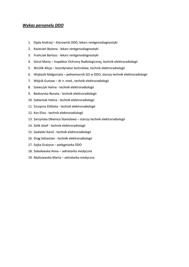 Wykaz personelu DDO 1. Dąda Andrzej – Kierownik DDO, lekarz rentgenodiagnostyki 2. Kwiecieo Bożena - lekarz rentgenodiagnostyki 3. Fraoczak Bartosz - lekarz rentgenodiagnostyki 4. Góral Maria – Inspektor Ochrony Radiologicznej, technik elektroradiologii 5. Wciślik Alicja – koordynator techników, technik elektroradiologii 6. Wojtasik Małgorzata – pełnomocnik SZJ w DDO, starszy technik elektroradiologii 7. Wójcik Gustaw – dr n. med., technik elektroradiologii 8. Szewczyk Halina - technik elektroradiologii 9. Bednarska Renata - technik elektroradiologii 10. Sobieniak Halina - technik elektroradiologii 11. Szczęsna Elżbieta - technik elektroradiologii 12. Kos Eliza - technik elektroradiologii 13. Sarzyoska Okienica Stanisława – starszy technik elektroradiologii 14. Zelik Józef - technik elektroradiologii 15. Gadalski Karol - technik elektroradiologii 16. Drąg Sebastian - technik elektroradiologii 17. Sojka Grażyna – pielęgniarka DDO 18. Sobolewska Anna – sekretarka medyczna 19. Maliszewska Marta – sekretarka medyczna