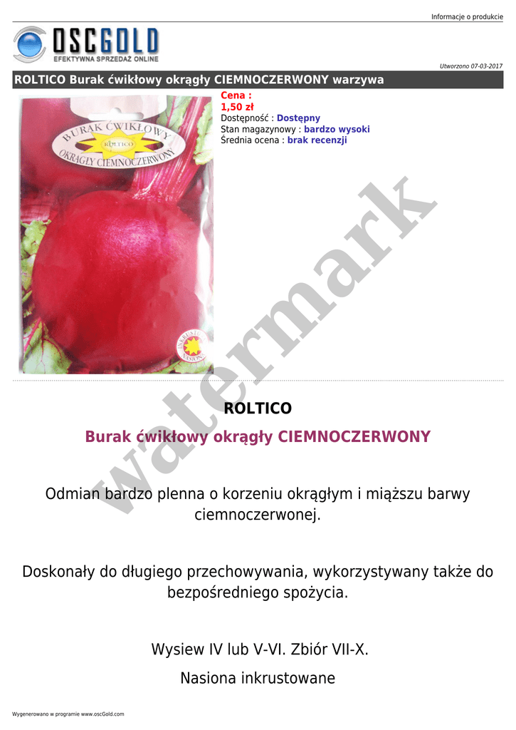 Informacje o produkcie Utworzono 07-03-2017 ROLTICO Burak ćwikłowy okrągły CIEMNOCZERWONY warzywa Cena : 1,50 zł er m ar k Dostępność : Dostępny Stan magazynowy : bardzo wysoki Średnia ocena : brak recenzji at ROLTICO w Burak ćwikłowy okrągły CIEMNOCZERWONY Odmian bardzo plenna o korzeniu okrągłym i miąższu barwy ciemnoczerwonej. Doskonały do długiego przechowywania, wykorzystywany także do bezpośredniego spożycia. Wysiew IV lub V-VI. Zbiór VII-X. Nasiona inkrustowane Wygenerowano w programie www.oscGold.com 10g opakowanie er m ar k Hurtownia Nasion GRAŻIS Hurtownia Ogrodnicza KARAT 08-400 Garwolin ul. Słoneczna 19 (25) 6821524 Robiąc zakupy w naszej hurtowni dostają Państwo gwarancję otrzymania zamówionego produktu. at Płatności za towar dokonują Państwo przez Pocztę polską w momencie otrzymania przesyłki (PACZKA POBRANIOWA) lub na konto w PYTANIA: 505 150 523 e-mail: [email protected] ZAPRASZAMY