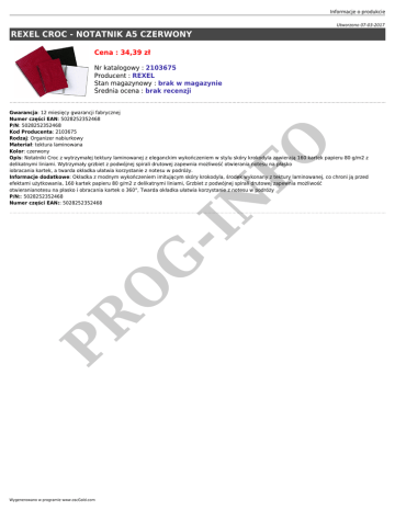 Informacje o produkcie Utworzono 07-03-2017 REXEL CROC - NOTATNIK A5 CZERWONY Cena : 34,39 zł Nr katalogowy : 2103675 Producent : REXEL Stan magazynowy : brak w magazynie Średnia ocena : brak recenzji PR O G -I N FO Gwarancja: 12 miesięcy gwarancji fabrycznej Numer części EAN: 5028252352468 P/N: 5028252352468 Kod Producenta: 2103675 Rodzaj: Organizer nabiurkowy Materiał: tektura laminowana Kolor: czerwony Opis: Notatniki Croc z wytrzymałej tektury laminowanej z eleganckim wykończeniem w stylu skóry krokodyla zawierają 160 kartek papieru 80 g/m2 z delikatnymi liniami. Wytrzymały grzbiet z podwójnej spirali drutowej zapewnia możliwość otwierania notesu na płasko iobracania kartek, a twarda okładka ułatwia korzystanie z notesu w podróży. Informacje dodatkowe: Okładka z modnym wykończeniem imitującym skóry krokodyla, środek wykonany z tektury laminowanej, co chroni ją przed efektami użytkowania, 160 kartek papieru 80 g/m2 z delikatnymi liniami, Grzbiet z podwójnej spirali drutowej zapewnia możliwość otwieranianotesu na płasko i obracania kartek o 360°, Twarda okładka ułatwia korzystanie z notesu w podróży P/N:: 5028252352468 Numer części EAN:: 5028252352468 Wygenerowano w programie www.oscGold.com