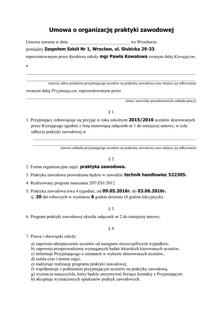 Umowa o organizację praktyki zawodowej Umowa zawarta w dniu ___________________________ we Wrocławiu pomiędzy Zespołem Szkół Nr 1, Wrocław, ul. Słubicka 29-33 reprezentowanym przez dyrektora szkoły mgr Pawła Kowalowa zwanym dalej Kierującym, a _____________________________________________________________________________ _____________________________________________________________________________ (nazwa, adres podmiotu przyjmującego uczniów na praktykę zawodową oraz miejsce jej odbywania) zwanym dalej Przyjmującym, reprezentowanym przez _____________________________________________________________________________ (imię i nazwisko przedstawiciela zakładu pracy) § 1. 1. Przyjmujący zobowiązuje się przyjąć w roku szkolnym 2015/2016 uczniów skierowanych przez Kierującego zgodnie z listą stanowiącą załącznik nr 1 do niniejszej umowy, w celu odbycia praktyki zawodowej w __________________________________________________________________________ __________________________________________________________________________ (nazwa zakładu przyjmującego uczniów na praktykę zawodową oraz miejsce jej odbywania) § 2. 2. Forma organizacyjna zajęć: praktyka zawodowa. 3. Praktyka zawodowa prowadzona będzie w zawodzie technik handlowiec 522305. 4. Realizowany program nauczania 20T/ZS1/2012. 5. Praktyka zawodowa trwa 4 tygodnie, od 09.05.2016r. do 03.06.2016r. tj. 20 dni roboczych w wymiarze 6 godzin dziennie (8 godzin lekcyjnych). § 3. 6. Program praktyki zawodowej określa załącznik nr 2 do niniejszej umowy. § 4. 7. Prawa i obowiązki szkoły: a) zapewnia ubezpieczenie uczniów od następstw nieszczęśliwych wypadków, b) zapewnia przeprowadzenie wymaganych badań lekarskich kierowanych uczniów, c) informuje Przyjmującego o zmianach w wykazie skierowanych uczniów, d) ustala czas i termin zajęć, e) nadzoruje realizację programu praktyki zawodowej, f) współpracuje z podmiotem przyjmującym uczniów na praktykę zawodową, g) wyznacza nauczyciela, który będzie utrzymywać bieżące kontakty z Przyjmującym h) akceptuje wyznaczonych opiekunów praktyk zawodowych. § 5. 8. Podmiot przyjmujący uczniów na praktykę zawodową jest obowiązany: a) zapewnić uczniom, wspólnie z Kierującym, opiekę wychowawczą, b) wyznaczyć opiekuna praktyki zawodowej, c) umożliwić osobom uprawnionym przez Kierującego sprawowanie nadzoru pedagogicznego nad przebiegiem praktyki zawodowej, d) zapewnić prowadzenie dokumentacji przebiegu realizacji programu praktyki zawodowej, e) współpracować ze szkołą, sprawdzać i odnotować frekwencję uczniów, f) zapoznać uczniów z organizacją pracy, regulaminem pracy, w szczególności w zakresie przestrzegania porządku i dyscypliny pracy, oraz przepisami i zasadami bezpieczeństwa i higieny pracy. g) zapewnić bezpieczne warunki odbywania zajęć, h) zapewnić warunki materialne do realizacji praktyki zawodowej, a w szczególności stanowiska szkoleniowe wyposażone w niezbędne urządzenia, sprzęt, narzędzia, materiały i dokumentację techniczną, uwzględniające wymagania bezpieczeństwa i higieny pracy, i) wystawić zaświadczenie uczniom (załącznik nr 3) o odbyciu praktyki zawodowej wraz z opinią o pracy i ocenią zgodnie z obowiązującą skalą ocen: celujący, bardzo dobry, dobry, dostateczny, dopuszczający, niedostateczny. § 6. W sprawach nieuregulowanych w umowie stosuje się przepisy rozporządzenia Ministra Edukacji Narodowej i Sportu z dnia z dnia 15 grudnia 2010 r. w sprawie praktycznej nauki zawodu (DZ.U. z dnia 23 grudnia 2010 r., nr 244, poz. 1626). Umowę sporządzono w dwóch jednobrzmiących egzemplarzach, które otrzymują: 1. Zakład Pracy 2. Zespół Szkół Nr 1 ____________________________________ (podpis i pieczęć zakładu pracy) ________________________________ (podpis i pieczęć dyrektora szkoły) Wrocław, dnia _____________________________ Załącznik nr 1 Lista uczniów kierowanych na praktykę zawodową W roku szkolnym 2015/2016 Zespół Szkół Nr 1 kieruje do _____________________________________________________________________________ _____________________________________________________________________________ nazwa zakładu wymienionego w umowie uczniów według poniższego wykazu, w celu odbycia praktyki zawodowej zgodnie z umową. lp Nazwisko Imię klasa numer legitymacji 1. 2. 3. 4. 5. ____________________________________ (podpis i pieczęć zakładu pracy) ________________________________ (podpis i pieczęć dyrektora szkoły) Wrocław, dnia _____________________________