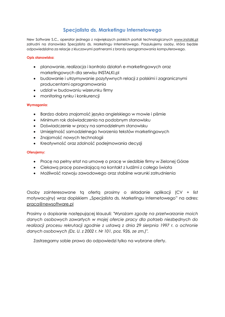 Specjalista ds. Marketingu Internetowego New Software S.C., operator jednego z największych polskich portali technologicznych www.instalki.pl zatrudni na stanowisko Specjalista ds. Marketingu Internetowego. Poszukujemy osoby, która będzie odpowiedzialna za relacje z kluczowymi partnerami z branży oprogramowania komputerowego. Opis stanowiska: planowanie, realizacja i kontrola działań e-marketingowych oraz marketingowych dla serwisu INSTALKI.pl budowanie i utrzymywanie pozytywnych relacji z polskimi i zagranicznymi producentami oprogramowania udział w budowaniu wizerunku firmy monitoring rynku i konkurencji Wymagania: Bardzo dobra znajomość języka angielskiego w mowie i piśmie Minimum rok doświadczenia na podobnym stanowisku Doświadczenie w pracy na samodzielnym stanowisku Umiejętność samodzielnego tworzenia tekstów marketingowych Znajomość nowych technologii Kreatywność oraz zdolność podejmowania decyzji Oferujemy: Pracę na pełny etat na umowę o pracę w siedzibie firmy w Zielonej Górze Ciekawą pracę pozwalającą na kontakt z ludźmi z całego świata Możliwość rozwoju zawodowego oraz stabilne warunki zatrudnienia Osoby zainteresowane tą ofertą prosimy o składanie aplikacji (CV + list motywacyjny) wraz dopiskiem „Specjalista ds. Marketingu Internetowego” na adres: [email protected] Prosimy o dopisanie następującej klauzuli: "Wyrażam zgodę na przetwarzanie moich danych osobowych zawartych w mojej ofercie pracy dla potrzeb niezbędnych do realizacji procesu rekrutacji zgodnie z ustawą z dnia 29 sierpnia 1997 r. o ochronie danych osobowych (Dz. U. z 2002 r. Nr 101, poz. 926, ze zm.)". Zastrzegamy sobie prawo do odpowiedzi tylko na wybrane oferty.
