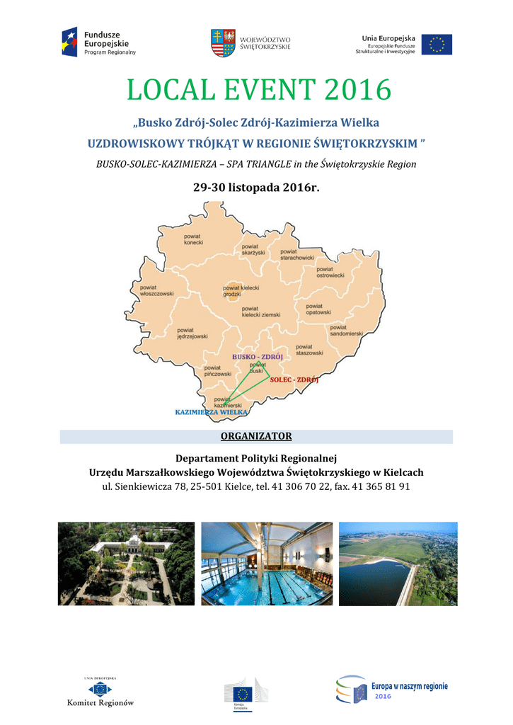 LOCAL EVENT 2016 „Busko Zdrój-Solec Zdrój-Kazimierza Wielka UZDROWISKOWY TRÓJKĄT W REGIONIE ŚWIĘTOKRZYSKIM ” BUSKO-SOLEC-KAZIMIERZA – SPA TRIANGLE in the Świętokrzyskie Region 29-30 listopada 2016r. ORGANIZATOR Departament Polityki Regionalnej Urzędu Marszałkowskiego Województwa Świętokrzyskiego w Kielcach ul. Sienkiewicza 78, 25-501 Kielce, tel. 41 306 70 22, fax. 41 365 81 91 AGENDA 29 listopada 2016 Miejsce konferencji: Centrum Konferencyjne Sanatorium Marconi , ul. 1 Maja, Busko-Zdrój Malinowy Raj, ul. Partyzantów 18 A, Solec-Zdrój 9:00 – 10:30 Wizyta terenowa – Busko-Zdrój: Szpital Uzdrowiskowy „ Krystyna” Sanatorium Włókniarz, Hotel Bristol Art&Medical 10:30-11:00 Rejestracja uczestników Lokalizacja: Centrum Konferencyjne Sanatorium Marconi 11:00-11:20 Rozpoczęcie, powitanie, otwarcie konferencji Adam Jarubas, Marszałek Województwa Świętokrzyskiego Arkadiusz Bąk, Przewodniczący Sejmiku Województwa Świętokrzyskiego Jerzy Kolarz, Starosta Powiatu Busko-Zdrój Waldemar Sikora, Burmistrz miasta Busko-Zdrój 11:20-11:50 Prezentacja wprowadzająca: Grzegorz Orawiec, Dyrektor Departamentu Polityki Regionalnej Urzędu Marszałkowskiego w Kielcach 11:50-12:00 Film prezentujący Powiat Busko Zdrój 12:15-14:00 BUSKO BADEN Rynek niemiecki „Koncepcja Healthy Ageing Senior Villages – wioski przyjazne seniorom” Uwe Klein HCSI (Health Care Strategy International) Germering, Niemcy „Pacjent z Niemiec – jak go zdobyć do świętokrzyskich Uzdrowisk” Uwe Klein HCSI (Health Care Strategy International) Germering, Niemcy Rynek ukraiński 14:00 „Czy tylko polityka wizowa jest problemem we współpracy uzdrowisk w Polsce i na Ukrainie”, Violetta Ianyshevska i Igor Torski – Ukraińskie Stowarzyszenie Turystyki Medycznej, Kijów, Ukraina „Międzynarodowy Instytut Badania Wody w Busku Zdroju – szansa dla Buskowianki i Naftusi”, Violetta Ianyshevska i Igor Torski – Ukraińskie Stowarzyszenie Turystyki Medycznej, Kijów, Ukraina Lunch 15:00-15.30 Przejazd na trasie Busko-Zdrój - Solec-Zdrój (organizator nie zapewnia transportu) 15:30-16:30 Wizyta studyjna – Solec-Zdrój: Wizyta w Uzdrowisku Solec Zdrój, Hotel Malinowy Zdrój, baseny Mineralne 16:30 SOLEC PEKIN Plany rozwoju uzdrowisk w Solcu Zdroju, Wójt Gminy Adam Pałys Rynek azjatycki – możliwości współpracy Dominik Zhang- Beijing Tong 18:00 Ren Tang Poland Podsumowanie współpracy - Uwe Klein, HCSI (Health Care Strategy International) Germering, Niemcy Podsumowanie współpracy - Violetta Ianyshevska i Igor Torski – Ukraińskie Stowarzyszenie Turystyki Medycznej, Kijów, Ukraina Zakończenie konferencji 30 listopada 2016 Miejsce konferencji: Budynek Bursy Międzyszkolnej, ul. Partyzantów 29, Kazimierza Wielka 11:00-12:00 Wizyta terenowa – Kazimierza Wielka: miejsce odwiertu nowego źródła gorącej wody siarczkowej; wizyta na terenach inwestycyjnych 12:00-12:30 Rejestracja uczestników Lokalizacja: Budynek Bursy Międzyszkolnej, ul. Partyzantów 29, Kazimierza Wielka 12:30-12:45 Rozpoczęcie, powitanie, otwarcie konferencji 12:45 KAZIMIERZA – DUBAJ Plany rozwoju ośrodka uzdrowiskowego w Kazimierzy Wielkiej, Jan Nowak - Starosta kazimierski, Koncepcja rozwoju nowopowstałyh ośrodków uzdrowiskowych - Uwe Klein, HCSI (Health Care Strategy International) Germering, Niemcy Prezentacja działalności ukraińskiego stowarzyszenia turystyki medycznej - Violetta Ianyshevska i Igor Torski – Ukraińskie Stowarzyszenie Turystyki Medycznej, Kijów, Ukraina INFRASTRUKTURA DROGOWA, ROZWÓJ LOKALNY I ŚCIEŻKA ROWEROWA Damian Urbanowski – Dyrektor Świętokrzyskiego Zarządu Dróg Wojewódzkich w Kielcach Przedstawiciele jednostek samorządu terytorialnego powiatu Kazimierza Wielka 14:00-14:30 Podsumowanie i zakończenie konferencji