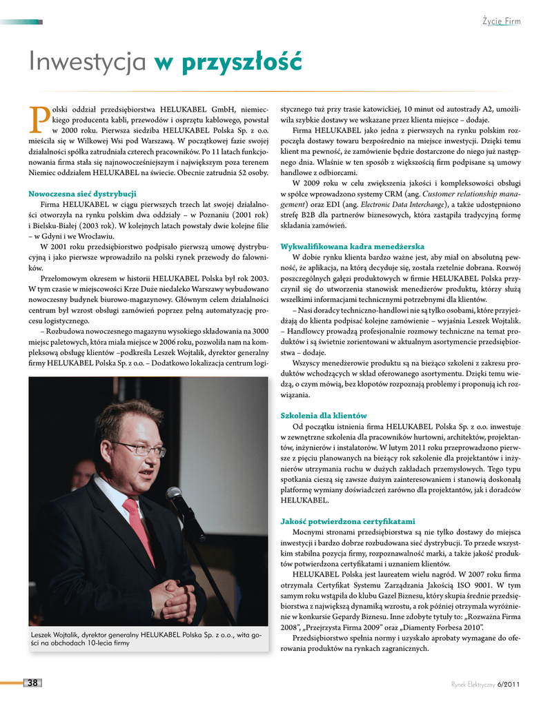 Życie Firm Inwestycja w przyszłość P olski oddział przedsiębiorstwa HELUKABEL GmbH, niemieckiego producenta kabli, przewodów i osprzętu kablowego, powstał w 2000 roku. Pierwsza siedziba HELUKABEL Polska Sp. z o.o. mieściła się w Wilkowej Wsi pod Warszawą. W początkowej fazie swojej działalności spółka zatrudniała czterech pracowników. Po 11 latach funkcjonowania firma stała się najnowocześniejszym i największym poza terenem Niemiec oddziałem HELUKABEL na świecie. Obecnie zatrudnia 52 osoby. Nowoczesna sieć dystrybucji Firma HELUKABEL w ciągu pierwszych trzech lat swojej działalności otworzyła na rynku polskim dwa oddziały – w Poznaniu (2001 rok) i Bielsku-Białej (2003 rok). W kolejnych latach powstały dwie kolejne filie – w Gdyni i we Wrocławiu. W 2001 roku przedsiębiorstwo podpisało pierwszą umowę dystrybucyjną i jako pierwsze wprowadziło na polski rynek przewody do falowników. Przełomowym okresem w historii HELUKABEL Polska był rok 2003. W tym czasie w miejscowości Krze Duże niedaleko Warszawy wybudowano nowoczesny budynek biurowo-magazynowy. Głównym celem działalności centrum był wzrost obsługi zamówień poprzez pełną automatyzację procesu logistycznego. – Rozbudowa nowoczesnego magazynu wysokiego składowania na 3000 miejsc paletowych, która miała miejsce w 2006 roku, pozwoliła nam na kompleksową obsługę klientów –podkreśla Leszek Wojtalik, dyrektor generalny firmy HELUKABEL Polska Sp. z o.o. – Dodatkowo lokalizacja centrum logi- stycznego tuż przy trasie katowickiej, 10 minut od autostrady A2, umożliwiła szybkie dostawy we wskazane przez klienta miejsce – dodaje. Firma HELUKABEL jako jedna z pierwszych na rynku polskim rozpoczęła dostawy towaru bezpośrednio na miejsce inwestycji. Dzięki temu klient ma pewność, że zamówienie będzie dostarczone do niego już następnego dnia. Właśnie w ten sposób z większością firm podpisane są umowy handlowe z odbiorcami. W 2009 roku w celu zwiększenia jakości i kompleksowości obsługi w spółce wprowadzono systemy CRM (ang. Customer relationship management) oraz EDI (ang. Electronic Data Interchange), a także udostępniono strefę B2B dla partnerów biznesowych, która zastąpiła tradycyjną formę składania zamówień. Wykwalifikowana kadra menedżerska W dobie rynku klienta bardzo ważne jest, aby miał on absolutną pewność, że aplikacja, na którą decyduje się, została rzetelnie dobrana. Rozwój poszczególnych gałęzi produktowych w firmie HELUKABEL Polska przyczynił się do utworzenia stanowisk menedżerów produktu, którzy służą wszelkimi informacjami technicznymi potrzebnymi dla klientów. – Nasi doradcy techniczno-handlowi nie są tylko osobami, które przyjeżdżają do klienta podpisać kolejne zamówienie – wyjaśnia Leszek Wojtalik. – Handlowcy prowadzą profesjonalnie rozmowy techniczne na temat produktów i są świetnie zorientowani w aktualnym asortymencie przedsiębiorstwa – dodaje. Wszyscy menedżerowie produktu są na bieżąco szkoleni z zakresu produktów wchodzących w skład oferowanego asortymentu. Dzięki temu wiedzą, o czym mówią, bez kłopotów rozpoznają problemy i proponują ich rozwiązania. Szkolenia dla klientów Od początku istnienia firma HELUKABEL Polska Sp. z o.o. inwestuje w zewnętrzne szkolenia dla pracowników hurtowni, architektów, projektantów, inżynierów i instalatorów. W lutym 2011 roku przeprowadzono pierwsze z pięciu planowanych na bieżący rok szkolenie dla projektantów i inżynierów utrzymania ruchu w dużych zakładach przemysłowych. Tego typu spotkania cieszą się zawsze dużym zainteresowaniem i stanowią doskonałą platformę wymiany doświadczeń zarówno dla projektantów, jak i doradców HELUKABEL. Leszek Wojtalik, dyrektor generalny HELUKABEL Polska Sp. z o.o., wita gości na obchodach 10-lecia firmy 38 Jakość potwierdzona certyfikatami Mocnymi stronami przedsiębiorstwa są nie tylko dostawy do miejsca inwestycji i bardzo dobrze rozbudowana sieć dystrybucji. To przede wszystkim stabilna pozycja firmy, rozpoznawalność marki, a także jakość produktów potwierdzona certyfikatami i uznaniem klientów. HELUKABEL Polska jest laureatem wielu nagród. W 2007 roku firma otrzymała Certyfikat Systemu Zarządzania Jakością ISO 9001. W tym samym roku wstąpiła do klubu Gazel Biznesu, który skupia średnie przedsiębiorstwa z największą dynamiką wzrostu, a rok później otrzymała wyróżnienie w konkursie Gepardy Biznesu. Inne zdobyte tytuły to: „Rozważna Firma 2008”, „Przejrzysta Firma 2009” oraz „Diamenty Forbesa 2010”. Przedsiębiorstwo spełnia normy i uzyskało aprobaty wymagane do oferowania produktów na rynkach zagranicznych. Rynek Elektryczny 6/2011 HELKABEL a OZE W 2010 roku spółka została członkiem Polskiej Izby Gospodarczej Elektrotechniki. W trakcie walnych zgromadzeń PIGE przedstawiciele HELUKABEL Polska wraz z innymi zrzeszonymi omawiają problemy związane z odnawialnymi źródłami energii. Na spotkaniach poruszana jest problematyka terminów powstania w Polsce odpowiednich przepisów, ustaw i dyrektyw związanych z OZE, a także działań, które mogą podjąć firmy z branży kablowej/elektrotechnicznej, aby przyspieszyć ten proces. Przedsiębiorstwo uczestniczy także w pracach Instytutu Energii Odnawialnej. W firmie matce, czyli HELUKABEL GmbH, zainstalowano już na szeroką skalę systemy fotowoltaiczne. W polskiej filii tego typu projekty to jeszcze odległa przyszłość… oby niezbyt daleka. ww Życie Firm o.eu k m e .b w Oprawy świetlówkowe T8 hermetyczne IP65 OHE • statecznik elektroniczny EVG • obudowa ABS klosz PC (poliwęglan) • uchwyty do szybkiego montażu Działalność dydaktyczna Podczas targów AUTOMATICON 2011 firma HELUKABEL Polska nawiązała z kilkoma warszawskimi szkołami współpracę, która będzie polegała na dostarczaniu próbek przewodów, a także prowadzeniu wykładów z zak