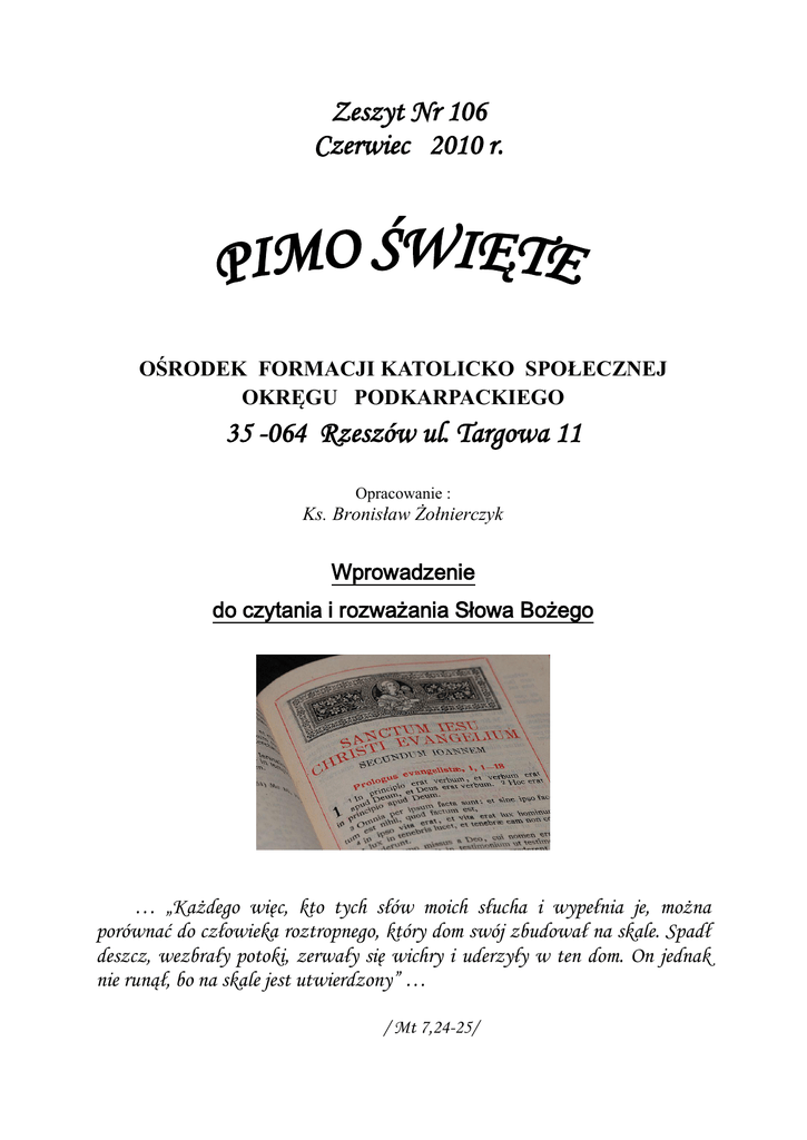 Zeszyt Nr 106 Czerwiec 2010 r. OŚRODEK FORMACJI KATOLICKO SPOŁECZNEJ OKRĘGU PODKARPACKIEGO 35 -064 Rzeszów ul. Targowa 11 Opracowanie : Ks. Bronisław Żołnierczyk Wprowadzenie do czytania i rozważania Słowa Bożego … „Każdego więc, kto tych słów moich słucha i wypełnia je, można porównać do człowieka roztropnego, który dom swój zbudował na skale. Spadł deszcz, wezbrały potoki, zerwały się wichry i uderzyły w ten dom. On jednak nie runął, bo na skale jest utwierdzony” … / Mt 7,24-25/ Pismo święte i Tradycja jako sposoby przekazywania Objawienia w Kościele . Przymierze.... Słowo bardzo modne i często nadużywane. Słyszymy o przymierzach militarnych, politycznych i ekumenicznych. Przymierze, tylko pod postacią, innego słowa występuje w życiu, prywatnym. Jakże często ludzie deklarują sobie wzajemnie przyjaźń, pomoc, współpracę . To też przymierze... Każde jednak ludzkie przymierze ma u podstaw egoizm, dobro własne lub najbliższych. Jest jedno, jedyne, inne przymierze, o którym nam mówi Słowo Boże, przymierze zawarte na fundamencie miłości, braterstwa. Jest to przymierze Boga z ludźmi. Historię tego przymierza przedstawia barwnie Objawienie Boże przekazywane w Kościele przez Pismo św. i Tradycję. I Pismo św. przekaźnikiem Objawienia Bożego, Spośród wielu narodów świata Bóg wybrał najpierw jeden naród i za pośrednictwem Mojżesza zawarł z nim przymierze. Potem zaś przez Jezusa Chrystusa wszedł w przymierze z całym rodzajem ludzkim. Ten fakt Pismo św. określa hebrajskim terminem berit , łać.: testamentum, pol.: przymierze lub testament. Termin ten został rozciągnięty przez Ojców Kościoła na cały zbiór ksiąg Pisma św. Stąd nazwa:, księgi przymierza, księgi testamentu – Nowego i Starego Testamentu. Należy zwrócić uwagę że słowo testament w odniesieniu do Ksiąg Starego i Nowego Przymierza a podkreśla ich Boski autorytet. Księgi św., których pierwszym autorem jest Bóg, są pisanym świadectwem Bożej woli, przekazującym nieomylną zbawczą prawdę Bożą , najbardziej wiarygodną i bezwzględnie wiążącą /por. wypowiedzi św. Hieronima, św. .Augustyna , Tertuliana/. Pismo św. jest Słowem Bożym, jest Objawieniem Boga skierowanym do człowieka. Biblia więc jest księga przede wszystkim Boską, ale jednocześnie głęboko ludzką. Nigdzie bardziej niż w Piśmie św. nie spotykają się prawdy wieczne z doczesnymi, przyziemne z niebieskimi. Żadna też inna księga nie nasuwała przez tak długie wieki i czasy konieczności życia zgodnego z sumieniem ludzkim i wskazaniami Bożymi. Pytamy więc, gdzie należy szukać tej tajemniczej ,wiecznej młodości i aktualności Biblii ? Czym się ona różni od książki codziennie spotykanej ? Skąd pochodzi jedność między tak bardzo różnymi utworami powstałymi w różnych czasach i różnych środowiskach ? Co łączy licznych autorów i korektorów Pisma św. Starego i Nowego Testamentu ? Odpowiedź na te pytania daje nam wspólnota chrześcijańska, a przede wszystkim nauka katolicka twierdząc, że księgi Biblii są święte i kanoniczne ponieważ są napisane pod natchnieniem Ducha św. a zatem Bóg jest autorem głównym tych ksiąg / por. Konst. Soboru Wat. I KO 11/. Z tego stwierdzenia i przekonania wypływa godność Biblii, jej wieczna aktualność i jedność. Przekonanie to umacnia w nas Św. Piotr Apostoł : „ Mamy mocniejszą prorocką mowę i dobrze zrobicie, jeśli będziecie przy niej trwać, jak przy lampce, która świeci w ciemnym pokoju, aż dzień zaświta, gwiazda poranna wzejdzie w sercach waszych. To przede wszystkim miejcie na uwadze, że żadne proroctwo Pisma nie dokonuje się przez prywatne wyjaśnienia. Nie wolą bowiem ludzka, zostało kiedyś przyniesione proroctwo, ale przez Ducha św., unoszeni mówili od Boga święci ludzie " . / 2P1,19-21/. W przytoczonym urywku listu uczy św. Piotr, że wiara w Chrystusa Pana opiera się nie tylko na świadectwie Ojca Niebieskiego, ale także na Piśmie Św. Pismo św. w myśl Księcia Apostołów zostało napisane nie ręką wolą ludzką lecz Bożą. Jeszcze wyraźniejszym świadectwem mówiącym a natchnieniu ksiąg biblijnych jest tekst II listu Św. Pawła do Tymoteusza /3,16/ : „ Wszelkie Pismo od Boga natchnione pożyteczne jest do nauki, do przekonywania, do poprawiania, do kształcenia w sprawiedliwości ". Z pobieżnej analizy powyższych cytatów jasno wynika, że Pismo św. jest Słowem Bożym , listem Boga do ludzi. /por. 00.Kościoła/. 2. Natura natchnienia biblijnego Katolicka nauka o natchnieniu uczy, że głównym i pierwszo -rzędnym autorem , Pisma św. jest Bóg, Księga ta musi więc zawierać w sobie właściwości Autora Głównego. Tą szczególną cechą Pisma wynikającą z Bożego autorstwa jest p r a w d a. Bóg bowiem Jest prawdą : - „Jam jest. drogą, prawdą i życiem” / J 14, 6 / . Prawda wyklucza wszelki formalny błąd logiczny, „ niebo i ziemia przeminą, ale słowa moje nie przeminą " / Łk. 2l,33 Drugim skutkiem natchnienia biblijnego Jest ś w i ę t o ś ć Pisma. Przez świętość, albo moralną szlachetność Biblii rozumiemy zgodność z prawem moralnym sądu autora natchnionego o czynach, słowach i uczuciach osób, które opisuje. Autor wprawdzie może opisywać rzeczy dobre i złe, nie może jednak zła pochwalać, potwierdzać, ani też ganić dobra. Racja tego twierdzenia jest oczywista. Autorem głównym Jest Bóg, który jest świętością, a którego wola jest prawem odwiecznym, źródłem wszelkiej moralności. Nie może więc chwalić zła, a potępiać dobra. Tych kilka myśli okazuje wielkość, a zarazem godność Ksiąg, Pisma św. Nić też dziwnego, że w nauczaniu Kościoła, szczególnie ostatnich czasów tyle zachęty do czytania i rozważania Słowa Bożego zawartego w Piśmie Świętym Starego i Nowego Testamentu. " Tak wielka zaś tkwi w Słowie Bożym moc i potęga - mówi Sobór 