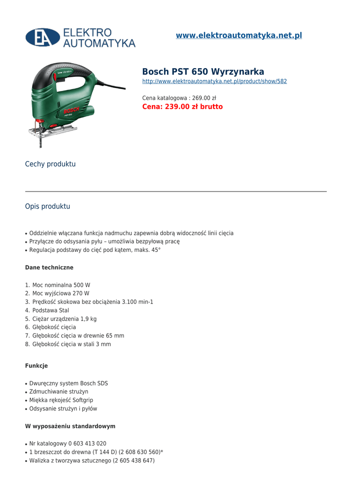 www.elektroautomatyka.net.pl Bosch PST 650 Wyrzynarka http://www.elektroautomatyka.net.pl/product/show/582 Cena katalogowa : 269.00 zł Cena: 239.00 zł brutto Cechy produktu Opis produktu ● ● ● Oddzielnie włączana funkcja nadmuchu zapewnia dobrą widoczność linii cięcia Przyłącze do odsysania pyłu – umożliwia bezpyłową pracę Regulacja podstawy do cięć pod kątem, maks. 45° Dane techniczne 1. 2. 3. 4. 5. 6. 7. 8. Moc nominalna 500 W Moc wyjściowa 270 W Prędkość skokowa bez obciążenia 3.100 min-1 Podstawa Stal Ciężar urządzenia 1,9 kg Głębokość cięcia Głębokość cięcia w drewnie 65 mm Głębokość cięcia w stali 3 mm Funkcje ● ● ● ● Dwuręczny system Bosch SDS Zdmuchiwanie strużyn Miękka rękojeść Softgrip Odsysanie strużyn i pyłów W wyposażeniu standardowym ● ● ● Nr katalogowy 0 603 413 020 1 brzeszczot do drewna (T 144 D) (2 608 630 560)* Walizka z tworzywa sztucznego (2 605 438 647) ● * Do kupienia tylko w zestawach 3-częściowych ELEKTRO-AUTOMATYKA Sprzedaż elektronarzędzi, urządzeń spawalniczych, maszyn budowlanych, pneumatyki, narzędzi warsztatowych, firmowych ubrań roboczych oraz maszyn ogrodowo leśnych. Sklep Bochnia ul. Brzeska 50 32-700 Bochnia Sklep Brzesko ul. Szarych Szeregów 23 32-800 Brzesko Serwis, Magazyn ul. Św. Brata Alberta 4 32-800 Brzesko tel. 691 572 333 e-mail: [email protected] tel. 609 523 230 e-mail: [email protected] tel. 609 523 645 e-mail: [email protected]