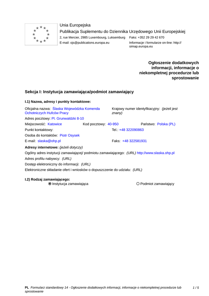 Unia Europejska Publikacja Suplementu do Dziennika Urzędowego Unii Europejskiej 2, rue Mercier, 2985 Luxembourg, Luksemburg Faks: +352 29 29 42 670 E-mail: [email protected] Informacje i formularze on-line: http:// simap.europa.eu Ogłoszenie dodatkowych informacji, informacje o niekompletnej procedurze lub sprostowanie Sekcja I: Instytucja zamawiająca/podmiot zamawiający I.1) Nazwa, adresy i punkty kontaktowe: Oficjalna nazwa: Ślaska Wojewódzka Komenda Ochotniczych Hufców Pracy Krajowy numer identyfikacyjny: (jeżeli jest znany) _____ Adres pocztowy: Pl. Grunwaldzki 8-10 Miejscowość: Katowice Kod pocztowy: 40-950 Punkt kontaktowy: _____ Państwo: Polska (PL) Tel.: +48 322090863 Osoba do kontaktów: Piotr Osysek E-mail: [email protected] Faks: +48 322581931 Adresy internetowe: (jeżeli dotyczy) Ogólny adres instytucji zamawiającej/ podmiotu zamawiającego: (URL) http://www.slaska.ohp.pl Adres profilu nabywcy: (URL) _____ Dostęp elektroniczny do informacji: (URL) _____ Elektroniczne składanie ofert i wniosków o dopuszczenie do udziału: (URL) _____ I.2) Rodzaj zamawiającego: Instytucja zamawiająca Podmiot zamawiający PL Formularz standardowy 14 - Ogłoszenie dodatkowych informacji, informacje o niekompletnej procedurze lub sprostowanie 1/5 Sekcja II: Przedmiot zamówienia II.1.1) Nazwa nadana zamówieniu: Organizacja i przeprowadzenie kursu prawa jazdy dla uczestników projektu "Równi na rynku pracy" II.1.2) Krótki opis zamówienia lub zakupu: (podano w pierwotnym ogłoszeniu) Przedmiotem zamówienia jest organizacja i przeprowadzenie kursów prawa jazdy kategorii B dla uczestników projektu „Równi na rynku pracy” współfinansowanego ze środków Unii Europejskiej w ramach Europejskiego Funduszu Społecznego z podziałem na 8 części. Ilość uczestników projektu: nie więcej niż 114 osób, Podział na części: Część 1. Organizacja i przeprowadzenie kursu prawa jazdy dla uczestników projektu wdrażanego przez Centrum Edukacji i Pracy Młodzieży OHP w Katowicach w następujących lokalizacjach: Katowice – 30 osób (podział na co najmniej 2 grupy szkoleniowe)/ Część 2. Organizacja i przeprowadzenie kursu prawa jazdy dla uczestników projektu wdrażanego przez Centrum Edukacji i Pracy Młodzieży OHP w Katowicach w następujących lokalizacjach: Wodzisław Śląski – 12 osób. Część 3. Organizacja i przeprowadzenie kursu prawa jazdy dla uczestników projektu wdrażanego przez Centrum Edukacji i Pracy Młodzieży OHP w Katowicach w następujących lokalizacjach: Radzionków – 6 osób. Część 4. Organizacja i przeprowadzenie kursu prawa jazdy dla uczestników projektu wdrażanego przez Centrum Edukacji i Pracy Młodzieży OHP w Bielsku-Białej w następujących lokalizacjach: Bielsko-Biała – 10 osób. Część 5. Organizacja i przeprowadzenie kursu prawa jazdy dla uczestników projektu wdrażanego przez Centrum Edukacji i Pracy Młodzieży OHP w Bielsku-Białej w następujących lokalizacjach: Cieszyn – 10 osób. Część 6. Organizacja i przeprowadzenie kursu prawa jazdy dla uczestników projektu wdrażanego przez Centrum Edukacji i Pracy Młodzieży OHP w Bielsku-Białej w następujących lokalizacjach: Żywiec – 10 osób. Część 7. Organizacja i przeprowadzenie kursu prawa jazdy dla uczestników projektu wdrażanego przez Centrum Edukacji i Pracy Młodzieży OHP w Częstochowie w następujących lokalizacjach: Częstochowa – 27 osób (w podziale na co najmniej 2 grupy szkoleniowe). Część 8. Organizacja i przeprowadzenie kursu prawa jazdy dla uczestników projektu wdrażanego przez Centrum Edukacji i Pracy Młodzieży OHP w Częstochowie w następujących lokalizacjach: Myszków – 9 osób. Celem kursu jest przygotowanie osób starających się o prawo jazdy kategorii B do kierowania odpowiednimi dla tej kategorii pojazdami w sposób niezagrażający bezpieczeństwu i porządkowi ruchu, poprzez nabycie umiejętności teoretycznych (przepisy ruchu drogowego, zasady udzielania pierwszej pomocy itp.) oraz praktycznych (praktyczna nauka jazdy) niezbędnych do zdania egzaminu państwowego i uzyskania prawa jazdy kat. II.1.3) Wspólny Słownik Zamówień (CPV) Główny przedmiot Dodatkowe przedmioty Słownik główny 80411200 80530000 Słownik uzupełniający (jeżeli dotyczy) PL Formularz standardowy 14 - Ogłoszenie dodatkowych informacji, informacje o niekompletnej procedurze lub sprostowanie 2/5 Sekcja IV: Procedura IV.1)Rodzaj procedury (podano w pierwotnym ogłoszeniu) Otwarta Ograniczona Ograniczona przyspieszona Negocjacyjna Negocjacyjna przyspieszona Dialog konkurencyjny Negocjacyjna z uprzednim ogłoszeniem Negocjacyjna bez uprzedniego ogłoszenia Negocjacyjna z publikacją ogłoszenia o zamówieniu Negocjacyjna bez publikacji ogłoszenia o zamówieniu Udzielenie zamówienia bez uprzedniej publikacji ogłoszenia o zamówieniu w Dzienniku Urzędowym Unii Europejskiej IV.2)Informacje administracyjne IV.2.1)Numer referencyjny: (podano w pierwotnym ogłoszeniu) 25/GM/RRP/ŚWK/PJ/2015 IV.2.2)Dane referencyjne ogłoszenia w przypadku ogłoszeń przesłanych drogą elektroniczną: Pierwotne ogłoszenie przesłane przez eNotices TED eSender Login: ENOTICES_SlaskaOHP Dane referencyjne ogłoszenia: 2015-012518 rok i numer dokumentu IV.2.3)Ogłoszenie, którego dotyczy niniejsza publikacja: Numer ogłoszenia w Dz.U.: 2015/S 022-036030 z dnia: 31/01/2015 (dd/mm/rrrr) IV.2.4)Data wysłania pierwotnego ogłoszenia: 28/01/2015 (dd/mm/rrrr) PL Formularz standardowy 14 - Ogłoszenie dodatkowych informacji, informacje o niekompletnej procedurze lub sprostowanie 3/5 Sekcja VI: Informacje uzupełniające VI.1) Ogłoszenie dotyczy: Procedury niepełnej Sprostowania Informacji dodatkowych VI.2) Informacje na temat niepełnej procedury udzielenia zamówienia: Postępowanie o udzielenie zamówienia zostało przerwane Postępowanie o udzielenie zamówienia uznano za nieskuteczne Zamówienia nie udzielono Zamówienie może być przedmiotem ponownej pu