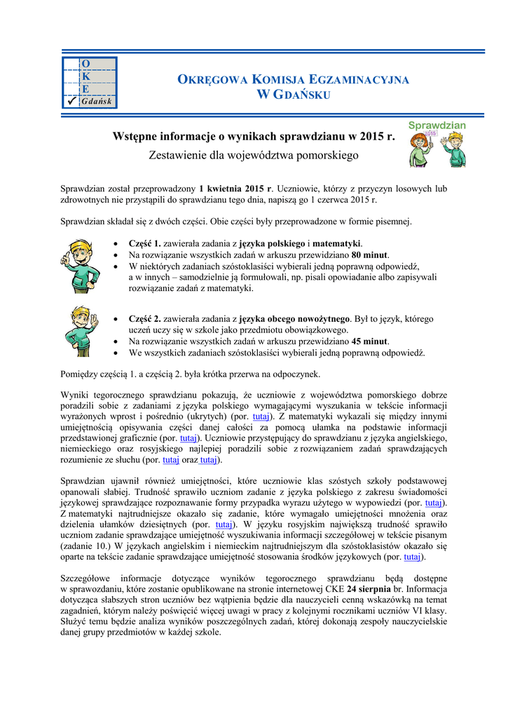 O K E OKRĘGOWA KOMISJA EGZAMINACYJNA W G DAŃSKU G dańsk Wstępne informacje o wynikach sprawdzianu w 2015 r. Zestawienie dla województwa pomorskiego Sprawdzian został przeprowadzony 1 kwietnia 2015 r. Uczniowie, którzy z przyczyn losowych lub zdrowotnych nie przystąpili do sprawdzianu tego dnia, napiszą go 1 czerwca 2015 r. Sprawdzian składał się z dwóch części. Obie części były przeprowadzone w formie pisemnej. Część 1. zawierała zadania z języka polskiego i matematyki. Na rozwiązanie wszystkich zadań w arkuszu przewidziano 80 minut. W niektórych zadaniach szóstoklasiści wybierali jedną poprawną odpowiedź, a w innych – samodzielnie ją formułowali, np. pisali opowiadanie albo zapisywali rozwiązanie zadań z matematyki. Część 2. zawierała zadania z języka obcego nowożytnego. Był to język, którego uczeń uczy się w szkole jako przedmiotu obowiązkowego. Na rozwiązanie wszystkich zadań w arkuszu przewidziano 45 minut. We wszystkich zadaniach szóstoklasiści wybierali jedną poprawną odpowiedź. Pomiędzy częścią 1. a częścią 2. była krótka przerwa na odpoczynek. Wyniki tegorocznego sprawdzianu pokazują, że uczniowie z województwa pomorskiego dobrze poradzili sobie z zadaniami z języka polskiego wymagającymi wyszukania w tekście informacji wyrażonych wprost i pośrednio (ukrytych) (por. tutaj). Z matematyki wykazali się między innymi umiejętnością opisywania części danej całości za pomocą ułamka na podstawie informacji przedstawionej graficznie (por. tutaj). Uczniowie przystępujący do sprawdzianu z języka angielskiego, niemieckiego oraz rosyjskiego najlepiej poradzili sobie z rozwiązaniem zadań sprawdzających rozumienie ze słuchu (por. tutaj oraz tutaj). Sprawdzian ujawnił również umiejętności, które uczniowie klas szóstych szkoły podstawowej opanowali słabiej. Trudność sprawiło uczniom zadanie z języka polskiego z zakresu świadomości językowej sprawdzające rozpoznawanie formy przypadka wyrazu użytego w wypowiedzi (por. tutaj). Z matematyki najtrudniejsze okazało się zadanie, które wymagało umiejętności mnożenia oraz dzielenia ułamków dziesiętnych (por. tutaj). W języku rosyjskim największą trudność sprawiło uczniom zadanie sprawdzające umiejętność wyszukiwania informacji szczegółowej w tekście pisanym (zadanie 10.) W językach angielskim i niemieckim najtrudniejszym dla szóstoklasistów okazało się oparte na tekście zadanie sprawdzające umiejętność stosowania środków językowych (por. tutaj). Szczegółowe informacje dotyczące wyników tegorocznego sprawdzianu będą dostępne w sprawozdaniu, które zostanie opublikowane na stronie internetowej CKE 24 sierpnia br. Informacja dotycząca słabszych stron uczniów bez wątpienia będzie dla nauczycieli cenną wskazówką na temat zagadnień, którym należy poświęcić więcej uwagi w pracy z kolejnymi rocznikami uczniów VI klasy. Służyć temu będzie analiza wyników poszczególnych zadań, której dokonają zespoły nauczycielskie danej grupy przedmiotów w każdej szkole. *** Poniżej przedstawiamy podstawowe dane statystyczne dotyczące wyników sprawdzianu w 2015 r. oraz przykładowe zadania z obu części wraz z krótkim ich omówieniem. Zadania zostały wybrane tak, aby zilustrować umiejętności, które szóstoklasiści opanowali dobrze lub bardzo dobrze, oraz takie, które opanowali słabiej. Do sprawdzianu przystąpiło 22 171 uczniów spośród 22 346 zgłoszonych uczniów VI klasy szkoły podstawowej z województwa pomorskiego (99%). W TABELI 1. przedstawiono liczbę piszących, którzy rozwiązywali zadania w arkuszu w wersji standardowej oraz w arkuszach dostosowanych do potrzeb uczniów z autyzmem, w tym z zespołem Aspergera, niewidzących i słabowidzących, niesłyszących i słabosłyszących oraz z upośledzeniem umysłowym w stopniu lekkim. TABELA 1. LICZBA UCZNIÓW Z WOJEWÓDZTWA, KTÓRZY PRZYSTĄPILI DO SPRAWDZIANU W KWIETNIU 2015 R. Część sprawdzianu Część 1. Część 2. Zestaw zadań w wersji standardowej dostosowanej Razem 21 577 594 22 171 Język angielski 20 799 513 21 312 Język francuski 1 0 1 Język hiszpański 0 0 0 Język niemiecki 745 76 821 Język rosyjski 31 0 31 Język włoski 0 0 0 Pozostali uczniowie przystąpią do sprawdzianu w czerwcu br. albo są zwolnieni z obowiązku przystąpienia do sprawdzianu na warunkach określonych w rozporządzeniu Ministra Edukacji Narodowej1. Zadania we wszystkich arkuszach sprawdzały, w jakim stopniu szóstoklasiści spełniają wymagania ogólne i szczegółowe z zakresu trzech przedmiotów egzaminacyjnych, określone w podstawie programowej kształcenia ogólnego dla II etapu edukacyjnego. Poszczególne zadania w arkuszach egzaminacyjnych mogły również – w myśl zasady kumulatywności przyjętej w podstawie – odnosić się do wymagań przypisanych do I etapu edukacyjnego. W TABELI 2. przedstawiono podstawowe informacje dotyczące formatu arkuszy w obu częściach sprawdzianu. 1 Rozporządzenie Ministra Edukacji Narodowej z dnia 30 kwietnia 2007 r. w sprawie warunków i sposobu oceniania, klasyfikowania i promowania uczniów i słuchaczy oraz przeprowadzania sprawdzianów i egzaminów w szkołach publicznych (DzU Nr 83, poz. 562, ze zm.). 2 TABELA 2. FORMAT ARKUSZY EGZAMINACYJNYCH SPRAWDZIANU W 2015 R. Część sprawdzianu Część 1. Zadania z języka polskiego i matematyki Część 2. Zadania z języka obcego nowożytnego Krótka charakterystyka arkusza egzaminacyjnego Arkusz standardowy zawierał 22 zadania zamknięte, w tym 11 zadań z języka polskiego i 11 zadań z matematyki, oraz 5 zadań otwartych, w tym 2 zadania z języka polskiego i 3 zadania z matematyki. Wśród zadań zamkniętych dominowały zadania wyboru wielokrotnego, w których uczeń wybierał jedną z podanych odpowiedzi. Były także zadania, które miały inną formę, np. typu prawda-fałsz, na dobieranie oraz zadania, w których uczeń musiał u