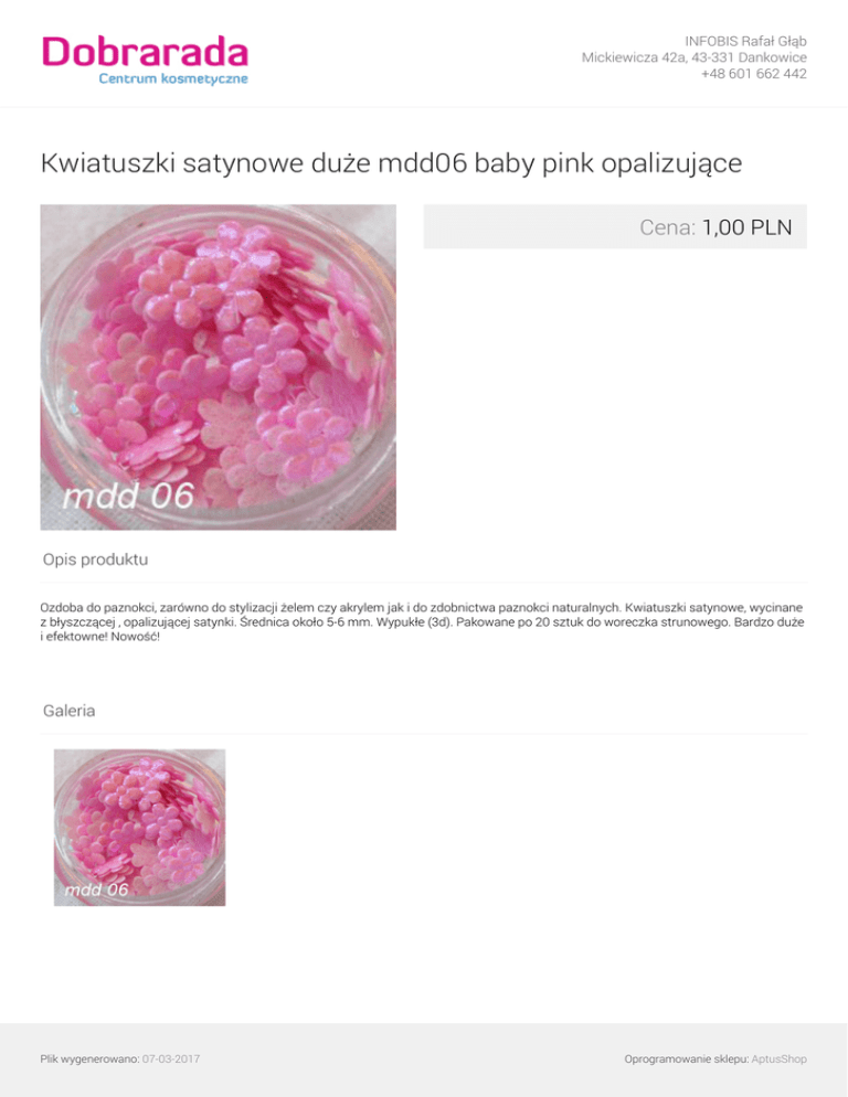 INFOBIS Rafał Głąb Mickiewicza 42a, 43-331 Dankowice +48 601 662 442 Kwiatuszki satynowe duże mdd06 baby pink opalizujące Cena: 1,00 PLN Opis produktu Ozdoba do paznokci, zarówno do stylizacji żelem czy akrylem jak i do zdobnictwa paznokci naturalnych. Kwiatuszki satynowe, wycinane z błyszczącej , opalizującej satynki. Średnica około 5-6 mm. Wypukłe (3d). Pakowane po 20 sztuk do woreczka strunowego. Bardzo duże i efektowne! Nowość! Galeria Plik wygenerowano: 07-03-2017 Powered by TCPDF (www.tcpdf.org) Oprogramowanie sklepu: AptusShop