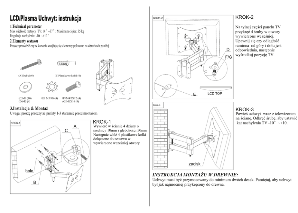 LCD/Plasma Uchwyt: instrukcja KROK-2 KROK-2 1.Technical parameter Max wielkość matrycy TV: 14″~37″; Maximum ciężar: 35 kg Regulacja nachylenia: -10 ~+10 ° 2.Elementy zestawu Proszę sprawdzić czy w kartonie znajdują się elementy pokazane na obrazkach poniżej D F/G (A)Śrubki (6) (B)Plastikowe kołki (6) E (E) M5/M6(4) (C)M6 (10) (D)M5 (4) Na tylnej części panelu TV przykręć 4 śruby w otwory wywiercone wcześniej. Upewnij się czy odległość ramiona od góry i dołu jest odpowiednia, następnie wyśrodkuj pozycję TV. LCD TOP (F)M4/5X12 (4) (G)M6X16 (4) krok-3 3.Instalacja & Montaż KROK-3 Uwaga: proszę przeczytać punkty 1-3 starannie przed montażem Powieś uchwyt wraz z telewizorem na ścianę. Odkręć śrubę, aby ustawić kąt nachylenia TV -10°~+10. KROK-1 KROK-1 A C Wywierć w ścianie 4 dziury o średnicy 10mm i głębokości 50mm Następnie włóż 4 plastikowe kołki dołączone do zestawu w wywiercone wcześniej otwory zacisk hole INSTRUKCJA MONTAŻU W DREWNIE: B Uchwyt musi być przymocowany do minimum dwóch desek. Pamiętaj, aby uchwyt był jak najmocniej przykręcony do drewna.