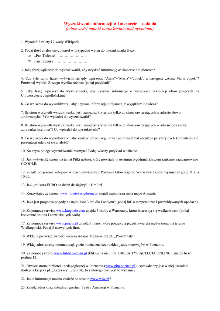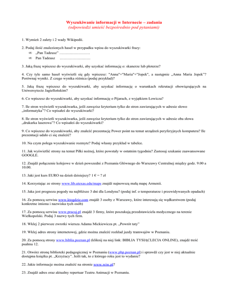 Wyszukiwanie informacji w Internecie – zadania (odpowiedzi umieść bezpośrednio pod pytaniami) 1. Wymień 2 zalety i 2 wady Wikipedii. 2. Podaj ilość znalezionych haseł w przypadku wpisu do wyszukiwarki frazy: • „Pan Tadeusz” …………………… • Pan Tadeusz …………………… 3. Jaką frazę wpiszesz do wyszukiwarki, aby uzyskać informację o: skanerze lub ploterze? 4. Czy tyle samo haseł wyświetli się gdy wpiszesz: "Anna"+"Maria"+"Jopek", a następnie „Anna Maria Jopek”? Porównaj wyniki. Z czego wynika różnica (podaj przykład)? 5. Jaką frazę wpiszesz do wyszukiwarki, aby uzyskać informację o warunkach rekrutacji obowiązujących na Uniwersytecie Jagiellońskim? 6. Co wpiszesz do wyszukiwarki, aby uzyskać informację o Pijarach, z wyjątkiem Łowicza? 7. Ile stron wyświetli wyszukiwarka, jeśli zawęzisz kryterium tylko do stron zawierających w adresie słowo „informatyka”? Co wpisałeś do wyszukiwarki? 8. Ile stron wyświetli wyszukiwarka, jeśli zawęzisz kryterium tylko do stron zawierających w adresie oba słowa „drukarka laserowa”? Co wpisałeś do wyszukiwarki? 9. Co wpiszesz do wyszukiwarki, aby znaleźć prezentację Power point na temat urządzeń peryferyjnych komputera? Ile prezentacji udało ci się znaleźć? 10. Na czym polega wyszukiwanie rozmyte? Podaj własny przykład w tabelce. 11. Jak wyświetlić strony na temat Piłki nożnej, które powstały w ostatnim tygodniu? Zastosuj szukanie zaawansowane GOOGLE. 12. Znajdź połączenie kolejowe w dzień powszedni z Poznania Głównego do Warszawy Centralnej między godz. 9.00 a 10.00. 13. Jaki jest kurs EURO na dzień dzisiejszy? 1 € = ? zł 14. Korzystając ze strony www.lib.utexas.edu/maps znajdź najnowszą małą mapę Armenii. 15. Jaka jest prognoza pogody na najbliższe 3 dni dla Londynu? (podaj inf. o temperaturze i przewidywanych opadach) 16. Za pomocą serwisu www.ktogdzie.com znajdź 3 osoby z Warszawy, które interesują się wędkarstwem (podaj konkretne imiona i nazwiska tych osób) 17. Za pomocą serwisu www.pracuj.pl znajdź 3 firmy, które poszukują przedstawiciela medycznego na terenie Wielkopolski. Podaj 3 nazwy tych firm. 18. Wklej 2 pierwsze zwrotki wiersza Adama Mickiewicza pt. „Powrót taty” 19. Wklej adres strony internetowej, gdzie można znaleźć rozkład jazdy tramwajów w Poznaniu. 20. Za pomocą strony www.biblia.poznan.pl (kliknij na niej link: BIBLIA TYSIĄCLECIA ONLINE), znajdź treść psalmu 12. 21. Otwórz stronę biblioteki pedagogicznej w Poznaniu (www.pbp.poznan.pl) i sprawdź czy jest w niej aktualnie dostępna książka pt. „Krzyżacy”. Jeśli tak, to z którego roku jest to wydanie? 22. Jakie informacje można znaleźć na stronie www.wiw.pl? 23. Znajdź adres oraz aktualny repertuar Teatru Animacji w Poznaniu. 24. Znajdź informację ile kosztuje roczna karta wstępu do nowego ZOO w Poznaniu. 25. Jakie składniki są konieczne, aby upiec Rogale Marcińskie? 26. Ile nokturnów napisał Fryderyk Chopin? 27. Co to jest Sound Blaster? 28. Na którym miejscu w światowym rankingu (wg ruchu pasażerskiego) plasuje się lotnisko w Madrycie? 29. Do czego służy wyszukiwarka GOOGLE SCHOLAR? Jaki jest jej dokładny adres? 30. Korzystając z serwisu Edycji Paulińskiej www.edycja.pl i klikając link GRATISY wyślij kartkę do przyjaciela.