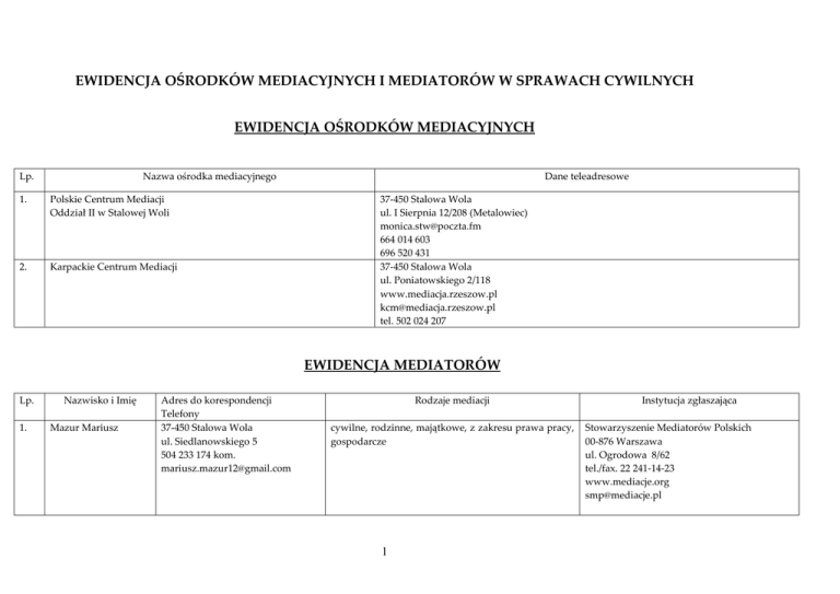 EWIDENCJA OŚRODKÓW MEDIACYJNYCH I MEDIATORÓW W SPRAWACH CYWILNYCH EWIDENCJA OŚRODKÓW MEDIACYJNYCH Lp. Nazwa ośrodka mediacyjnego 1. Polskie Centrum Mediacji Oddział II w Stalowej Woli 2. Karpackie Centrum Mediacji Dane teleadresowe 37-450 Stalowa Wola ul. I Sierpnia 12/208 (Metalowiec) [email protected] 664 014 603 696 520 431 37-450 Stalowa Wola ul. Poniatowskiego 2/118 www.mediacja.rzeszow.pl [email protected] tel. 502 024 207 EWIDENCJA MEDIATORÓW Lp. 1. Nazwisko i Imię Mazur Mariusz Adres do korespondencji Telefony 37-450 Stalowa Wola ul. Siedlanowskiego 5 504 233 174 kom. [email protected] Rodzaje mediacji cywilne, rodzinne, majątkowe, z zakresu prawa pracy, gospodarcze 1 Instytucja zgłaszająca Stowarzyszenie Mediatorów Polskich 00-876 Warszawa ul. Ogrodowa 8/62 tel./fax. 22 241-14-23 www.mediacje.org [email protected] 2. Śliwa Jerzy 31-935 Kraków os. Handlowe 1 lok. 65 12 642 12 30 601 637 984 kom. cywilne, z zakresu prawa pracy, gospodarcze 3. Gadzalska Anna 39-400 Tarnobrzeg ul. E. Orzeszkowej 4 m. 20 691 370 090 kom. cywilne, rodzinne, gospodarcze 4. Markowska – Rzeźnik Jolanta 39-300 Mielec ul. Kocjana 11 m. 4 17 585 20 30 502 305 094 kom. fax.17 788 85 71 cywilne, rodzinne 5. Tomczyk Iwona 39-300 Mielec ul. Dworcowa 10 m. 5 504 023 825 kom. cywilne, rodzinne 6. Adamus Przemysław 03-893 Warszawa ul. Bukowiecka 92 502 262 562 kom. [email protected] cywilne, rodzinne, gospodarcze 7. Błotnicki Tomasz 02-972 Warszawa ul. Teodorowicza 3/19 667 625 655 kom. [email protected] cywilne, rodzinne, gospodarcze, pracy 2 z zakresu prawa pracy, Stowarzyszenie Mediatorów Polskich 00-876 Warszawa ul. Ogrodowa 8/62 tel./fax. 22 241-14-23 www.mediacje.org [email protected] Stowarzyszenie Mediatorów Polskich 00-876 Warszawa ul. Ogrodowa 8/62 tel./fax. 22 241-14-23 www.mediacje.org [email protected] Stowarzyszenie Mediatorów Polskich 00-876 Warszawa ul. Ogrodowa 8/62 tel./fax. 22 241-14-23 www.mediacje.org [email protected] Stowarzyszenie Mediatorów Polskich 00-876 Warszawa ul. Ogrodowa 8/62 tel./fax. 22 241-14-23 www.mediacje.org [email protected] Krajowy Sąd Arbitrażowy 03-893 Warszawa, ul. Bukowiecka 92 Krajowy Sąd Arbitrażowy 03-893 Warszawa, ul. Bukowiecka 92 8. Cyranowska Lidia 9. Czepik Aleksiej 10. Dorenbos Edyta 11. Gałęzowski Tomasz 12. Główka Joanna 13. Hatłas Szymon 14. Jagodziński Paweł 01-673 Warszawa ul. Podleśna 38 lok. 38 694 852 388 kom. [email protected] 03-893 Warszawa ul. Bukowiecka 92 608 044 733 kom. [email protected] De Koeldert 27A NL-4181 CJ Waardenburg Holandia 0031 641 139 961 [email protected] 20-607 Lublin Dom Kultury LSM ul. K. Wallenroda 4a 519 198 417 kom. [email protected] 37-450 Stalowa Wola Al. Jana Pawła II 25A p. 603 530 856 182 kom. [email protected] 03-893 Warszawa ul. Bukowiecka 92 608 159 867 kom. [email protected] Suisse Legiste Sp. z o.o. 01-850 Warszawa ul. Lucjana Rydla 52A 601 444 283 kom. [email protected] cywilne, rodzinne, gospodarcze Krajowy Sąd Arbitrażowy 03-893 Warszawa, ul. Bukowiecka 92 cywilne, rodzinne, gospodarcze Krajowy Sąd Arbitrażowy 03-893 Warszawa, ul. Bukowiecka 92 cywilne, gospodarcze, finansowe Krajowy Sąd Arbitrażowy 03-893 Warszawa, ul. Bukowiecka 92 cywilne, rodzinne, gospodarcze Krajowy Sąd Arbitrażowy 03-893 Warszawa, ul. Bukowiecka 92 cywilne, rodzinne, gospodarcze, pracy Krajowy Sąd Arbitrażowy 03-893 Warszawa, ul. Bukowiecka 92 cywilne, gospodarcze Krajowy Sąd Arbitrażowy 03-893 Warszawa, ul. Bukowiecka 92 cywilne, rodzinne, gospodarcze Krajowy Sąd Arbitrażowy 03-893 Warszawa, ul. Bukowiecka 92 3 15. Janicki Piotr 16. Jastrzębska Marta 17. Kaliszczak – Stępień Aleksandra 18. Kamieńska Joanna 19. Kamiński Jarosław 20. Kaźmierczak Wioletta 659 Navaho Trail Drive Franklin Lakes, NJ 07417, USA 001 646 286 4948 [email protected] 01-019 Warszawa ul. Nowolipki 14/105 602 254 882 kom. [email protected] 78-400 Szczecinek ul. Kołobrzeska 24D/7 517 900 462 kom. [email protected] Kancelaria Radców Prawnych S.C. 15-084 Białystok ul. E. Orzeszkowej 32/502 606 885 885 kom. [email protected] 02-691 Warszawa Kamiński & Gawłowska Adwokaci i Radcowie Prawni ul. Obrzeżna 5 (budynek Park Projekt Group) 609 652 649 kom. [email protected] 03-893 Warszawa ul. Bukowiecka 92 601 699 317 kom. [email protected] cywilne, rodzinne, gospodarcze Krajowy Sąd Arbitrażowy 03-893 Warszawa, ul. Bukowiecka 92 cywilne, gospodarcze Krajowy Sąd Arbitrażowy 03-893 Warszawa, ul. Bukowiecka 92 cywilne, rodzinne Krajowy Sąd Arbitrażowy 03-893 Warszawa, ul. Bukowiecka 92 cywilne, rodzinne, gospodarcze Krajowy Sąd Arbitrażowy 03-893 Warszawa, ul. Bukowiecka 92 cywilne, rodzinne, gospodarcze, pracy Krajowy Sąd Arbitrażowy 03-893 Warszawa, ul. Bukowiecka 92 cywilne, rodzinne, gospodarcze, nieruchomości Krajowy Sąd Arbitrażowy 03-893 Warszawa, ul. Bukowiecka 92 4 21. Kluska Michał 00-838 Warszawa Kancelaria Olesiński i Wspólnicy Prosta Tower XVI piętro ul. Prosta 32 662 190 844 kom. [email protected] 03-893 Warszawa ul. Bukowiecka 92 607 224 937 kom. [email protected] Kancelaria Radcy Prawnego 00-695 Warszawa ul. Nowogrodzka 42 lok. 15 603 794 218 kom. m.szydelska@ mediacje.waw.pl cywilne, rodzinne, gospodarcze, pracy Krajowy Sąd Arbitrażowy 03-893 Warszawa, ul. Bukowiecka 92 22. Kowalska Anna cywilne, gospodarcze, pracy Krajowy Sąd Arbitrażowy 03-893 Warszawa, ul. Bukowiecka 92 23. Kucharska Szydelska Małgorzata cywilne, rodzinne, gospodarcze Krajowy Sąd Arbitrażowy 03-893 Warszawa, ul. Bukowiecka 92 24. Lenarczyk Michał Kancelaria Prawnicza Lenar & Lawyers Adwokat Michał Lenarczyk 00-561 Warszawa ul. Mokotowska 14 p. 707 508 164 678 kom. [email protected] cywilne, rodzinne, gospodarcze Krajowy Sąd Arbitrażowy 03-893 Warszawa, ul. Bukowiecka 92 25. Lenart Tomasz cywilne, gospodarcze, pracy Krajowy Sąd Arbitrażowy 03-893 Warszawa, ul. Bukowiecka 92 26. Magdziarczyk Małgorzata Kancelaria Radcy Prawnego 30-304 Kraków ul. Zduńska 18/1 604 062 174 kom. [email protected] Kancelari
