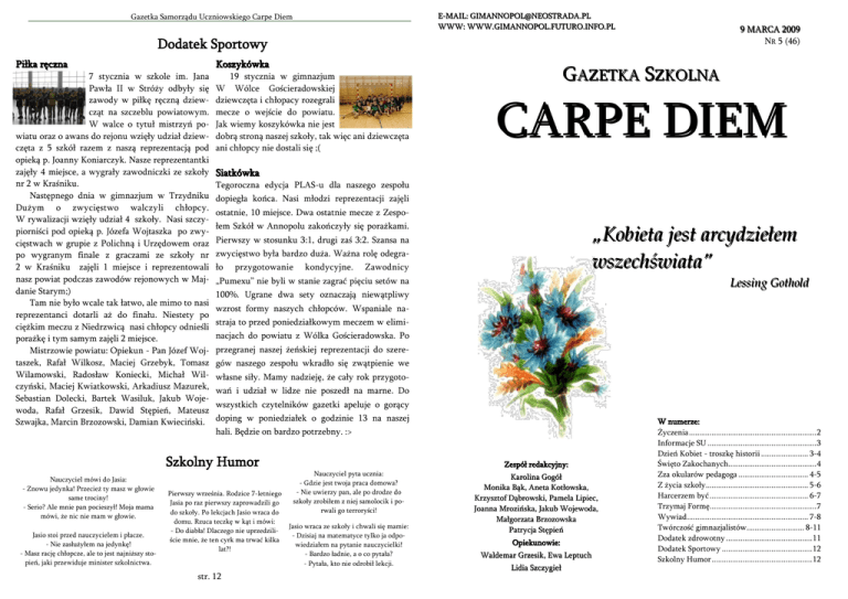E-MAIL: [email protected] GIMANNOPOL@NEOSTRADA Gazetka.PL Samorządu Uczniowskiego Carpe Diem WWW: WWW.GIMANNOPOL.FUTURO.INFO.PL WWW.GIMANNOPOL.FUTURO.INFO.PL Gazetka Samorządu Uczniowskiego Carpe Diem Dodatek Sportowy Piłka ręczna Koszykówka 7 stycznia w szkole im. Jana Pawła II w Stróży odbyły się zawody w piłkę ręczną dziewcząt na szczeblu powiatowym. W walce o tytuł mistrzyń powiatu oraz o awans do rejonu wzięły udział dziewczęta z 5 szkół razem z naszą reprezentacją pod opieką p. Joanny Koniarczyk. Nasze reprezentantki zajęły 4 miejsce, a wygrały zawodniczki ze szkoły nr 2 w Kraśniku. Następnego dnia w gimnazjum w Trzydniku Dużym o zwycięstwo walczyli chłopcy. W rywalizacji wzięły udział 4 szkoły. Nasi szczypiorniści pod opieką p. Józefa Wojtaszka po zwycięstwach w grupie z Polichną i Urzędowem oraz po wygranym finale z graczami ze szkoły nr 2 w Kraśniku zajęli 1 miejsce i reprezentowali nasz powiat podczas zawodów rejonowych w Majdanie Starym;) Tam nie było wcale tak łatwo, ale mimo to nasi reprezentanci dotarli aż do finału. Niestety po ciężkim meczu z Niedrzwicą nasi chłopcy odnieśli porażkę i tym samym zajęli 2 miejsce. Mistrzowie powiatu: Opiekun - Pan Józef Wojtaszek, Rafał Wilkosz, Maciej Grzebyk, Tomasz Wilamowski, Radosław Koniecki, Michał Wilczyński, Maciej Kwiatkowski, Arkadiusz Mazurek, Sebastian Dolecki, Bartek Wasiluk, Jakub Wojewoda, Rafał Grzesik, Dawid Stępień, Mateusz Szwajka, Marcin Brzozowski, Damian Kwieciński. 19 stycznia w gimnazjum W Wólce Gościeradowskiej dziewczęta i chłopacy rozegrali mecze o wejście do powiatu. Jak wiemy koszykówka nie jest dobrą stroną naszej szkoły, tak więc ani dziewczęta ani chłopcy nie dostali się ;( GAZETKA SZKOLNA CARPE DIEM Siatkówka Tegoroczna edycja PLAS-u dla naszego zespołu dopiegła końca. Nasi młodzi reprezentacji zajęli ostatnie, 10 miejsce. Dwa ostatnie mecze z Zespołem Szkół w Annopolu zakończyły się porażkami. „Kobieta jest arcydziełem wszechświata” Pierwszy w stosunku 3:1, drugi zaś 3:2. Szansa na zwycięstwo była bardzo duża. Ważna rolę odegrało przygotowanie kondycyjne. Zawodnicy „Pumexu” nie byli w stanie zagrać pięciu setów na Lessing Gothold 100%. Ugrane dwa sety oznaczają niewątpliwy wzrost formy naszych chłopców. Wspaniale nastraja to przed poniedziałkowym meczem w eliminacjach do powiatu z Wólka Gościeradowska. Po przegranej naszej żeńskiej reprezentacji do szeregów naszego zespołu wkradło się zwątpienie we własne siły. Mamy nadzieję, że cały rok przygotowań i udział w lidze nie poszedł na marne. Do wszystkich czytelników gazetki apeluje o gorący doping w poniedziałek o godzinie 13 na naszej hali. Będzie on bardzo potrzebny. :> Szkolny Humor Nauczyciel mówi do Jasia: - Znowu jedynka! Przecież ty masz w głowie same trociny! - Serio? Ale mnie pan pocieszył! Moja mama mówi, że nic nie mam w głowie. Jasio stoi przed nauczycielem i płacze. - Nie zasłużyłem na jedynkę! - Masz rację chłopcze, ale to jest najniższy stopień, jaki przewiduje minister szkolnictwa. 9 MARCA 2009 NR 5 (46) Pierwszy września. Rodzice 7-letniego Jasia po raz pierwszy zaprowadzili go do szkoły. Po lekcjach Jasio wraca do domu. Rzuca teczkę w kąt i mówi: - Do diabła! Dlaczego nie uprzedziliście mnie, że ten cyrk ma trwać kilka lat?! str. 12 Zespół redakcyjny: Nauczyciel pyta ucznia: - Gdzie jest twoja praca domowa? - Nie uwierzy pan, ale po drodze do szkoły zrobiłem z niej samolocik i porwali go terroryści! Jasio wraca ze szkoły i chwali się mamie: - Dzisiaj na matematyce tylko ja odpowiedziałem na pytanie nauczycielki! - Bardzo ładnie, a o co pytała? - Pytała, kto nie odrobił lekcji. Karolina Gogół Monika Bąk, Aneta Kotłowska, Krzysztof Dąbrowski, Pamela Lipiec, Joanna Mrozińska, Jakub Wojewoda, Małgorzata Brzozowska Patrycja Stępień Opiekunowie: Waldemar Grzesik, Ewa Leptuch Lidia Szczygieł W numerze: Życzenia .............................................................. 2 Informacje SU ..................................................... 3 Dzień Kobiet - troszkę historii ....................... 3-4 Święto Zakochanych........................................... 4 Zza okularów pedagoga .................................. 4-5 Z życia szkoły.................................................. 5-6 Harcerzem być ................................................ 6-7 Trzymaj Formę.................................................... 7 Wywiad ........................................................... 7-8 Twórczość gimnazjalistów............................ 8-11 Dodatek zdrowotny .......................................... 11 Dodatek Sportowy ............................................ 12 Szkolny Humor ................................................. 12 Gazetka Samorządu Uczniowskiego Carpe Diem Gazetka Samorządu Uczniowskiego Carpe Diem Zainspirowani słowami Macieja Maleńczuka pragniemy z okazji Dnia Kobiet złożyć Wam najszczersze życzenia: niech na gorsze nic już się nie zmienia, by nigdy nikt Wam nie kazał być twardymi i bez wad, byście miały zawsze dużo upragnionych rzeczy i bezpieczny własny świat. Niech tylko słońce w Wasze okna skośnie wpada, a nie ciągle deszcz. By Wasze życie było żywe i pełne miłych niespodzianek. Nie traćcie wiary - niech na Waszą przyszłość całą nie padnie nigdy cień. męska część SU str. 2 o ciebie - szczęśliwa wprowadziła go do domu i zaczęła go przytulać, głaskać – muszę cię wykąpać, jesteś cały brudny – i jeszcze raz go objęła. Dopiero w tym momencie zauważyła, że psina ma coś przywiązanego do obroży. Była to czerwona koperta. Zaintrygowana dziewczyna otworzyła ją. Znajdował się w niej list: „Kiedy poszłaś do domu, nadal szukałem twojego psa. Był nad sadzawką, przy której wcześniej stałaś. Maciek;) PS Jeśli miałabyś ochotę, może wybrałabyś si