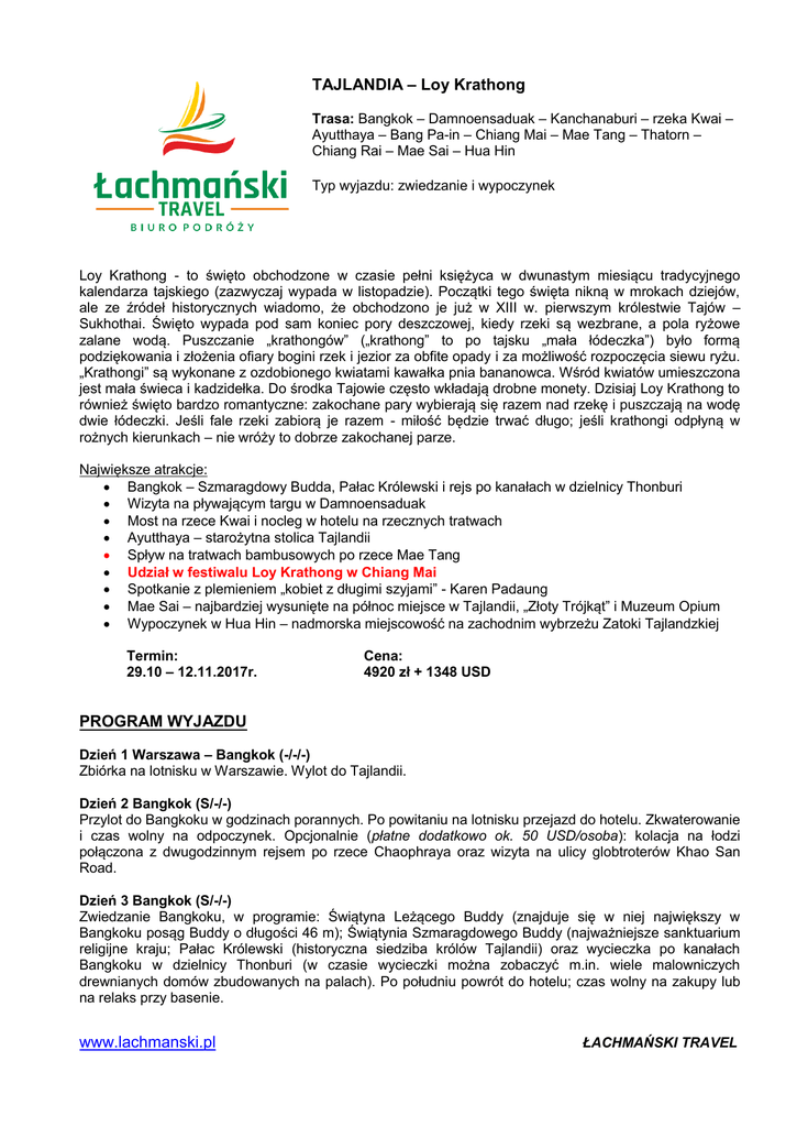 TAJLANDIA – Loy Krathong Trasa: Bangkok – Damnoensaduak – Kanchanaburi – rzeka Kwai – Ayutthaya – Bang Pa-in – Chiang Mai – Mae Tang – Thatorn – Chiang Rai – Mae Sai – Hua Hin Typ wyjazdu: zwiedzanie i wypoczynek Loy Krathong - to święto obchodzone w czasie pełni księżyca w dwunastym miesiącu tradycyjnego kalendarza tajskiego (zazwyczaj wypada w listopadzie). Początki tego święta nikną w mrokach dziejów, ale ze źródeł historycznych wiadomo, że obchodzono je już w XIII w. pierwszym królestwie Tajów – Sukhothai. Święto wypada pod sam koniec pory deszczowej, kiedy rzeki są wezbrane, a pola ryżowe zalane wodą. Puszczanie „krathongów” („krathong” to po tajsku „mała łódeczka”) było formą podziękowania i złożenia ofiary bogini rzek i jezior za obfite opady i za możliwość rozpoczęcia siewu ryżu. „Krathongi” są wykonane z ozdobionego kwiatami kawałka pnia bananowca. Wśród kwiatów umieszczona jest mała świeca i kadzidełka. Do środka Tajowie często wkładają drobne monety. Dzisiaj Loy Krathong to również święto bardzo romantyczne: zakochane pary wybierają się razem nad rzekę i puszczają na wodę dwie łódeczki. Jeśli fale rzeki zabiorą je razem - miłość będzie trwać długo; jeśli krathongi odpłyną w rożnych kierunkach – nie wróży to dobrze zakochanej parze. Największe atrakcje: Bangkok – Szmaragdowy Budda, Pałac Królewski i rejs po kanałach w dzielnicy Thonburi Wizyta na pływającym targu w Damnoensaduak Most na rzece Kwai i nocleg w hotelu na rzecznych tratwach Ayutthaya – starożytna stolica Tajlandii Spływ na tratwach bambusowych po rzece Mae Tang Udział w festiwalu Loy Krathong w Chiang Mai Spotkanie z plemieniem „kobiet z długimi szyjami” - Karen Padaung Mae Sai – najbardziej wysunięte na północ miejsce w Tajlandii, „Złoty Trójkąt” i Muzeum Opium Wypoczynek w Hua Hin – nadmorska miejscowość na zachodnim wybrzeżu Zatoki Tajlandzkiej Termin: 29.10 – 12.11.2017r. Cena: 4920 zł + 1348 USD PROGRAM WYJAZDU Dzień 1 Warszawa – Bangkok (-/-/-) Zbiórka na lotnisku w Warszawie. Wylot do Tajlandii. Dzień 2 Bangkok (S/-/-) Przylot do Bangkoku w godzinach porannych. Po powitaniu na lotnisku przejazd do hotelu. Zkwaterowanie i czas wolny na odpoczynek. Opcjonalnie (płatne dodatkowo ok. 50 USD/osoba): kolacja na łodzi połączona z dwugodzinnym rejsem po rzece Chaophraya oraz wizyta na ulicy globtroterów Khao San Road. Dzień 3 Bangkok (S/-/-) Zwiedzanie Bangkoku, w programie: Świątyna Leżącego Buddy (znajduje się w niej największy w Bangkoku posąg Buddy o długości 46 m); Świątynia Szmaragdowego Buddy (najważniejsze sanktuarium religijne kraju; Pałac Królewski (historyczna siedziba królów Tajlandii) oraz wycieczka po kanałach Bangkoku w dzielnicy Thonburi (w czasie wycieczki można zobaczyć m.in. wiele malowniczych drewnianych domów zbudowanych na palach). Po południu powrót do hotelu; czas wolny na zakupy lub na relaks przy basenie. www.lachmanski.pl ŁACHMAŃSKI TRAVEL Dzień 4 Bangkok – Kanchanaburi (S/-/-) Po wykwaterowaniu z hotelu wyjedziemy do miejscowości Damnoensaduak, w której znajduje się słynny pływający targ. Następnie wsiądziemy do łodzi, którymi dopłyniemy na ten egzotyczny rynek. Można tu kupić owoce tropikalne, pamiątki, lokalne wyroby, a nawet zupę gotowaną bezpośrednio na łodzi. Wyjazd do miejscowości Kanchanaburi, położonej ok. 30 km od granicy z Birmą. Czas wolny na zdjęcia na słynnym moście na rzece Kwai. Następnie przejazd w kierunku granicy z Birmą do hotelu River Kwai Jungle Rafts. Hotel składa się z domków krytych strzechą, zbudowanych na tratwach na rzece Kwai. Wieczorem kolacja; czas wolny. Dzień 5 Kanchanaburi – Ayutthaya (S/-/-) Po wczesnym śniadaniu w otoczeniu tropikalnej roślinności i budzącej się do życia natury, wykwaterowanie z hotelu. Powrót łodziami motorowymi do przystani. Następnie przejedziemy do parku narodowego Erawan, gdzie podczas swobodnego trekkingu podziwiać będziemy piękną, tropikalną roślinność. Dla chętnych możliwość kąpieli w krystalicznie czystych wodach malowniczego wodospadu, zaliczanego do najpiękniejszych wodospadów Tajlandii. Przejazd do jaskinii Tam Krase, w której znajduje się posąg Buddy. Tuż obok przebiega malowniczo położony most, powstały w czasie wojny. Po południu przejazd do starożytnej stolicy Tajlandii – miejscowości Ayutthaya (stolica w latach 1351 – 1767). Zakwaterowanie w hotelu; nocleg. Dzień 6 Ayutthaya – Bangkok – Chiang Mai (S/-/-) Po śniadaniu zwiedzanie zabytków Ayutthayi. Miasto zostało doszczętnie zniszczone przez wojska birmańskie w 1767 roku, jednak do dzisiaj zachowały się tam ruiny dziesiątek wspaniałych świątyń, które są niemym świadectwem chlubnej przeszłości miasta. W połowie XVIII w. w Ayutthayi mieszkało ponad 200 tys. ludzi i w tym okresie było to jedno z najwspanialszych miast na świecie. Przejazd do miejscowości Bang Pa-in. Znajduje się tu letnia rezydencji królów Tajlandii. Rezydencja powstała w połowie XVII w., ale obecny kształt przybrała w drugiej połowie XIX w., w okresie panowania królów: Ramy IV i Ramy V. Wśród imponujących budowli zespołu pałacowego na szczególną uwagę zasługuje "Pałac Niebiańskiego Światła" (budowla w chińskim stylu wzniesiona w 1889 r.); "Boska Siedziba Wolności Osobistej" (pawilion zbudowany na środku małego jeziora, w typowym tajskim stylu) oraz „Wieża Strażnika Mądrości” (wieża obserwacyjna wybudowana przez króla Ramę V). Po południu transfer na lotnisko w Bangkoku. Przelot do miasta Chiang Mai – stolicy północnej Tajlandii. Dzień 7 Chiang Mai (S/-/-) Rano zwiedzanie najpiękniejszej świątyni północnej Tajlandii, celu pielgrzymek buddystów z całego kraju – Wat Phra That Doi Suthep. Świątynia położona jest na szczycie wzgórza (ok. 1200 m n.p.m), skąd roztacza