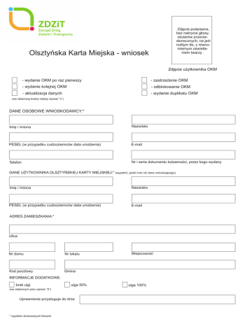 Zdjêcie podpisane, bez nakrycia g³owy, okularów przeciws³onecznych, na jednolitym tle, z równomiernym oœwietleniem twarzy . Olsztyñska Karta Miejska - wniosek Zdjêcie u¿ytkownika OKM - wydanie OKM po raz pierwszy - zastrze¿enie OKM - wydanie kolejnej OKM - odblokowanie OKM - aktualizacja danych - wydanie duplikatu OKM (we w³aœciwej kratce nale¿y wpisaæ “x”) DANE OSOBOWE WNIOSKODAWCY:* Imiê / imiona Nazwisko PESEL (w przypadku cudzoziemców data urodzenia) E-mail Telefon Nr i seria dokumentu to¿samoœci, przez kogo wydany DANE U¯YTKOWNIKA OLSZTYÑSKIEJ KARTY MIEJSKIEJ:* (wype³niæ, je¿eli inne ni¿ dane wnioskuj¹cego) Imiê / imiona Nazwisko PESEL (w przypadku cudzoziemców data urodzenia) E-mail ADRES ZAMIESZKANIA:* Ulica Nr domu Nr lokalu Kod pocztowy Gmina Miejscowoœæ INFORMACJE DODATKOWE: brak ulgi ulga 50% (we w³aœciwym polu wpisaæ “X”) Uprawnienie przys³uguje do dnia: * wype³niæ drukowanymi literami ulga 100% Dodatkowe informacje: ___________________________________________________________________________________________________________ ___________________________________________________________________________________________________________ ___________________________________________________________________________________________________________ ___________________________________________________________________________________________________________ Wyra¿am zgodê na przetwarzanie danych osobowych w zakresie niezbêdnym do wydania Olsztyñskiej Karty Miejskiej oraz administrowania Olsztyñsk¹ Kart¹ Miejsk¹. Oœwiadczam, ¿e zosta³em(am) poinformowany(a) o tym, ¿e podanie moich danych osobowych jest dobrowolne oraz o przys³uguj¹cym mi prawie do kontroli treœci danych oraz ich poprawiania. Oœwiadczam, ¿e podane przeze mnie dane osobowe s¹ prawdziwe, zdjêcie nie narusza przepisów prawa oraz dóbr osobistych osób trzecich. W przypadku, gdyby powy¿sze oœwiadczenie okaza³o siê nieprawdziwe, ponoszê odpowiedzialnoœæ za ewentualne naruszenie dóbr osobistych i innych oraz oœwiadczam, ¿e w przypadku sporów i roszczeñ osób trzecich, zaspokojê wszelkie uzasadnione roszczenia takich osób, przez co zwolniê administratora danych osobowych z wszelkiej odpowiedzialnoœci w postêpowaniach s¹dowych. Czytelny podpis wnioskodawcy Numer wydanej Olsztyñskiej Karty Miejskiej Potwierdzenie odbioru - data, czytelny podpis ADNOTACJE ZDZiT w OLSZTYNIE: