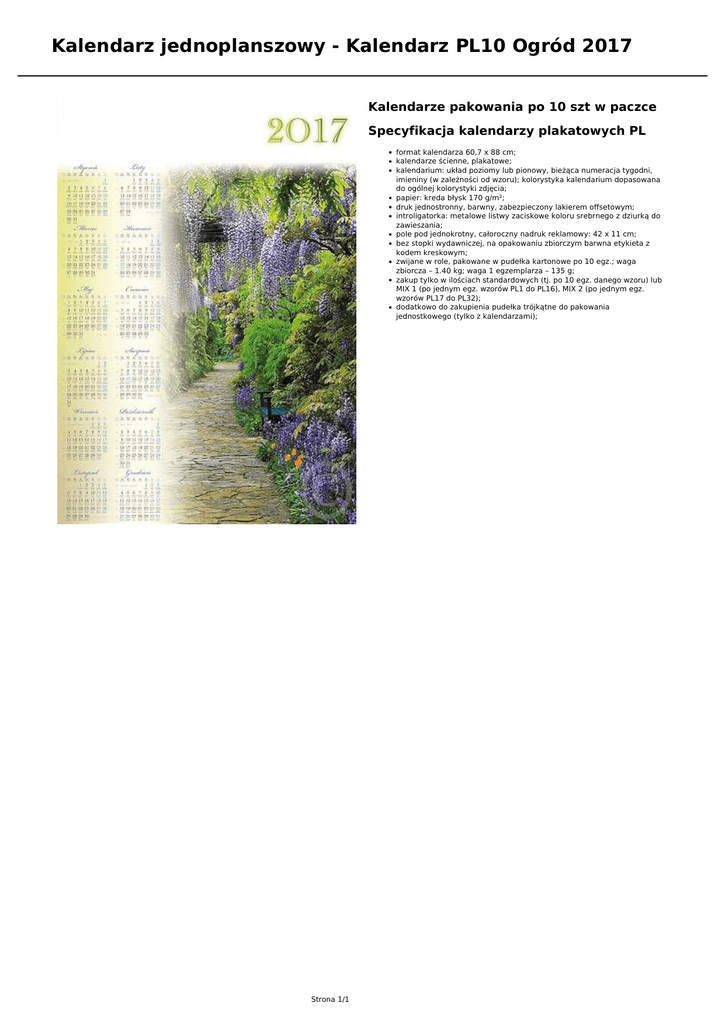 Kalendarz jednoplanszowy - Kalendarz PL10 Ogród 2017 Kalendarze pakowania po 10 szt w paczce Specyfikacja kalendarzy plakatowych PL format kalendarza 60,7 x 88 cm; kalendarze ścienne, plakatowe; kalendarium: układ poziomy lub pionowy, bieżąca numeracja tygodni, imieniny (w zależności od wzoru); kolorystyka kalendarium dopasowana do ogólnej kolorystyki zdjęcia; papier: kreda błysk 170 g/m²; druk jednostronny, barwny, zabezpieczony lakierem offsetowym; introligatorka: metalowe listwy zaciskowe koloru srebrnego z dziurką do zawieszania; pole pod jednokrotny, całoroczny nadruk reklamowy: 42 x 11 cm; bez stopki wydawniczej, na opakowaniu zbiorczym barwna etykieta z kodem kreskowym; zwijane w role, pakowane w pudełka kartonowe po 10 egz.; waga zbiorcza – 1.40 kg; waga 1 egzemplarza – 135 g; zakup tylko w ilościach standardowych (tj. po 10 egz. danego wzoru) lub MIX 1 (po jednym egz. wzorów PL1 do PL16), MIX 2 (po jednym egz. wzorów PL17 do PL32); dodatkowo do zakupienia pudełka trójkątne do pakowania jednostkowego (tylko z kalendarzami); Strona 1/1 Powered by TCPDF (www.tcpdf.org)