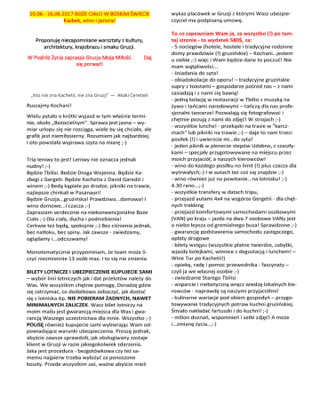 10.06 - 16.06 2017 BOŻE CIAŁO W BOSKIM ŚWIECIE Kazbek, wino i jeziora! Proponuję niezapomniane warsztaty z kultury, architektury, krajobrazu i smaku Gruzji. W Podróż Życia zaprasza Gruzja Moja Miłość. się porwać! Daj „Kto nie zna Kachetii, nie zna Gruzji” — Akaki Ceretieli Ruszajmy Kochani! Wielu pytało o krótki wyjazd w tym właśnie terminie, około „Bożocielnym”. Sprawa jest jasna – wymiar urlopu się nie rozciąga, wiele by się chciało, ale grafik jest niemiłosierny. Rozumiem jak najbardziej. I oto powstała wyprawa szyta na miarę ;-) Trip leniwy to jest! Leniwy nie oznacza jednak nudny! ;-) Będzie Tbilisi. Bedzie Droga Wojenna. Będzie Kazbegi z Gergeti. Będzie Kachetia z David Garedżi i winem ;-) Bedą kąpiele po drodze, pikniki na trawie, najlepsze chinkali w Pasanauri! Będzie Gruzja...gruzińska! Prawdziwa...domowa! I wino domowe...i czacza ;-) Zapraszam serdecznie na niekonwencjonalne Boże Ciało ;-) Dla ciała, ducha i podniebienia! Cerkwie też będą, spokojnie ;-) Bez ciśnienia jednak, bez natłoku, bez spiny. Jak zawsze - zwiedzamy, oglądamy i...odczuwamy! Monotematycznie przypominam, że team może liczyć niezmiennie 13 osób max. I to się nie zmienia. BILETY LOTNICZE I UBEZPIECZENIE KUPUJECIE SAMI – wybór linii lotniczych jak i dat przelotów należy do Was. We wszystkim chętnie pomogę. Doradzę gdzie się zatrzymać, co dodatkowo zobaczyć, jak dostać się z lotniska itp. NIE POBIERAM ŻADNYCH, NAWET MINIMALNYCH ZALICZEK. Wasz bilet lotniczy na moim mailu jest gwarancją miejsca dla Was i gwarancją Waszego uczestnictwa dla mnie. Wszystko ;-) POLISĘ również kupujecie sami wybierając Wam odpowiadające warunki ubezpieczenia. Proszę jednak, abyście zawsze sprawdzili, jak obsługiwany zostaje klient w Gruzji w razie jakiegokolwiek zdarzenia. Jaka jest procedura - bezgotówkowa czy też samemu najpierw trzeba wyłożyć za ponoszone koszty. Przede wszystkim zaś, ważne abyście mieli wykaz placówek w Gruzji z którymi Wasz ubezpieczyciel ma podpisaną umowę. To co zapewniam Wam ja, za wszystko (!) po tamtej stronie - to wydatek 580$, za: - 5 noclegów (hotele, hostele i tradycyjne rodzinne domy prawdziwie (!) gruzińskie) – Kochani…jestem u siebie ;-) więc i Wam będzie dane to poczuć! Nie mam wątpliwości... - śniadania do syta! - obiadokolacje do oporu! – tradycyjne gruzińskie supry z toastami – gospodarze pośród nas – z nami zasiadają i z nami się bawią! - jedną kolację w restauracji w Tbilisi z muzyką na żywo i tańcami narodowymi – tańczą dla nas profesjonalni tancerze! Pozwalają się fotografować i chętnie pozują z nami do zdjęć! W strojach ;-) - wszystkie lunche! - przekąski na trasie w "karczmach" lub pikniki na trawie ;-) – daje to nam trzeci posiłek (!) i uwierzcie mi…do syta! - jeden piknik w plenerze stepów Udabno, z szaszłykami – specjały przygotowywane na miejscu przez moich przyjaciół, a naszych kierowców! - wino do każdego posiłku no limit (!) plus czacza dla wytrwałych;-) I w autach też coś się znajdzie ;-) - wino również już na powitanie...na lotnisku! ;-) 4.30 rano...;-) - wszystkie transfery w datach tripu, - przejazd autami 4x4 na wzgórze Gergetii - dla chętnych trekking - przejazd komfortowymi samochodami osobowymi (VAN) po kraju – jazda na dwa 7 osobowe VANy jest o niebo lepsza od gremialnego busa! Sprawdzone ;-) - gwarancję podstawienia samochodu zastępczego, opłaty drogowe - bilety wstępu (wszystkie płatne twierdze, zabytki, wjazdy kolejkami, winnice z degustacją i lunchem! – Wine Tur po Kachetii!) - opiekę, radę i pomoc przewodnika - fascynaty – czyli ja we własnej osobie ;-) - zwiedzanie Starego Tbilisi - wsparcie i niebotyczną wręcz wiedzę lokalnych kierowców - naprawdę są naszymi przyjaciółmi! - kulinarne wariacje pod okiem gospodyń – przygotowywanie tradycyjnych potraw kuchni gruzińskiej. Śmiało nakładać fartuszki i do kuchni! ;-) - milion doznań, wspomnień i setki zdjęć! A może i…zmianę życia…;-) ZARYS WYPRAWY: KAZBEGI (Droga Wojenna) z wjazdem 4x4 na Gergeti – ANANURI-MCCHETA-TBILISI-KACHETIA WINNIE I KĄPIELOWO (!) Z DAVID GAREDŻI - i tak: *Kazbegi – przejazd z lotniska Gruzińską Drogą Wojenną, Przełęcz Krzyżowa (Dżwari) – najwyższy punkt Drogi Wojennej, 2379m n.p.m.– w drodze powrotnej Twierdza Ananuri, kapiel nad Jeziorem Żinwalskim, następnie Mccheta – pierwsza stolica Gruzji. W Kazbegi off-road 4x4 na wzgórze Gergeti (2400m n.p.m.) do Klasztoru Cminda Sameba. Możliwy trekking dla chętnych. Okolica…bajkowa…Surowy, majestatyczny Kaukaz ze szczytem Kazbek 5047m n.p.m 1 nocleg w gruzińskim domu w Kazbegi. Tam też zjemy post-transferowe śniadanie ;-) Po lekkim odpoczynku mamy cały dzień w krajobrazie Wysokiego Kaukazu! Wieczorem niesamowita supra u Mai ;-) Nie sztuką jest napchać punktów na maxa...Dziesiątki cerkwi, tyleż winnic, muzeów, parków itp., Sztuką jest pozwolić się nią raczyć...nią oddychać, a nade wszystko Gruzję poczuć! A i tak sporo się najeździmy w tym chilloutowym tripie:-) i nie raz przekonamy co znaczy gruzińska godzina i gruziński kilometr ;-) Czekam na Was - pozostaję do usług, i serdecznie zapraszam! asia juszczuk +48 519 860 543 www.facebook.com/gruzjamojamilosc Bardzo też proszę o zapoznanie się z moją stroną www.gruzjamojamilosc.pl, a nade wszystko z zakładką http://gruzjamojamilosc.pl/wazne/rules/ tam wiele o zasadach panujących w Gruzji, typach noclegów i reguł podróżowania ze mną ;-) do miłego! Ananuri – Jezioro Żinwalskie *Tbilisi - kolacja w restauracji, następnego dnia zwiedzanie - 1 nocleg w hotelu w cudnej najstarszej dzielnicy Avlabari. *Kachetia – City of Love - Sighnaghi - najbardziej malownicze miasteczko Gruzji! - 3 noclegi (ostatni transferowy), w tym wyjazd do David Garedżi - monastyry w skale i trekking na granicę z Azerbejdżanem! Winnice z degustacją (Wine Tur po Kachetii
