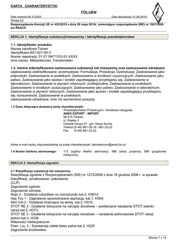 KARTA CHARAKTERYSTYKI TOLUEN Data wydania 08,10,2003 Wersja 5,0 Data aktualizacji: 01.06.2015r. Rozporządzenie Komisji UE nr 453/2010 z dnia 20 maja 2010r. zmieniające rozporządzenie (WE) nr 1907/2006 ws REACH SEKCJA 1: Identyfikacja substancji/mieszaniny i identyfikacja przedsiębiorstwa 1.1. Identyfikator produktu Nazwa handlowa:Toluen Identyfikator:601-021-00-3 Numer rejestracji: 01-2119471310-51-XXXX Inne nazwy: Metylobenzen, Fenylometan 1.2. Istotne zidentyfikowane zastosowania substancji lub mieszaniny oraz zastosowania odradzane zastosowania zidentyfikowane: przemysłowe: Formulacja; Produkcja; Dystrybucja; Zastosowanie jako półprodukt; Zastosowanie w powłokach; Zastosowanie w środkach czyszczących; Zastosowanie jako paliwo; Zastosowanie jako spoiwo i środek zapobiegający przyklejaniu się; Zastosowanie w laboratorium; Zastosowanie w płynach roboczych; profesjonalne: Zastosowanie w powłokach; Zastosowanie w środkach czyszczących; Zastosowanie jako paliwo; Zastosowanie w laboratorium; Zastosowanie w płynach roboczych; Zastosowanie jako spoiwo i środek zapobiegający przyklejaniu się; konsumencki: Zastosowanie w powłokach; zastosowania odradzane: inne niż wymienione powyżej 1.3 Dane dotyczące dostawcy karty charakterystyki: Przedsiębiorstwo Produkcyjno- Handlowo-Usługowe ANED EXPORT - IMPORT 96-515 Teresin ul. Wąska 3 Oddział Okopy 47 , gm. Nowa Sucha Telefon:(0-46) 861-28-16 / 861-23-22 Fax: (0-46) 861-23-22 Adres e-mail osoby odpowiedzialnej za kartę charakterystyki: [email protected] 1.4 Numer telefonu alarmowego: 112 (ogólny telefon alarmowy), 998 (straż pożarna), 999 (pogotowie medyczne); SEKCJA 2: Identyfikacja zagrożeń 2.1 Klasyfikacja substancji lub mieszaniny Klasyfikacja zgodnie z Rozporządzeniem (WE) nr 1272/2008 z dnia 16 grudnia 2008 r. w sprawie klasyfikacji, oznakowania i pakowania (CLP) Zagrożenie ogólnie: Zagrożenie zdrowia: Repr.2 - Działanie szkodliwe na rozrodczość kat.2, H361d Asp.Tox.1 - Zagrożenie spowodowane aspiracją, kat.1, H304; Skin Irrit.2 - Działanie drażniące na skórę, kat.2, H315; STOT RE 2 - Działanie toksyczne na narządy docelowe – powtarzane narażenie STOT wielokr. naraż.kat.2, H373; STOT SE 3 - Działanie toksyczne na narządy docelowe – narażenie jednorazowe STOT naraż. jednor.kat.3, H336 Własności niebezpieczne: Flam. Liq. 2 - Substancja ciekła łatwo palna kat.2, H225 Zagrożenie środowiska: Strona 1 z 14 KARTA CHARAKTERYSTYKI TOLUEN Data wydania 08,10,2003 Wersja 5,0 Data aktualizacji: 01.06.2015r. Rozporządzenie Komisji UE nr 453/2010 z dnia 20 maja 2010r. zmieniające rozporządzenie (WE) nr 1907/2006 ws REACH nie dotyczy 2.2 Elementy oznakowania: NIEBEZPIECZEŃSTWO Zwroty wskazujące rodzaj zagrożenia: H225 - Wysoce łatwo palna ciecz i pary H304 - Połknięcie i dostanie się przez drogi oddechowe może grozić śmiercią H373 - Może powodować uszkodzenie narządów, poprzez długotrwałe lub powtarzane narażenie H315 - Działa drażniąco na skórę H336 - Może wywoływać uczucie senności lub zawroty głowy H361d - Podejrzewa się, że działa szkodliwie na dziecko w łonie matki Zwroty określające warunki bezpiecznego stosowania: P202 Nie używać przed zapoznaniem się i zrozumieniem wszystkich środków bezpieczeństwa. P210 Przechowywać z dala od źródeł ciepła/iskrzenia/otwartego ognia/gorących powierzchni. – Palenie wzbronione. P243 Przedsięwziąć środki ostrożności zapobiegające elektrostatycznemu rozładowaniu. P280 Stosować rękawice ochronne/odzież ochronną/ochronę oczu/ochronę twarzy. P303+P361+P353 W PRZYPADKU KONTATKU ZE SKÓRĄ (lub z włosami): Natychmiast usunąć/zdjąć całą zanieczyszczoną odzież. Spłukać skórę pod strumieniem wody/prysznicem. P301+P310 W PRZYPADKU POŁKNIĘCIA: Natychmiast skontaktować się z OŚRODKIEM ZATRUĆ lub z lekarzem. P331 NIE wywoływać wymiotów. 2.3. Inne zagrożenia Substancja nie spełnia kryteriów PBT lub vPvB zgodnie z załącznikiem XIII. Pary mogą tworzyć mieszaniny wybuchowe z powietrzem. Pary są cięższe od powietrza, rozprzestrzeniają się przy powierzchni ziemi, gromadzą się w dolnych partiach pomieszczeń. Zamknięte pojemniki narażone na działanie ognia lub wysokiej temperatury mogą wybuchać w wyniku wzrostu ciśnienia wewnątrz nich. SEKCJA 3: Skład/informacja o składnikach 3.1 Substancja: Skład wg Rozporządzenia 1272/2008. Toluen > 99,0% Nr CAS: 108-88-3 Nr indeksowy: 601-021-00-3 Nr WE: 203-625-9 SEKCJA 4: Środki pierwszej pomocy 4.1. Opis środków pierwszej pomocy Strona 2 z 14 KARTA CHARAKTERYSTYKI TOLUEN Data wydania 08,10,2003 Wersja 5,0 Data aktualizacji: 01.06.2015r. Rozporządzenie Komisji UE nr 453/2010 z dnia 20 maja 2010r. zmieniające rozporządzenie (WE) nr 1907/2006 ws REACH Wdychanie: W razie narażenia inhalacyjnego wezwać pomoc medyczną. Gdy poszkodowany jest przytomny wyprowadzić poszkodowanego z miejsca narażenia. Zapewnić spokój w dowolnej pozycji, chronić przed utratą ciepła. W przypadku duszności - wykwalifikowany personel medyczny powienien podać tlen. Nieprzytomnego - wynieść z miejsca narażenia, ułożyć w pozycji bocznej, usunąć z jamy ustnej protezy i inne ciała obce. Jeżeli poszkodowany nie oddycha - zastosować sztuczne oddychanie metodą ustausta. Kontakt ze skórą: Zdjąć zanieczyszczoną odzież. Zanieczyszczoną skórę umyć wodą z mydłem, a następnie dokładnie spłukać dużą ilością wody. W przypadku wystąpienia i utrzymywania się podrażnienia lub jakichkolwiek innych objawów skonsultować się z lekarzem. Kontakt z oczami: W razie kontaktu z oczami płukać obficie wodą przez ok. 15 min przy otwartych powiekach. Usunąć szkła kontaktowe. Zapewnić konsultację okulistyczną. Spożycie: W razie połknięcia nie wywoływać wymiotów. Podać 150 ml płynnej parafiny. Nie podawać mleka, tłuszczów, alkoholu. W przypadku duszności - wykwalifikowany personel medyczny powienien podać tlen. Natyc
