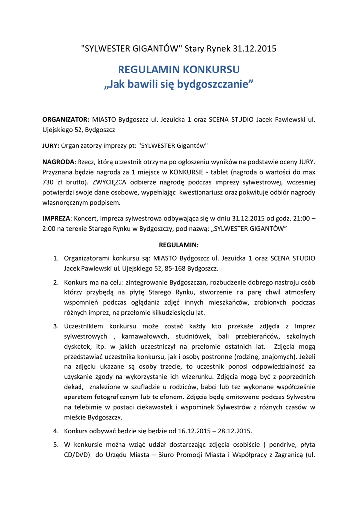 "SYLWESTER GIGANTÓW" Stary Rynek 31.12.2015 REGULAMIN KONKURSU „Jak bawili się bydgoszczanie” ORGANIZATOR: MIASTO Bydgoszcz ul. Jezuicka 1 oraz SCENA STUDIO Jacek Pawlewski ul. Ujejskiego 52, Bydgoszcz JURY: Organizatorzy imprezy pt: "SYLWESTER Gigantów" NAGRODA: Rzecz, którą uczestnik otrzyma po ogłoszeniu wyników na podstawie oceny JURY. Przyznana będzie nagroda za 1 miejsce w KONKURSIE - tablet (nagroda o wartości do max 730 zł brutto). ZWYCIĘZCA odbierze nagrodę podczas imprezy sylwestrowej, wcześniej potwierdzi swoje dane osobowe, wypełniając kwestionariusz oraz pokwituje odbiór nagrody własnoręcznym podpisem. IMPREZA: Koncert, impreza sylwestrowa odbywająca się w dniu 31.12.2015 od godz. 21:00 – 2:00 na terenie Starego Rynku w Bydgoszczy, pod nazwą: „SYLWESTER GIGANTÓW” REGULAMIN: 1. Organizatorami konkursu są: MIASTO Bydgoszcz ul. Jezuicka 1 oraz SCENA STUDIO Jacek Pawlewski ul. Ujejskiego 52, 85-168 Bydgoszcz. 2. Konkurs ma na celu: zintegrowanie Bydgoszczan, rozbudzenie dobrego nastroju osób którzy przybędą na płytę Starego Rynku, stworzenie na parę chwil atmosfery wspomnień podczas oglądania zdjęć innych mieszkańców, zrobionych podczas różnych imprez, na przełomie kilkudziesięciu lat. 3. Uczestnikiem konkursu może zostać każdy kto przekaże zdjęcia z imprez sylwestrowych , karnawałowych, studniówek, bali przebierańców, szkolnych dyskotek, itp. w jakich uczestniczył na przełomie ostatnich lat. Zdjęcia mogą przedstawiać uczestnika konkursu, jak i osoby postronne (rodzinę, znajomych). Jeżeli na zdjęciu ukazane są osoby trzecie, to uczestnik ponosi odpowiedzialność za uzyskanie zgody na wykorzystanie ich wizerunku. Zdjęcia mogą być z poprzednich dekad, znalezione w szufladzie u rodziców, babci lub też wykonane współcześnie aparatem fotograficznym lub telefonem. Zdjęcia będą emitowane podczas Sylwestra na telebimie w postaci ciekawostek i wspominek Sylwestrów z różnych czasów w mieście Bydgoszczy. 4. Konkurs odbywać będzie się będzie od 16.12.2015 – 28.12.2015. 5. W konkursie można wziąć udział dostarczając zdjęcia osobiście ( pendrive, płyta CD/DVD) do Urzędu Miasta – Biuro Promocji Miasta i Współpracy z Zagranicą (ul. Niedźwiedzia 4, I Pietro, pokój 106A) albo wysyłając zdjęcia mailem na adres: [email protected] , - zeskanowane z postaci papierowej. Organizator ma prawo do ich pełnego wykorzystania oraz praw autorskich na czas trwania imprezy sylwestrowej „SYLWESTER Gigantów”. Zdjęcia należy dostarczyć w jak najwyższej rozdzielczości. Wraz ze zdjęciami należy dostarczyć swoje dane osobowe (imię i nazwisko, adres, nr telefonu do kontaktu). Mail wysłany na adres: [email protected] (nie może przekroczyć 10 MB). W temacie winno być napisane „Sylwester – konkurs”. 6. Zdjęcia uczestników oceniać będzie JURY powołane przez organizatora, które zdecyduje o wyborze zwycięzcy. Wyłoniony zostanie tylko jeden zwycięzca, choć organizator zastrzega, że mogą zostać zmienione zasady wyboru zwycięzcy lub zwycięzców. 7. Zwycięzca konkursu zostanie ogłoszony podczas miejskiego Sylwestra imprezy pt. ”SYLWESTER Gigantów” w dniu 31.12.2015 lub 1.01.2016. Aby otrzymać nagrodę, uczestnik musi być obecny podczas zabawy sylwestrowej, mieć przy sobie dowód osobisty (aby potwierdzić swoje dane), a także złożyć własnoręcznie podpis w celu potwierdzenia odbioru nagrody. Uczestnik potwierdza odbiór nagrody na specjalnie przygotowanym formularzu. 8. Uczestnicy mogą przesyłać zdjęcia kolorowe i czarno-białe. Uczestnik biorąc udział w konkursie i akceptując regulamin przekazuje także na czas trwania i przygotowania do imprezy sylwestrowej prawa autorskie do przesłanego/dostarczonego zdjęcia. Do zakończenia imprezy sylwestrowej pozwala na pełne wykorzystanie ich oraz wizerunku osób na zdjęciach, w celach stworzenia specjalnej prezentacji, która będzie emitowana podczas imprezy sylwestrowej w dniu 31.12.2015 i 1.01.2015. 9. Ocenie zdjęć służy tylko subiektywna analiza przez organizatorów, obrazu jaki zostanie przedstawiony na zdjęciach przez uczestników. 10. Jeden uczestnik może zgłosić maksymalnie 5 zdjęć. 11. Osoby będące uczestnikami konkursu (przesyłające zdjęcia) automatycznie akceptują warunki niniejszego regulaminu. Składając, przesyłając lub przekazując w jakiejkolwiek formie zdjęcia przekazują także, na organizatora prawa autorskie do zdjęć oraz wizerunku osób będących na zdjęciach bez możliwości roszczenia jakichkolwiek praw, opłat, tantiem itp. Przekazując tym samym prawo do dowolnego emitowania na telebimie podczas imprezy, także w internecie, stronach miasta, facebooku organizatora i miasta w celu promocji imprezy „Sylwester GIGANTÓW”. Również do wykorzystania zdjęć w albumie miasta, stronach www itp. 12. Zdjęcia można nadsyłać najpóźniej do godziny 24:00 dnia 28.12.2015. 13. Organizator zastrzega sobie prawo do zmian w regulaminie, nawet podczas trwania konkursu. 14. Po zakończeniu konkursu uczestnicy nie mogą zgłaszać jakichkolwiek roszczeń wobec organizatora i innych uczestników ani podważać decyzji JURY. 15. W konkursie „Jak bawili się Bydgoszczanie…” Mogą brać udział osoby, które ukończyły 18 rok życia lub będą miały pisemną zgodę od swoich opiekunów prawnych, rodziców w momencie przekazywania zdjęć. Podpisaną przez obu i pozostawioną w UM Bydgoszcz wraz ze zdjęciami. Załącznik nr 1 – Kwestionariusz osobowy Załącznik nr 2 – Zgoda rodziców na udział w konkursie osób poniżej 18 roku życia