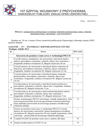 107 SZPITAL WOJSKOWY Z PRZYCHODNIĄ SAMODZIELNY PUBLICZNY ZAKŁAD OPIEKI ZDROWOTNEJ Wałcz 30.09.2013 r. Dotyczy: postępowania przetargowego na dostawę materiałów jednorazowego użytku, materiału wiskoelastycznego, stomatologii - znak 34/med/2013 Zgodnie art. 38 ust. 4 ustawy Prawo zamówień publicznych Zamawiający dokonuje zmiany SIWZ poprzez dodanie: ZADANIE – 117 – MATERIAŁY JEDNORAZOWEGO UŻYTKU Wadium: 120,00 PLN lp. Nazwa Ilość sztuk Akcesoria do pomiaru rzutu serca w technologii PICCO 10 1 Cewnik tętniczy standardowy do stosowania u dorosłych tętnica udowa, prowadnica wykonana z nitinolu, złącze luer wykonane z trogamidu średnica zewnętrzna 5f, długość użyteczna 20 cm 1 2 Cewnik tętniczy do stosowania u dorosłych tętnica ramienna ok. łokciowa, prowadnica wykonana z nitinolu, złącze wykonane z trogamidu, średnica zewnętrzna 4F, długość użyteczna 22 cm 1 3 Cewnik tętniczy do stosowania u dorosłych tętnica ramienna proksymalnie, prowadnica wykonana z nitinolu, złącze luer wykonane z trogamidu, średnica zewnętrzna 4F, długość uzyteczna 16 cm 1 4 Cewnik tętniczy do stosowania u dorosłych tętnica pachwowa prowadnica wykonana z nitinolu, złącze luer z trogamidu, średnica zewnętrzna 4F, długość użyteczna 8 cm 1 5 Cewnik tętniczy do stosowania u dzieci/niemowląt tętnica udowa prowadnica wykonana z nitinolu, złącze luer wykonane z trogamidu, średnica zewnętrzna 3 F, długość użyteczna 7 cm 10 6 Zestaw moniturujący PICCO zawierający czujnik temperatury, linia czerwona przetwornik do krwawego pomiaru ciśnienia tętniczego, linia niebieska przetwornik do krwawego pomiaru ośrodkowego ciśnienia żylnego 1 7 Zestaw do pomiaru rzutu serca w technologii PICCO: Cewnik tęniczy do stosowania u dorosłych, tętnica promieniowa (średnica zewnętrzna 4F, długość użyteczna 50 cm) czujnik temperatury, linia czerwona – przetwornik do krwawego ciśnienia tętniczego. 8 Czujnik ProAQT do pomiaru rzutu serca z analizy fali tętna. 20 9 Sonda światłowodowa CeVOX 32 cm 10 ZADANIE – 118 – MATERIAŁY JEDNORAZOWEGO UŻYTKU Wadium: 100,00 PLN lp. Nazwa Ilość sztuk 80 1 Jednorazowy kompletny zestaw do ssania-płukania o średnicy 5 mm, przeznaczony do zabiegów laparoskopowych, składajacy się z zestawu drenów w torze ssania i płukania. Rączka posiadająca dwa przyciski aktywujące funkcje ssania i płukania oznaczone różnymi kolorami, wykonana z przezroczystego tworzywa sztucznego oraz uchwyt pozwalający na płynne i precyzyjnie sterowanie funkcjami ssania i płukania. Możliwość stosowania wymiennie końcówek roboczych jedno i wielorazowych. 20 2 Zestaw PULSE LAVAGE do płukania stawów kolanowych i biodrowych podczas protezoplastyki, zawierający własny napęd bateryjny, komplet końcówek dedykowanych do biodra i kolana oraz regulację szybkości płukania. ZADANIE – 119 – MATERIAŁY JEDNORAZOWEGO UŻYTKU Wadium: 5,00 PLN lp. 1 Nazwa Licznik igieł sterylny z systemem szybkiego zdejmowania ostrzy noży chirurgicznych, z paskami pianki po jednej stronie I pojedyńczym magnesem, pojemność ok. 15/30 Ilość sztuk 200 107 SZPITAL WOJSKOWY Z PRZYCHODNIĄ Samodzielny Publiczny Zakład Opieki Zdrowotnej , ul. Kołobrzeska 44, 78-600 Wałcz Telefon (067) 250 28 09 Fax (067) 250 28 20 , Regon 570544566, N I P 765-14-95-874 Bank pekao S.A. I Oddział w Wałczu, 86124037121111000043636545