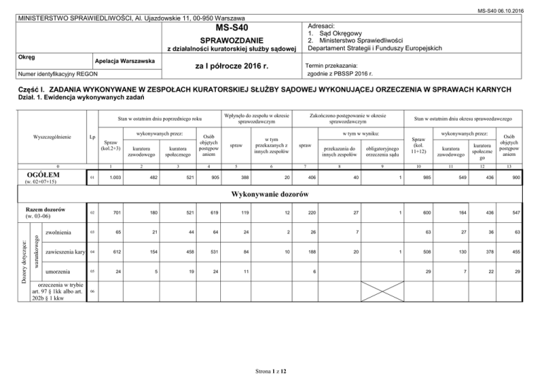 MS-S40 06.10.2016 MINISTERSTWO SPRAWIEDLIWOŚCI, Al. Ujazdowskie 11, 00-950 Warszawa Adresaci: 1. Sąd Okręgowy 2. Ministerstwo Sprawiedliwości Departament Strategii i Funduszy Europejskich MS-S40 SPRAWOZDANIE z działalności kuratorskiej służby sądowej Okręg Apelacja Warszawska za I półrocze 2016 r. Termin przekazania: zgodnie z PBSSP 2016 r. Numer identyfikacyjny REGON Część I. ZADANIA WYKONYWANE W ZESPOŁACH KURATORSKIEJ SŁUŻBY SĄDOWEJ WYKONUJĄCEJ ORZECZENIA W SPRAWACH KARNYCH Dział. 1. Ewidencja wykonywanych zadań Wpłynęło do zespołu w okresie sprawozdawczym Stan w ostatnim dniu poprzedniego roku Wyszczególnienie wykonywanych przez: Lp Spraw (kol.2+3) 0 OGÓŁEM 1 01 (w. 02+07+15) 1.003 kuratora zawodowego kuratora społecznego Osób objętych postępow aniem 2 3 4 482 521 905 Zakończono postępowanie w okresie sprawozdawczym Stan w ostatnim dniu okresu sprawozdawczego w tym w wyniku: spraw w tym przekazanych z innych zespołów spraw 5 6 7 388 20 406 wykonywanych przez: przekazania do innych zespołów obligatoryjnego orzeczenia sądu 8 9 Spraw (kol. 11+12) 10 kuratora zawodowego kuratora społeczne go 11 12 Osób objętych postępow aniem 13 40 1 985 549 436 900 1 600 164 436 547 63 27 36 63 508 130 378 455 29 7 22 29 Wykonywanie dozorów 02 701 180 521 619 119 12 220 27 zwolnienia 03 65 21 44 64 24 2 26 7 zawieszenia kary 04 612 154 458 531 84 10 188 20 umorzenia 05 24 5 19 24 11 orzeczenia w trybie art. 97 § 1kk albo art. 202b § 1 kkw 06 warunkowego Dozory dotyczące: Razem dozorów (w. 03-06) 6 Strona 1 z 12 1 MS-S40 06.10.2016 Część. I. (c.d.) Dział. 1. Ewidencja wykonywanych zadań (dok.) Wpłynęło do zespołu w okresie sprawozdawczym Stan w ostatnim dniu poprzedniego roku Wyszczególnienie Lp 0 w tym Formy kary ograniczenia wolności Razem ograniczenia wolności (w. 08+14) Kara ograniczenia wolności (w. 08<=w. od 09 do 11+13) kuratora zawodowego kuratora społecznego Osób objętych postępowa niem 2 3 4 wykonywanych przez: Spraw (kol.2+3) 1 Zakończono postępowanie w okresie sprawozdawczym w tym w wyniku: spraw w tym przekazanych z innych zespołów spraw przekazania do innych zespołów 5 6 7 8 Stan w ostatnim dniu okresu sprawozdawczego obligatoryjnego orzeczenia sądu Spraw (kol. 11+12) 9 10 kuratora zawodowego kuratora społeczne go Osób objętych postępowa niem 11 12 13 wykonywanych przez: 07 196 196 182 239 8 138 6 297 297 267 08 176 176 163 177 5 118 5 235 235 215 nieodpłatna kontrolowana praca na cele społeczne 09 175 175 162 175 5 117 5 233 233 213 kontrola miejsca pobytu z zastosowaniem s.d.e 10 13 1 1 1 2 2 2 2 14 20 20 19 62 62 62 52 obowiązki z art. 72 § 1 pkt 4-7a kk w tym (w. 11) kara orzeczona wyłącznie w formie obowiązków z art. 72 § 1 pkt 4-7a kk potrącenie z wynagrodzenia za pracę Praca społecznie użyteczna art. 45 kkw 11 12 1 3 20 1 Inne niż wymienione wyżej zadania kuratorów dla dorosłych Razem inne zadania (w. 16-21) Kontrola wykonania obowiązków przez skazanego w okresie próby bez dozoru Przygotowanie skazanego do zwolnienia z zakładu karnego Nadzory wykonywane na podstawie art. 181a § 2 kkw Wykonywanie kary pozbawienia wolności w s.d.e. Wykonywanie środków karnych w s.d.e Wykonywanie środków zabezpieczających w s.d.e. 15 106 106 104 30 48 7 88 88 86 16 90 90 88 16 32 7 74 74 72 16 16 16 14 16 14 14 14 17 18 19 20 21 Strona 2 z 12 MS-S40 06.10.2016 Część. I. (c.d.) Cz. I Dział 1.a Wykonywanie pracy społecznie użytecznej w karze ograniczenia wolności oraz orzeczonej na podstawie art. 45 kkw (Godziny pracy) Wyszczególnienie L.p. Liczba godzin pracy pozostałych do wykonania w ostatnim dniu poprzedniego roku Liczba godzin pracy, która wpłynęła do wykonania w okresie sprawozdawczym 1 2 0 Liczba zakończonych godzin pracy w okresie sprawozdawczym Na skutek faktycznego wykonania pracy Z innych przyczyn Razem 3 4 5 Liczba godzin pracy pozostałych do wykonania w ostatnim dniu okresu sprawozdawczego 6 Razem wykonywanie kary ograniczenia wolności (w. 01 = w. 02+03) 01 25.566,000 37.975,000 8.193,000 9.831,000 18.024,000 45.517,000 Kara ograniczenia wolności 02 24.089,000 33.501,000 7.253,000 9.098,000 16.351,000 41.239,000 Praca społecznie użyteczna art. 45 kkw 03 1.477,000 4.474,000 940,000 733,000 1.673,000 4.278,000 Dział 1.1. Liczba spraw zawieszonych w postępowaniu wykonawczym w ostatnim dniu okresu sprawozdawczego Czas trwania zawieszenia Sprawy wg wykazów L.p. 0 razem r. 2 do 8 do 3 mies. pow. 3 do 6 mies. pow. 6 do 12 mies. pow. 12 mies. do 2 lat pow. 2 do 3 lat pow. 3 do 5 lat pow. 5 lat 1 2 3 4 5 6 7 8 ogółem (w.01 = w.02 + 07) 01 4 2 1 kuratora zawodowego (razem w. od 03 do 06) 02 3 2 1 3 2 1 dotyczące warunkowego przedterminowego zwolnienia 03 dotyczące warunkowego zawieszenia wykonania kary 04 dotyczące warunkowego umorzenia postępowania 05 inne 06 1 w tym Doz kuratora społecznego (razem w. od 08 do 11) 07 dotyczące warunkowego przedterminowego zwolnienia 08 dotyczące warunkowego zawieszenia wykonania kary 09 dotyczące warunkowego umorzenia postępowania 10 inne 11 1 1 1 1 w tym O 12 Kkow 13 18 4 Strona 3 z 12 5 3 4 1 1 MS-S40 06.10.2016 Część. I. (c.d.) Dział. 2. Wnioski i upomnienia kuratorów zawodowych dla dorosłych oraz udział w posiedzeniach wykonawczych Dział. 2.1. Wnioski kuratorów zawodowych dla dorosłych Liczby Wyszczególnienie L.p. 0 Wnioski ogółem (w. 02 + 09 + 21 + 26 + 33 + 34) (w okresie sprawozdawczym) 1 2 3 221 148 razem (w.03+05+06+08) 02 8 7 5 o ustanowienie, rozszerzenie lub zmianę obowiązków w okresie próby (art. 163 § 2 kkw w zw. z art. 72 § 1 kk i w zw. z art. 173 § 2 pkt 5 kkw) 03 1 1 05 1 1 1 06 2 2 1 08 4 3 3 09 55 110 77 10 4 13 7 7 13 12 uczestnictwo w programie korekcyjno-edukacyjnym przebywania w określonych miejscach (art. 72 § 1 pkt 7 kk) powstrzyw tym o manie się od Wnioski dotyczące uwzględnione 168 warunkowego o zwolnienie od dozoru (art. 163 § 2 kkw w zw. z art. 173 § 2 pkt 5 zwolnienia kkw) o od