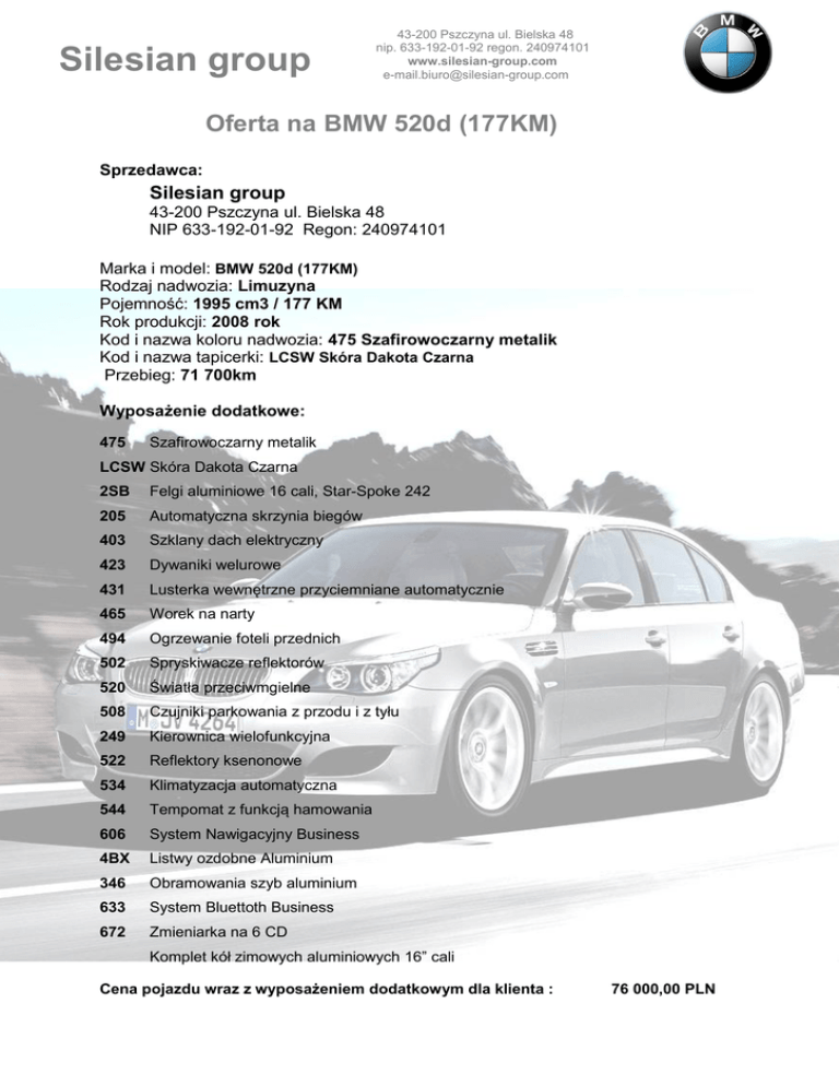 Silesian group 43-200 Pszczyna ul. Bielska 48 nip. 633-192-01-92 regon. 240974101 www.silesian-group.com [email protected] Oferta na BMW 520d (177KM) Sprzedawca: Silesian group 43-200 Pszczyna ul. Bielska 48 NIP 633-192-01-92 Regon: 240974101 Marka i model: BMW 520d (177KM) Rodzaj nadwozia: Limuzyna Pojemność: 1995 cm3 / 177 KM Rok produkcji: 2008 rok Kod i nazwa koloru nadwozia: 475 Szafirowoczarny metalik Kod i nazwa tapicerki: LCSW Skóra Dakota Czarna Przebieg: 71 700km Wyposażenie dodatkowe: 475 Szafirowoczarny metalik LCSW Skóra Dakota Czarna 2SB Felgi aluminiowe 16 cali, Star-Spoke 242 205 Automatyczna skrzynia biegów 403 Szklany dach elektryczny 423 Dywaniki welurowe 431 Lusterka wewnętrzne przyciemniane automatycznie 465 Worek na narty 494 Ogrzewanie foteli przednich 502 Spryskiwacze reflektorów 520 Światła przeciwmgielne 508 Czujniki parkowania z przodu i z tyłu 249 Kierownica wielofunkcyjna 522 Reflektory ksenonowe 534 Klimatyzacja automatyczna 544 Tempomat z funkcją hamowania 606 System Nawigacyjny Business 4BX Listwy ozdobne Aluminium 346 Obramowania szyb aluminium 633 System Bluettoth Business 672 Zmieniarka na 6 CD Komplet kół zimowych aluminiowych 16” cali Cena pojazdu wraz z wyposażeniem dodatkowym dla klienta : 76 000,00 PLN