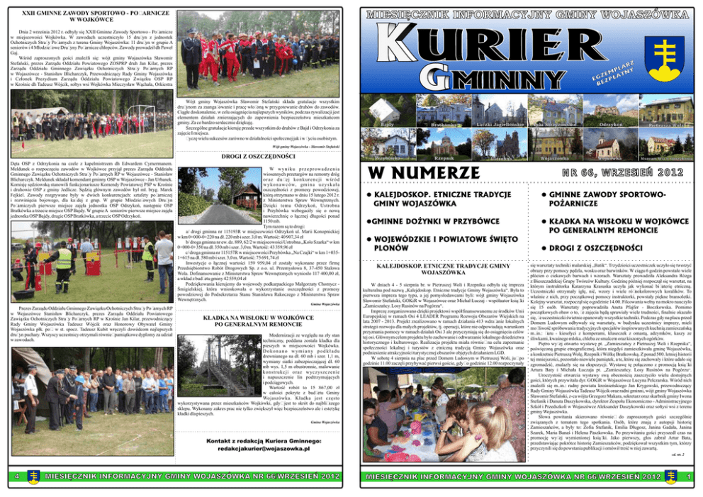 XXII GMINNE ZAWODY SPORTOWO - POŻARNICZE W WOJKÓWCE Dnia 2 września 2012 r. odbyły się XXII Gminne Zawody Sportowo - Pożarnicze w miejscowości Wojkówka. W zawodach uczestniczyło 15 drużyn z jednostek Ochotniczych Straży Pożarnych z terenu Gminy Wojaszówka: 11 drużyn w grupie A seniorów i 4 Młodzieżowe Drużyny Pożarnicze chłopców. Zawody prowadził dh Paweł Gaj. Wśród zaproszonych gości znaleźli się: wójt gminy Wojaszówka Sławomir Stefański, prezes Zarządu Oddziału Powiatowego ZOSPRP druh Jan Kilar, prezes Zarządu Oddziału Gminnego Zawiązku Ochotniczych Straży Pożarnych RP w Wojaszówce - Stanisław Blicharczyk, Przewodniczący Rady Gminy Wojaszówka i Członek Prezydium Zarządu Oddziału Powiatowego Związku OSP RP w Krośnie dh Tadeusz Wójcik, sołtys wsi Wojkówka Mieczysław Wąchała, Orkiestra Wójt gminy Wojaszówka Sławomir Stefański składa gratulacje wszystkim drużynom za zaangażowanie i pracę włożoną w przygotowanie druhów do zawodów. Ciągłe doskonalenie, w celu osiągnięcia najlepszych wyników, podczas rywalizacji jest elementem działań zmierzających do zapewnienia bezpieczeństwa mieszkańcom gminy. Za co bardzo serdecznie dziękuję. Szczególne gratulacje kieruję przede wszystkim do druhów z Bajd i Odrzykonia za zajęcie I miejsca. Życzę wielu sukcesów zarówno w działalności społecznej jak i w życiu osobistym. Wójt gminy Wojaszówka - Sławomir Stefański DROGI Z OSZCZĘDNOŚCI Dęta OSP z Odrzykonia na czele z kapelmistrzem dh Edwardem Cymermanem. Meldunek o rozpoczęciu zawodów w Wojkówce przyjął prezes Zarządu Oddziału Gminnego Zawiązku Ochotniczych Straży Pożarnych RP w Wojaszówce - Stanisław Blicharczyk. Meldunek składał komendant gminny OSP w Wojaszówce - Jan Urbanek. Komisję sędziowską stanowili funkcjonariusze Komendy Powiatowej PSP w Krośnie i druhowie OSP z gminy Jedlicze. Sędzią głównym zawodów był mł. bryg. Marek Fejkiel. Zawody rozgrywane były w dwóch konkurencjach: sztafety pożarniczej i rozwinięcia bojowego, dla każdej z grup. W grupie Młodzieżowych Drużyn Pożarniczych pierwsze miejsce zajęła jednostka OSP Odrzykoń, następnie OSP Bratkówka a trzecie miejsce OSP Bajdy. W grupie A seniorów pierwsze miejsce zajęła jednostka OSP Bajdy, drugie OSP Bratkówka, a trzecie OSP Odrzykoń. W wyniku przeprowadzenia wiosennych przetargów na remonty dróg oraz dużej konkurencji wśród w y k o n a w c ó w, g m i n a u z y s k a ł a oszczędności z promesy powodziowej, którą otrzymano w dniu 15 lutego 2012 r. z Ministerstwa Spraw Wewnętrznych. Dzięki temu Odrzykoń, Ustrobna i Przybówka wzbogaciły się o nową nawierzchnię o łącznej długości ponad 1150 mb. Tym razem są to drogi: a/ drogi gminna nr 115193R w miejscowości Odrzykoń ul. Marii Konopnickiej w km 0+000-0+220 na dł. 220 mb i szer. 3,0 m. Wartość: 40 907,34 zł b/ droga gminna nr ew. dz. 889, 62/2 w miejscowości Ustrobna „Koło Szarka“ w km 0+000-0+350 na dł. 350 mb i szer. 3,0 m. Wartość: 43 359,96 zł c/ droga gminna nr 115157R w miejscowości Przybówka „Na Czajki“ w km 1+0351+615 na dł. 580 mb i szer. 3,0 m. Wartość: 75 691,74 zł Inwestycje o łącznej wartości 159 959,04 zł zostały wykonane przez firmę Przedsiębiorstwo Robót Drogowych Sp. z o.o. ul. Przemysłowa 8, 37-450 Stalowa Wola. Dofinansowanie z Ministerstwa Spraw Wewnętrznych wyniosło 117 400,00 zł, a wkład z budżetu gminy 42 559,04 zł Podziękowania kierujemy do wojewody podkarpackiego Małgorzaty Chomycz Śmigielskiej, która wnioskowała o wykorzystanie oszczędności z promesy powodziowej do Podsekretarza Stanu Stanisława Rakoczego z Ministerstwa Spraw Wewnętrznych. Gmina Wojaszówka Prezes Zarządu Oddziału Gminnego Zawiązku Ochotniczych Straży Pożarnych RP w Wojaszówce Stanisław Blicharczyk, prezes Zarządu Oddziału Powiatowego Zawiązku Ochotniczych Straży Pożarnych RP w Krośnie Jan Kilar, przewodniczący Rady Gminy Wojaszówka Tadeusz Wójcik oraz Honorowy Obywatel Gminy Wojaszówka płk. poż. w st. spocz. Tadeusz Kubit wręczyli dowódcom najlepszych drużyn puchary. Wszyscy uczestnicy otrzymali również pamiątkowe dyplomy za udział w zawodach. KŁADKA NA WISŁOKU W WOJKÓWCE PO GENERALNYM REMONCIE Modernizacji ze względu na zły stan techniczny, poddana została kładka dla pieszych w miejscowości Wojkówka. Dokonano wymiany podkładu drewnianego na dł. 60 mb i szer. 1,1 m, wymiany siatki zabezpieczającej dł. 60 mb wys. 1,5 m obustronnie, malowanie konstrukcji oraz wyczyszczenie i napuszczenie lin podtrzymujących i podciągowych. Wartość robót to 15 867,00 zł w całości pokryte z budżetu Gminy Wojaszówka. Kładka jest często wykorzystywana przez mieszkańców Wojkówki, gdyż jest to skrót do najbliższego sklepu. Wykonany zakres prac nie tylko zwiększył więc bezpieczeństwo ale i estetykę kładki dla pieszych. Gmina Wojaszówka Kontakt z redakcją Kuriera Gminnego: [email protected] NR 66, WRZESIEŃ 2012 KALEJDOSKOP. ETNICZNE TRADYCJE GMINY WOJASZÓWKA W dniach 4 - 5 sierpnia br. w Pietruszej Woli i Rzepniku odbyła się impreza kulturalna pod nazwą „Kalejdoskop. Etniczne tradycje Gminy Wojaszówka“. Była to pierwsza impreza tego typu, a jej pomysłodawcami byli: wójt gminy Wojaszówka Sławomir Stefański, GOKiR w Wojaszówce oraz Michał Łuczaj - współautor książki „Zamieszańcy. Losy Rusinów na Pogórzu“. Imprezę zorganizowano dzięki projektowi współfinansowanemu ze środków Unii Europejskiej w ramach Osi 4 LEADER Programu Rozwoju Obszarów Wiejskich na lata 2007 - 2013. Projekt zrealizowano w ramach działania 413 wdrażanie lokalnych strategii rozwoju dla małych projektów, tj. operacji, które nie odpowiadają warunkom przyznania pomocy w ramach działań Osi 3 ale przyczyniają się do osiągnięcia celów tej osi. Głównym celem projektu było zachowanie i odtwarzanie lokalnego dziedzictwa historycznego i kulturowego. R