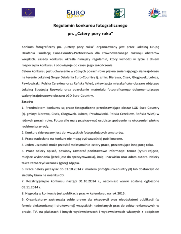 Europejski Fundusz Rolny na rzecz Rozwoju Obszarów Wiejskich Regulamin konkursu fotograficznego pn. „Cztery pory roku” Konkurs fotograficzny pn. „Cztery pory roku” organizowany jest przez Lokalną Grupę Działania Fundację Euro-Country-Partnerstwo dla zrównoważonego rozwoju obszarów wiejskich. Zasady konkursu określa niniejszy regulamin, który wchodzi w życie z dniem rozpoczęcia konkursu i obowiązuje do czasu jego zakończenia. Celem konkursu jest uchwycenie w różnych porach roku piękna zmieniającego się krajobrazu na terenie Lokalnej Grupy Działania Euro-Country tj. gmin: Bierawa, Cisek, Głogówek, Lubrza, Pawłowiczki, Polska Cerekiew oraz Reńska Wieś, aktywizacja mieszkańców obszaru objętego Lokalną Strategią Rozwoju oraz pozyskanie materiału fotograficznego dokumentującego walory krajobrazowe obszaru LGD Euro-Country. Zasady: 1. Przedmiotem konkursu są prace fotograficzne przedstawiające obszar LGD Euro-Country (tj. gminy: Bierawa, Cisek, Głogówek, Lubrza, Pawłowiczki, Polska Cerekiew, Reńska Wieś) w różnych porach roku. Fotografie mają przekazywać osobiste spojrzenie na otoczenie i piękno rodzimej przyrody. 2. Konkurs skierowany jest do wszystkich fotografujących amatorów. 3. Prace nadesłane na konkurs nie mogą być wcześniej publikowane. 4. Jeden uczestnik może przesłać maksymalnie cztery prace, prezentujące inną porę roku. 5. Prace należy opisać, powinny zawierać podstawowe informacje: temat (tytuł) zdjęcia, miejsce wykonania (jeżeli jest do sprecyzowania), imię i nazwisko oraz adres autora. Należy także zaznaczyć kierunek (górę) zdjęcia. 6. Prace należy przesyłać do 31.10.2014 r. mailem ([email protected]) lub dostarczyć do siedziby biura na nośniku CD. 7. Rozstrzygnięcie konkursu nastąpi 31.10.2014 r., natomiast wyniki zostaną ogłoszone 05.11.2014 r. 8. Nagrodą w konkursie jest publikacja prac w kalendarzu na rok 2015. 9. Organizatorzy zastrzegają sobie prawo do ekspozycji oraz nieodpłatnej publikacji (w formie elektronicznej i drukowanej) wszystkich nadesłanych prac do celów reklamowych w prasie, TV, na plakatach i innych wydawnictwach i wydawnictwach własnych z podpisem Europejski Fundusz Rolny na rzecz Rozwoju Obszarów Wiejskich nazwiska autora. Nadesłane prace nie będą zwracane. Przesłanie prac wiąże się z przekazaniem praw autorskich do zdjęć Fundacji Euro-Country, oraz praw do publikacji zdjęć w materiałach promocyjnych LGD Euro-Country. 11. Adres, na który należy dostarczyć prace: Fundacja Euro-Country-Partnerstwo dla zrównoważonego rozwoju obszarów wiejskich ul. Parkowa 23, 47-263 Zakrzów, e-mail: [email protected], tel. 77 4875 42 12. Oceny prac dokona powołane przez organizatora jury, które wybierze 12 zdjęć do kalendarza. Werdykt jury będzie ostateczny i nie będzie mógł być kwestionowany. 13. Autorzy zdjęć opublikowanych w kalendarzu, otrzymają 5 kalendarzy do własnej dystrybucji. 14. Nadesłanie zdjęć na konkurs jest jednoznaczne z uznaniem regulaminu. Ostateczną instancją decydującą o interpretacji regulaminu są organizatorzy konkursu. 15. Organizator zastrzega sobie prawo do odwołania konkursu bez podania przyczyn. 16. W sprawach nieregulowanych w niniejszym Regulaminie mają zastosowanie przepisy Kodeksu Cywilnego.