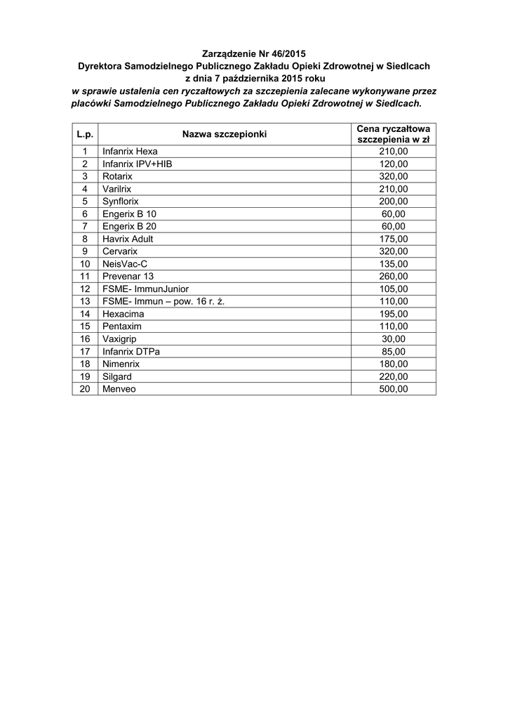 Zarządzenie Nr 46/2015 Dyrektora Samodzielnego Publicznego Zakładu Opieki Zdrowotnej w Siedlcach z dnia 7 października 2015 roku w sprawie ustalenia cen ryczałtowych za szczepienia zalecane wykonywane przez placówki Samodzielnego Publicznego Zakładu Opieki Zdrowotnej w Siedlcach. L.p. 1 2 3 4 5 6 7 8 9 10 11 12 13 14 15 16 17 18 19 20 Nazwa szczepionki Infanrix Hexa Infanrix IPV+HIB Rotarix Varilrix Synflorix Engerix B 10 Engerix B 20 Havrix Adult Cervarix NeisVac-C Prevenar 13 FSME- ImmunJunior FSME- Immun – pow. 16 r. ż. Hexacima Pentaxim Vaxigrip Infanrix DTPa Nimenrix Silgard Menveo Cena ryczałtowa szczepienia w zł 210,00 120,00 320,00 210,00 200,00 60,00 60,00 175,00 320,00 135,00 260,00 105,00 110,00 195,00 110,00 30,00 85,00 180,00 220,00 500,00