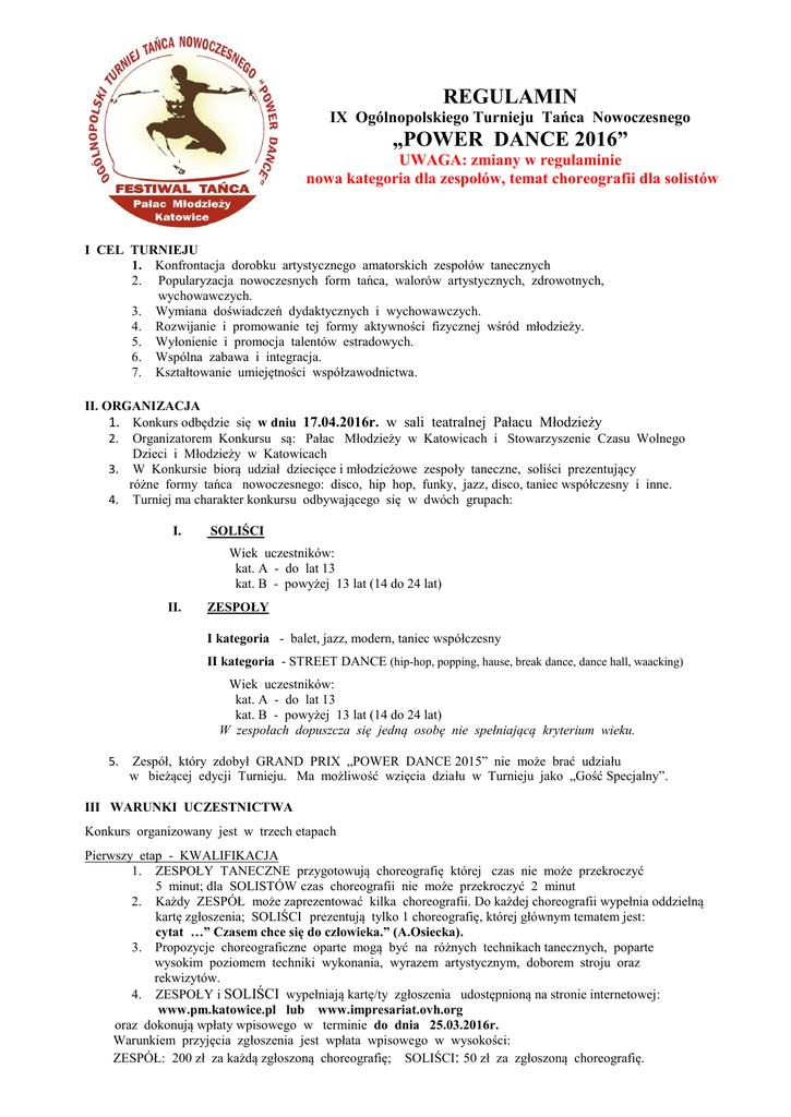 REGULAMIN IX Ogólnopolskiego Turnieju Tańca Nowoczesnego „POWER DANCE 2016” UWAGA: zmiany w regulaminie nowa kategoria dla zespołów, temat choreografii dla solistów I CEL TURNIEJU 1. Konfrontacja dorobku artystycznego amatorskich zespołów tanecznych 2. Popularyzacja nowoczesnych form tańca, walorów artystycznych, zdrowotnych, wychowawczych. 3. Wymiana doświadczeń dydaktycznych i wychowawczych. 4. Rozwijanie i promowanie tej formy aktywności fizycznej wśród młodzieży. 5. Wyłonienie i promocja talentów estradowych. 6. Wspólna zabawa i integracja. 7. Kształtowanie umiejętności współzawodnictwa. II. ORGANIZACJA 1. Konkurs odbędzie się w dniu 17.04.2016r. w sali teatralnej Pałacu Młodzieży 2. Organizatorem Konkursu są: Pałac Młodzieży w Katowicach i Stowarzyszenie Czasu Wolnego Dzieci i Młodzieży w Katowicach 3. W Konkursie biorą udział dziecięce i młodzieżowe zespoły taneczne, soliści prezentujący różne formy tańca nowoczesnego: disco, hip hop, funky, jazz, disco, taniec współczesny i inne. 4. Turniej ma charakter konkursu odbywającego się w dwóch grupach: I. SOLIŚCI Wiek uczestników: kat. A - do lat 13 kat. B - powyżej 13 lat (14 do 24 lat) II. ZESPOŁY I kategoria - balet, jazz, modern, taniec współczesny II kategoria - STREET DANCE (hip-hop, popping, hause, break dance, dance hall, waacking) Wiek uczestników: kat. A - do lat 13 kat. B - powyżej 13 lat (14 do 24 lat) W zespołach dopuszcza się jedną osobę nie spełniającą kryterium wieku. 5. Zespół, który zdobył GRAND PRIX „POWER DANCE 2015” nie może brać udziału w bieżącej edycji Turnieju. Ma możliwość wzięcia działu w Turnieju jako „Gość Specjalny”. III WARUNKI UCZESTNICTWA Konkurs organizowany jest w trzech etapach Pierwszy etap - KWALIFIKACJA 1. ZESPOŁY TANECZNE przygotowują choreografię której czas nie może przekroczyć 5 minut; dla SOLISTÓW czas choreografii nie może przekroczyć 2 minut 2. Każdy ZESPÓŁ może zaprezentować kilka choreografii. Do każdej choreografii wypełnia oddzielną kartę zgłoszenia; SOLIŚCI prezentują tylko 1 choreografię, której głównym tematem jest: cytat …” Czasem chce się do człowieka.” (A.Osiecka). 3. Propozycje choreograficzne oparte mogą być na różnych technikach tanecznych, poparte wysokim poziomem techniki wykonania, wyrazem artystycznym, doborem stroju oraz rekwizytów. 4. ZESPOŁY i SOLIŚCI wypełniają kartę/ty zgłoszenia udostępnioną na stronie internetowej: www.pm.katowice.pl lub www.impresariat.ovh.org oraz dokonują wpłaty wpisowego w terminie do dnia 25.03.2016r. Warunkiem przyjęcia zgłoszenia jest wpłata wpisowego w wysokości: ZESPÓŁ: 200 zł za każdą zgłoszoną choreografię; SOLIŚCI: 50 zł za zgłoszoną choreografię. Opłatę należy przesłać na konto: Stowarzyszenie Czasu Wolnego Dzieci i Młodzieży, 40-066 Katowice, ul. Mikołowska 26 Nr konta: 08 1020 2313 0000 3402 0185 8653 z dopiskiem: „Power Dance” 5. W związku z ograniczoną ilością miejsc w poszczególnych grupach i kategoriach przyjmowanie zgłoszeń może zostać wstrzymane przed terminem (przyjmowane będą zgłoszenia na listę rezerwową, fakt ten będzie widoczny w formularzu zgłoszeniowym) Informacja o zakwalifikowaniu uczestników z listy rezerwowej zostanie przesłana e-mailem po dniu 28.03.2016r. Po otrzymaniu tej informacji należy dokonać wpłaty wpisowego. Drugi etap 1. 2. 3. półfinał - Katowice 17.04.2016r. Prezentacje zgłoszonych choreografii W półfinale system oceniania jest punktowy i niejawny. Jury spośród zaprezentowanych choreografii typuje ZESPOŁY i SOLISTÓW do finału. Trzeci etap finał - Katowice 17.04.2016r. 1. W finale system oceniania jest punktowy i jawny. 2. Spośród wszystkich ZESPOŁÓW biorących udział w finale, zespół który otrzyma najwyższą ilość punktów otrzymuje GRAND PRIX „P0WER DANCE 2016” oraz PUCHAR PREZYDENTA MIASTA KATOWICE Spośród SOLISTÓW biorących udział w finale solista który otrzyma największą ilość punktów w swojej kategorii wiekowej otrzymuje nagrodę za I miejsce i tytuł „Najlepszego Tancerza” 3. Następne w kolejności zespoły z najwyższą liczbą punktów otrzymują pamiątkowe statuetki za I, II i III miejsce w danej kategorii technicznej i wiekowej, a SOLIŚCI za II i III w danej kategorii wiekowej. 4. Wszystkie ZESPOŁY i SOLIŚCI biorący udział w Turnieju (półfinał, finał) otrzymają pamiątkowe dyplomy. IV JURY 1. Półfinał i Finał Komisja Sędziowska będzie oceniała w systemie punktowym od 0 do 6 pkt. 2. W skład 6 osobowego (5 sędziów punktowych + sekretarz) Jury wchodzą pedagodzy szkół baletowych, tancerze i choreografowie cieszący się autorytetem zawodowym; w Jury nie mogą zasiadać osoby, które przygotowały zespoły do Turnieju. 3. Oceniane będą: - Opracowanie choreograficzne, dobór muzyki. - Technika wykonania. - Wyraz artystyczny, interpretacja taneczna tematu w przypadku SOLISTÓW. 5. Maksymalna liczba punktów jaką może zdobyć ZESPÓŁ i SOLISTA w każdym z etapów to 90 pkt. V DANE TECHNICZNE 1. W przypadku przekroczenia limitu wiekowego zespół zostanie zdyskwalifikowany, bez możliwości zwrotu poniesionych kosztów finansowych dotyczących udziału zespołu w Turnieju. 2. Odtwarzanie podkładów możliwe jest z nośnika CD - jedno nagranie na opisanym nośniku lub w formacie MP3 3. W trakcie występu nie wolno używać własnego oświetlenia. 4. Wszyscy uczestnicy zespołów zobowiązani są posiadać aktualną legitymację szkolną lub dowód tożsamości. 5. Instytucje lub osoby fizyczne zgłaszające uczestników do Turnieju winni ubezpieczyć ich na czas przejazdu i pobytu. 6. Zespół powinien posiadać odpowiednią liczbę opiekunów (zgodnie z obowiązującymi przepisami) 7. Instytucje lub osoby fizyczne zgłaszające uczestników pokrywają koszty ich transportu, noclegu i wyżywienia na terenie Katowic. Organizator zapewnia jedynie drob