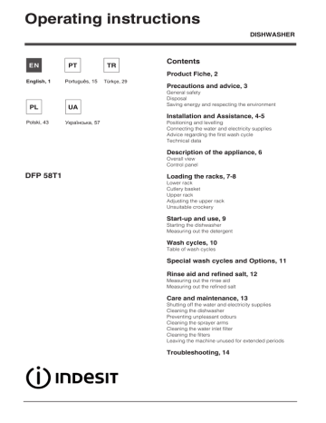 Operating instructions DISHWASHER EN PT TR Contents Product Fiche, 2 English, 1 PL Polski, 43 Português, 15 UA Українська, 57 Türkçe, 29 Precautions and advice, 3 General safety Disposal Saving energy and respecting the environment Installation and Assistance, 4-5 Positioning and levelling Connecting the water and electricity supplies Advice regarding the first wash cycle Technical data Description of the appliance, 6 Overall view Control panel DFP 58T1 Loading the racks, 7-8 Lower rack Cutlery basket Upper rack Adjusting the upper rack Unsuitable crockery Start-up and use, 9 Starting the dishwasher Measuring out the detergent Wash cycles, 10 Table of wash cycles Special wash cycles and Options, 11 Rinse aid and refined salt, 12 Measuring out the rinse aid Measuring out the refined salt Care and maintenance, 13 Shutting off the water and electricity supplies Cleaning the dishwasher Preventing unpleasant odours Cleaning the sprayer arms Cleaning the water inlet filter Cleaning the filters Leaving the machine unused for extended periods Troubleshooting, 14 Product fiche EN Product Fiche Brand INDESIT Model DFP 58T1 Rated capacity in standard place settings (1) 14 Energy efficiency class on a scale from A+++ (low consumption) to D (high consumption) A+ Energy consumption per year in kWh (2) 295.0 Energy consumption of the standard cleaning cycle in kWh 1.04 Power consumption of the off-mode in W 0.5 Power consumption of the left-on mode in W 5.0 Water consumption per year in litres (3) 3080.0 Drying efficacy class on a scale from G (low efficacy) to A (high efficacy) A Programme time for standard cleaning cycle in minutes 190 The duration of the left-on mode in minutes 10 Noise in dB(A) Re 1pW 49 Built-in model No NOTES 1) The information on the label and fiche relates to the standard cleaning cycle, this programme is suitable to clean normally soiled tableware and it is the most efficient programme in terms of combined energy and water consumption. The standard cleaning cycle corresponds to the Eco cycle. 2) Based on 280 standard cleaning cycles using cold water fill and the consumption of the low power modes. Actual energy consumption depends on how the appliance is used. 3) Based on 280 standard cleaning cycles. Actual water consumption depends on how the appliance is used. 2 Precautions and advice This appliance was designed and manufactured in compliance with international safety standards The following information has been provided for safety reasons and should therefore be read carefully. Keep this instruction manual in a safe place for future reference. If the appliance is sold, given away or moved, please ensure the manual is kept with the machine. Please read these instructions carefully: they contain important information on installation, use and safety. This appliance is designed for domestic use or similar applications, for example: - staff kitchen areas in shops, offices and other work environments; - farmhouses; - use by guests in hotels, motels and other residential settings; - bed & breakfasts. General safety • The appliance should not be operated by people (including children) with reduced physical, sensory or mental capacities, or by inexperienced people who are not familiar with the product, unless supervision or instructions on how to use it are provided by someone who assumes responsibility for their safety. • An adult must supervise children at all times to prevent them from playing with the appliance. • The appliance was designed for domestic use inside the home and is not intended for commercial or industrial use. • The appliance must be used by adults only to wash domestic crockery in accordance with the instructions in this manual. • The appliance must not be installed outdoors, even in covered areas. It is extremely dangerous to leave the machine exposed to rain and storms. • Do not touch the appliance when barefoot. • When unplugging the appliance always pull the plug from the mains socket. Do not pull on the cable. • The water supply tap must be shut off and the plug should be removed from the electrical socket before cleaning or maintaining the appliance. • If the appliance breaks down, do not under any circumstances touch the internal parts in an attempt to perform the repair work yourself. • Do not lean or sit on the open door of the appliance: this may cause the appliance to overturn. • The door should not be left open as it may create a dangerous obstacle. • Keep detergent and rinse aid out of reach of children. • The packaging material should not be used as a toy for children. Disposal EN • Disposal of packaging material: observe local legislation so that the packaging may be reused. • The European Directive 2012/19/EU relating to Waste Electrical and Electronic Equipment (WEEE) states that household appliances should not be disposed of using the normal solid urban waste cycle. Exhausted appliances should be collected separately in order to optimise the reusing and recycling rate of the materials inside the machine, while preventing potential damage to the environment and public health. The crossedout dustbin symbol is marked on all products to remind the owners of their obligations regarding separated waste collection. For further information relating to the correct disposal of household appliances, owners may contact the relevant public authority or the local appliance dealer. Saving energy and respecting the environment Saving water and energy • Only begin a wash cycle when the dishwasher is full. While waiting for the dishwasher to be filled, prevent unpleasant odours using the Soak cycle (see Wash cycles). • Select a wash cycle that is suited to the type of crockery and to the soil level of the crockery using the Table of wash cycles: - for dishes with a normal soil level use the Eco wash cycle, which ensures low energy/water consumption levels. - If the load is smaller than usual activate the Half Load 