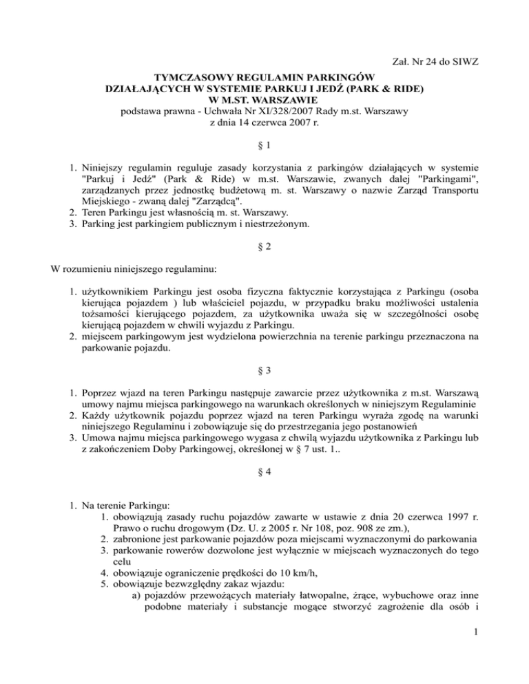 Zał. Nr 24 do SIWZ TYMCZASOWY REGULAMIN PARKINGÓW DZIAŁAJĄCYCH W SYSTEMIE PARKUJ I JEDŹ (PARK & RIDE) W M.ST. WARSZAWIE podstawa prawna - Uchwała Nr XI/328/2007 Rady m.st. Warszawy z dnia 14 czerwca 2007 r. §1 1. Niniejszy regulamin reguluje zasady korzystania z parkingów działających w systemie "Parkuj i Jedź" (Park & Ride) w m.st. Warszawie, zwanych dalej "Parkingami", zarządzanych przez jednostkę budżetową m. st. Warszawy o nazwie Zarząd Transportu Miejskiego - zwaną dalej "Zarządcą". 2. Teren Parkingu jest własnością m. st. Warszawy. 3. Parking jest parkingiem publicznym i niestrzeżonym. §2 W rozumieniu niniejszego regulaminu: 1. użytkownikiem Parkingu jest osoba fizyczna faktycznie korzystająca z Parkingu (osoba kierująca pojazdem ) lub właściciel pojazdu, w przypadku braku możliwości ustalenia tożsamości kierującego pojazdem, za użytkownika uważa się w szczególności osobę kierującą pojazdem w chwili wyjazdu z Parkingu. 2. miejscem parkingowym jest wydzielona powierzchnia na terenie parkingu przeznaczona na parkowanie pojazdu. §3 1. Poprzez wjazd na teren Parkingu następuje zawarcie przez użytkownika z m.st. Warszawą umowy najmu miejsca parkingowego na warunkach określonych w niniejszym Regulaminie 2. Każdy użytkownik pojazdu poprzez wjazd na teren Parkingu wyraża zgodę na warunki niniejszego Regulaminu i zobowiązuje się do przestrzegania jego postanowień 3. Umowa najmu miejsca parkingowego wygasa z chwilą wyjazdu użytkownika z Parkingu lub z zakończeniem Doby Parkingowej, określonej w § 7 ust. 1.. §4 1. Na terenie Parkingu: 1. obowiązują zasady ruchu pojazdów zawarte w ustawie z dnia 20 czerwca 1997 r. Prawo o ruchu drogowym (Dz. U. z 2005 r. Nr 108, poz. 908 ze zm.), 2. zabronione jest parkowanie pojazdów poza miejscami wyznaczonymi do parkowania 3. parkowanie rowerów dozwolone jest wyłącznie w miejscach wyznaczonych do tego celu 4. obowiązuje ograniczenie prędkości do 10 km/h, 5. obowiązuje bezwzględny zakaz wjazdu: a) pojazdów przewożących materiały łatwopalne, żrące, wybuchowe oraz inne podobne materiały i substancje mogące stworzyć zagrożenie dla osób i 1 Zał. Nr 24 do SIWZ mienia, b) pojazdów, których dopuszczalna masa całkowita przekracza 3,5 t., c) pojazdów z naczepami i przyczepami, d) pojazdów pełniących funkcje obwoźnych sklepów, e) pojazdów campingowych (campervan), 2. Pojazd po ustawieniu na miejscu parkingowym powinien być unieruchomiony, mieć wyłączony zapłon, światła, zamknięte okna, drzwi oraz bagażnik; użytkownik zobowiązany jest do wyłączenia pozostawionych w pojeździe urządzeń radiofonicznych. 3. W czasie postoju na miejscu parkingowym zabronione jest pozostawianie w pojeździe zwierząt, 4. Użytkownik we własnym zakresie zabezpiecza swój pojazd przed kradzieżą. §5 1. Miasto st. Warszawa nie ponosi odpowiedzialności za jakiekolwiek szkody powstałe w wyniku kradzieży (włamania, rozboju itp.) rabunku, zniszczenia lub uszkodzenia pojazdów znajdujących się na terenie Parkingu, jak również rzeczy w nich pozostawionych lub stanowiących ich wyposażenie. 2. Wyłącza się odpowiedzialność Miasta st. Warszawy z tytułu szkód komunikacyjnych i parkingowych dotyczących pojazdów i osób korzystających z Parkingu. §6 1. Parking jest czynny 7 dni w tygodniu w godzinach 430 - 230, z codzienną przerwą na konserwację Parkingu od godz. 230 do godz. 430, za wyjątkiem: a) 1 stycznia - Nowy Rok, b) pierwszego dnia Wielkiej Nocy, c) drugiego dnia Wielkiej Nocy, d) 1 maja - Święto Państwowe, e) 3 maja - Święto Narodowe Trzeciego Maja, f) pierwszego dnia Zielonych Świątek, g) dzień Bożego Ciała, h) 15 sierpnia - Wniebowzięcie Najświętszej Maryi Panny, i) 1 listopada - Wszystkich Świętych, j) 11 listopada - Narodowe Święto Niepodległości, k) 25 grudnia - pierwszy dzień Bożego Narodzenia, l) 26 grudnia - drugi dzień Bożego Narodzenia. 2. O otwarciu Parkingu w godzinach lub dniach innych niż wymienione w ust. 1 decyduje Zarządca * 3. W szczególnie uzasadnionych przypadkach Zarządca może podjąć decyzje o okresowym wyłączeniu Parkingów z użytkowania lub zmianie godzin otwarcia Parkingu. 2 Zał. Nr 24 do SIWZ §7 1. Pod pojęciem Doby Parkingowej należy rozumieć okres czasu trwający od godz. 430 do godz. 230 dnia następnego lub określony na podstawie § 6 ust. 2 albo 3. 2. Poza Dobą Parkingową obowiązuje zakaz parkowania pojazdów na terenie Parkingu. 3. W przypadku stwierdzenia pozostawienia pojazdu na terenie Parkingu poza Dobą Parkingową obsługa Parkingu powiadamia Straż Miejską m.st. Warszawy. §8 1. W przypadku naruszenia przez użytkownika postanowień niniejszego Regulaminu Miasto st. Warszawa może rozwiązać umowę najmu miejsca parkingowego bez wypowiedzenia w trybie natychmiastowym oraz zastosować środki niezbędne dla przywrócenia stanu zgodnego z Regulaminem, w tym również poprzez usunięcie pojazdu z Parkingu. 2. W przypadkach określonych w ust. 1 użytkownik zobowiązany jest do pokrycia kosztów związanych z usunięciem pojazdu z Parkingu oraz jego zabezpieczeniem i przechowaniem do czasu odbioru pojazdu przez użytkownika. 3. Użytkownik ponosi odpowiedzialność za wszelkie szkody spowodowane przez pojazd lub powstałe w związku z korzystaniem z miejsca parkingowego, w szczególności z tytułu zanieczyszczenia powierzchni parkingu na skutek wycieku płynów z pojazdu (wyciek oleju, płynu hamulcowego, płynu chłodniczego itp.). §9 Zakazane jest parkowanie pojazdów samochodowych na miejscach parkingowych przeznaczonych dla osób niepełnosprawnych innym osobom niż użytkownikom pojazdów posiadających ważną kartę parkingową, o której mowa w art. 8 ustawy - Prawo o ruchu drogowym, umieszczoną każdorazowo w widocznym miejscu za przednią szybą pojazdu. § 10 1. Użytkownik zobowiązany jest do uiszczenia przy wyjeździe z Parkingu jednorazowej opłaty za wynajem miejsca p