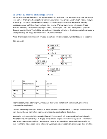 St. Louis, 23 marca. Eliminacje Swissa Jak co roku, ostatnie dwa dni to turniej teamów na dochodzenie. Pierwszego dnia gra się eliminacje, z których do finału przechodzi połowa teamów. Wystarczy więc przyjść „na średnią”. Naszej drużynie przez długi czas groziło wypadnięcie. Po sesji popołudniowej byliśmy 3 oczka poniżej średniej i niespodziewanie trafiliśmy dwukrotnie na silne teamy. W pierwszym meczu wieczorem Diego Brenner (Brazylia) zasunął nam pięknego szlema, a w drugim - silna para amerykańska (odpadli dopiero w ćwierćfinale Vanderbilta) obłożyli nam 3 bez atu, wistując w drugiego waleta (co prawda w kolor partnera), ale mając do wyboru wist z KDWxx w kierach. Przed dwoma ostatnimi meczami sytuacja zaczęła się robić niewesoła. Tym bardziej, że w rozdaniu: Obie po partii. ♠ ♥ ♦ ♣ ♠ 9 5 ♥ 4 W ♦ D W 10 8 5 ♣ A K W 6 5 ♠ ♥ ♦ ♣ D W 10 6 A 10 6 42 9843 N S K DW9873 AK963 10 W N E Mazurkiewicz Pas S Jassem 1♥ 2♣ (?) Pas Pas 2♥ 4♥ 4♦ Pas 2♠ Pas ♠ A 8 7 4 3 2 E ♥ K 5 2 ♦ 4 ♣ D 7 2 Naprowadzony moją odzywką 4♦, wskazującą duży układ na kolorach czerwonych, przeciwnik zawistował w singla kier! Zabiłem asem i zagrałem pika do króla. E wskoczył asem i zagrał w karo. Za chwilę E doszedł królem kier, skomunikował się treflem z partnerem i dostał przebitkę karo. Bez jednej. Na drugim stole, po mniej informacyjnej licytacji (Pafnucy milczał, Nowosadzki wchodził pikami), Paweł zawistował asem trefl, a w drugiej lewie zmienił na pika. Michał wskoczył asem i odwrócił w pika. Rozgrywający wyrzucił karo, a następnie zagrał w asa kier i kiera. Nowosadzki przepuścił. As karo i król karo, Nowosadzki wciąż odmawia wykorzystania swojego króla atutowego. Karo przebite i dopiero wtedy Michał nadbija królem, odchodzi treflem i i obrona bierze jeszcze jedną lewę. Bez jednej i remis. W pozostałych rozdaniach przeciwnicy nie byli aż tak groźni. Wygrywamy wysoko i wchodzimy w strefę awansu. Ostatniego meczu nie wolno jednak przegrać. Siadam tym razem do gry w parze z Piotrem Tuszyńskim, Marcin Mazurkiewicz odpoczywa. Tusio pokazuje swój słynny lwi pazur. ♠ ♥ ♦ ♣ W 10 7 6 4 AW4 DW9 AD ♠ 5 ♠ A D 9 8 N ♥ 3 W E ♥ D 10 7 6 2 ♦ A 10 7 3 ♦ 8 6 5 ♣ K 9 8 7 6 5 4 ♣ 10 S ♠ K 3 2 ♥ K 9 8 5 ♦ K 4 2 ♣ W 3 2 Po partii. Obi W N Tuszyński 3♣ ? E S Jassem pas Na drugim stole N w tej samej pozycji wszedł 3♠, które zostało podniesione do czterech. Kontra i bez jednej. Tusio zalicytował 3BA! Po wiście w kiera nadskoczyła ósma lewa. Ustawienie wpustki przeciwko graczowi E na lewę dziewiątą to już była dla Piotra bułka z masłem. Mecz wygraliśmy 15-ma impasami i awansowaliśmy do dzisiejszego finału (64 teamy) z wynikiem 9 VP na średnią. Nie dostaniemy za ten wynik wysokiego carry over.