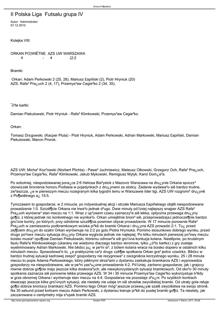 Gmina Po¶wiêtne II Polska Liga Futsalu grupa IV Autor: Administrator 07.12.2010. Kolejka VIII: ORKAN PO¦WIÊTNE AZS UW WARSZAWA 4 4 (2:2 Bramki: Orkan: Adam Perkowski 2 (25, 28), Mariusz £apiñski (2), Piotr Hryniuk (20) AZS: Rafa³ Pra¿uch 2 (4, 17), Przemys³aw Cegie³ko 2 (34, 35). ¯ó³te kartki: Damian Piekutowski, Piotr Hryniuk - Rafa³ Klimkowski, Przemys³aw Cegie³ko. Orkan: Tomasz Dr±gowski, (Kacper Pluta) - Piotr Hryniuk, Adam Perkowski, Adrian Markowski, Mariusz £apiñski, Damian Piekutowski, Marcin Prorok. AZS UW: Micha³ Koz³owski (Norbert Plichta) - Pawe³ Juchniewicz, Mateusz Olkowski, Grzegorz Och, Rafa³ Pra¿uch, Przemys³aw Cegie³ko, Rafa³ Klimkowski, Jakub Mykowski, Remigiusz Mytyk, Karol Dom¿a³a. Po sobotniej, niespodziewanej pora¿ce 2:6 Heliosa Bia³ystok z Mazovi± Warszawa na dru¿ynie Orkana spocz±³ obowi±zek bronienia honoru Podlasia w pojedynkach z dru¿ynami ze stolicy. Zadanie wydawa³o siê bardzo trudne, zw³aszcza, ¿e w pierwszym meczu rozegranym kilka tygodni temu w Warszawie lider ligi, AZS UW rozgromi³ dru¿ynê z Po¶wiêtnego a¿ 15:5. Tymczasem to gospodarze, w 2 minucie, po indywidualnej akcji i strzale Mariusza £apiñskiego objêli niespodziewane prowadzenie 1:0. Szczê¶cie Orkana nie trwa³o jednak d³ugo. Dwie minuty pó¼niej najlepszy snajper AZS Rafa³ Pra¿uch wyrówna³ stan meczu na 1:1. Wraz z up³ywem czasu zaznaczy³a siê lekka, optyczna przewaga dru¿yny go¶ci, z której jednak nic konkretnego nie wynika³o. Orkan umiejêtnie broni³ siê, przeprowadzaj±c jednocze¶nie bardzo gro¼ne kontry, po których, przy odrobinie szczê¶cia powinien obj±æ prowadzenie. W 17 minucie ponownie Rafa³ Pra¿uch w zamieszaniu podbramkowym wciska pi³kê do bramki Orkana i dru¿yna AZS prowadzi 2:1. Tu¿ przed zej¶ciem dru¿yn do szatni Orkan wyrównuje na 2:2 po golu Piotra Hryniuka. Pomimo stosunkowo dobrego wyniku, przed drug± po³ow± meczu sytuacja dru¿yny Orkana wygl±da jednak nie najlepiej. Po kilku minutach pierwszej po³owy meczu boisko musia³ opu¶ciæ Damian Piekutowski, któremu odnowi³a siê gro¼na kontuzja kolana. Nastêpnie, po brutalnym faulu Rafa³a Klimkowskiego (ukarany nie wiadomo dlaczego bardzo skromnie, tylko ¿ó³t± kartk±) z gry zostaje wyeliminowany Adrian Markowski. Nie bêd±c ju¿ w pe³ni si³, z bólem kolana wraca na boisko dopiero w ostatnich kilku minutach meczu. Spowodowa³o to, ¿e praktycznie ca³± drug± czê¶æ spotkania Orkan gra³ jedn± czwórk±. Bêd±c w bardzo trudnej sytuacji kadrowej zespó³ gospodarzy nie rezygnowa³ z osi±gniêcia korzystnego wyniku. 25 i 28 minuta meczu to popis Adama Perkowskiego, który piêknymi strza³ami z dystansu zaskakuje bramkarza AZS i wyprowadza gospodarzy na niespodziewane, ale w pe³ni zas³u¿one prowadzenie 4:2. Pó¼niej, zarówno gospodarze, jak i graj±cy równie dobrze go¶cie maj± jeszcze kilka doskona³ych, ale niewykorzystanych sytuacji bramkowych. Od oko³o 30 minuty spotkania zaznacza siê ponownie lekka przewaga AZS. W 34 i 35 minucie Przemys³aw Cegie³ko wykorzystuje b³êdy w grze obronnej Orkana i wyrównuje stan meczu na 4:4. Gospodarze nie pozostaj± d³u¿ni. Po szybkich kontrach stwarzaj± jeszcze kilka gro¼nych sytuacji, ale niestety nie udaje im siê strzeliæ zwyciêskiej bramki. Od utraty gola ratuje go¶ci dobrze broni±cy bramkarz AZS. Pomimo tego Orkan móg³ jeszcze przewa¿yæ szalê zwyciêstwa na swoj± stronê. Na 30 sekund przed koñcem meczu Adam Perkowski, z dystansu kieruje pi³kê do pustej bramki go¶ci. Ta niestety, jak zaczarowana o centymetry mija s³upek bramki AZS. http://www.gminaposwietne.vipserv.org Kreator PDF Utworzono 7 March, 2017, 05:06 Gmina Po¶wiêtne Podsumowuj±c ca³y mecz nie da siê ukryæ, i¿ pod wzglêdem piêkna i p³ynno¶ci gry lepiej prezentowali siê go¶cie z Warszawy. Analizuj±c jednak sytuacje bramkowe oraz przebieg ca³ego spotkania nie ulega w±tpliwo¶ci, ¿e by³ to mecz, w którym AZS uzyska³ szczê¶liwy dla niego remis. Po przegranej Heliosa z Mazovi±, uzyskany przez go¶ci wynik umocni³ AZS UW na pozycji lidera ligi. Relacja z meczu równie¿ na http://www.azsuw.pl/ Tabela II ligi grupa: Poz. Dru¿yna m pkt bramki ró¿nica bramek 1 AZS UW Warszawa 8 17 40 - 14 +26 2 Elhurt Helios Bia³ystok 8 15 http://www.gminaposwietne.vipserv.org Kreator PDF Utworzono 7 March, 2017, 05:06 Gmina Po¶wiêtne 42 - 22 +20 3 UKS Orkan Po¶wiêtne 8 13 40 - 43 -3 4 Bia³o-Niebiescy Suwa³ki 8 12 23 - 30 -7 5 Mazovia FC Warszawa 8 10 33 - 27 +6 http://www.gminaposwietne.vipserv.org Kreator PDF Utworzono 7 March, 2017, 05:06 Gmina Po¶wiêtne 6 Jantar Ostro³êka 8 3 14 - 56 -42 W klasyfikacji najlepszych strzelców prowadzi zawodnik Orkana Po¶wiêtne, Mariusz £apiñski, który dotychczas strzeli³ 15 goli przed Rafa³em Pra¿uchem (AZS UW) 11 goli. Klasyfikacja strzelców: Mariusz £apiñski (Orkan) 15 Rafa³ Pra¿uch (AZS UW) 11 Przemys³aw Cegie³ko (AZS UW) 10 Adam Perkowski (Orkan) 10 Tomasz Jarz±bski (Bia³o-Niebiescy) 8 Tadeusz Kie³biewski (Mazovia) 8 Jakub Bud¼ko (Helios) 7 Piotr Hryniuk (Orkan) 7 Andrzej Januszewski (Mazovia) 7 Sebastian Koz³owski (Helios) 6 Remigiusz Mytyk (AZS UW) 6 Karol Domalewski (Helios) 5 Tomasz Koniczek (Helios) 5 Adrian Markowski (Orkan) 5 Program IX kolejki 11-12 grudnia 2010 r Orkan Po¶wiêtne Mazovia Warszawa 11.12.2010 r, godz. 14.00 Jantar Ostro³êka Helios Elhurt Bia³ystok AZS Warszawa Bia³o Niebiescy Suwa³ki http://www.gminaposwietne.vipserv.org Kreator PDF Utworzono 7 March, 2017, 05:06
