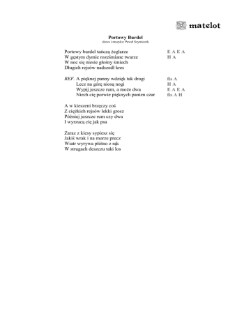+ matelot Portowy Burdel słowa i muzyka: Paweł Szymiczek Portowy burdel tańczą żeglarze W gęstym dymie roześmiane twarze W noc się niesie głośny śmiech Długich rejsów nadszedł kres EAEA HA REF. A pięknej panny wdzięk tak drogi Lecz na górę niosą nogi Wypij jeszcze rum, a może dwa Niech cię porwie pięknych panien czar fis A HA EAEA fis A H A w kieszeni brzęczy coś Z ciężkich rejsów lekki grosz Później jeszcze rum czy dwa I wyrzucą cię jak psa Zaraz z kiesy sypiesz się Jakiś wrak i na morze precz Wiatr wyrywa płótno z rąk W strugach deszczu taki los