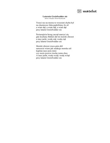 + matelot Latarnia Greisfwalder oie słowa i muzyka: Paweł Szymiczek Trzeci raz na morzu to wrzesień chyba był na chusteczce foka pędziliśmy ile sił a wiatr dął, a wiatr dął, a wiatr dął przy latarni Greisfwalder oie Świnoujścia brzeg zaczął marzyć się gdy kochany Bałtyk dał mi morski chrzest a nasz jacht, wodę ciął, wodę ciął przy latarni Greisfwalder oie Morski chrzest rzuca góra dół nareszcie wiem jak smakuje morska sól kapitan nasz pyta mnie czy może jeszcze trochę rumu chcę A nasz jacht, wodę wziął, wodę wziął przy latarni Greisfwalder oie