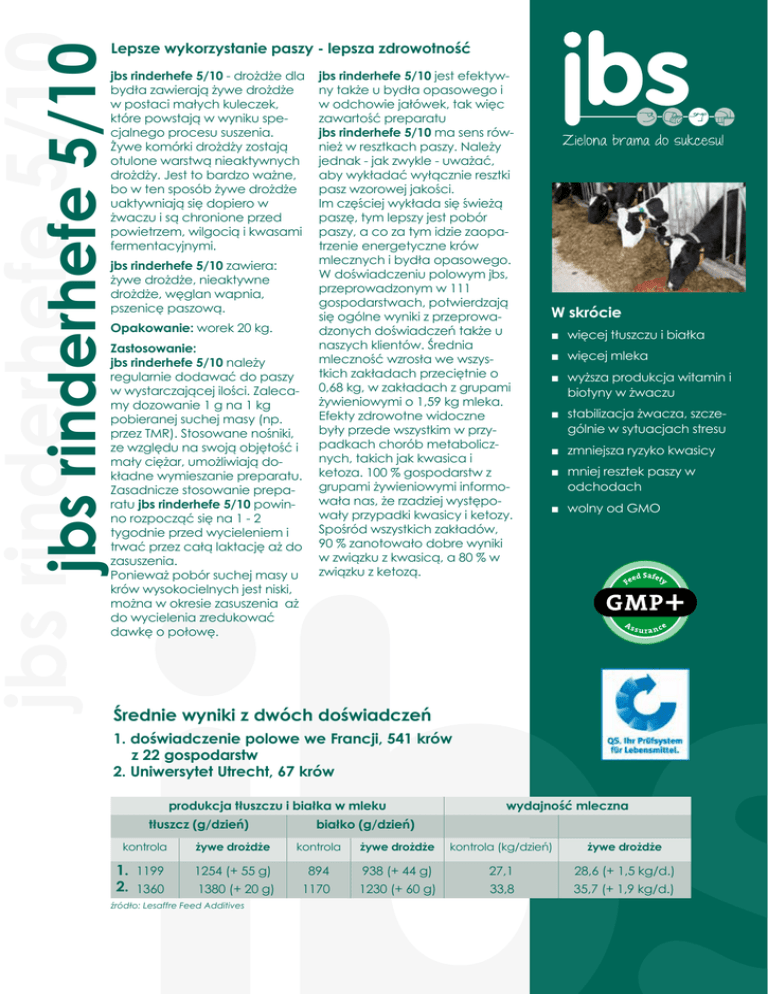 jbs rinderhefe 5/10 jbs rinderhefe 5/10 Lepsze wykorzystanie paszy - lepsza zdrowotność jbs rinderhefe 5/10 - drożdże dla bydła zawierają żywe drożdże w postaci małych kuleczek, które powstają w wyniku specjalnego procesu suszenia. Żywe komórki drożdży zostają otulone warstwą nieaktywnych drożdży. Jest to bardzo ważne, bo w ten sposób żywe drożdże uaktywniają się dopiero w żwaczu i są chronione przed powietrzem, wilgocią i kwasami fermentacyjnymi. jbs rinderhefe 5/10 zawiera: żywe drożdże, nieaktywne drożdże, węglan wapnia, pszenicę paszową. Opakowanie: worek 20 kg. Zastosowanie: jbs rinderhefe 5/10 należy regularnie dodawać do paszy w wystarczającej ilości. Zalecamy dozowanie 1 g na 1 kg pobieranej suchej masy (np. przez TMR). Stosowane nośniki, ze względu na swoją objętość i mały ciężar, umożliwiają dokładne wymieszanie preparatu. Zasadnicze stosowanie preparatu jbs rinderhefe 5/10 powinno rozpocząć się na 1 - 2 tygodnie przed wycieleniem i trwać przez całą laktację aż do zasuszenia. Ponieważ pobór suchej masy u krów wysokocielnych jest niski, można w okresie zasuszenia aż do wycielenia zredukować dawkę o połowę. jbs rinderhefe 5/10 jest efektywny także u bydła opasowego i w odchowie jałówek, tak więc zawartość preparatu jbs rinderhefe 5/10 ma sens również w resztkach paszy. Należy jednak - jak zwykle - uważać, aby wykładać wyłącznie resztki pasz wzorowej jakości. Im częściej wykłada się świeżą paszę, tym lepszy jest pobór paszy, a co za tym idzie zaopatrzenie energetyczne krów mlecznych i bydła opasowego. W doświadczeniu polowym jbs, przeprowadzonym w 111 gospodarstwach, potwierdzają się ogólne wyniki z przeprowadzonych doświadczeń także u naszych klientów. Średnia mleczność wzrosła we wszystkich zakładach przeciętnie o 0,68 kg, w zakładach z grupami żywieniowymi o 1,59 kg mleka. Efekty zdrowotne widoczne były przede wszystkim w przypadkach chorób metabolicznych, takich jak kwasica i ketoza. 100 % gospodarstw z grupami żywieniowymi informowała nas, że rzadziej występowały przypadki kwasicy i ketozy. Spośród wszystkich zakładów, 90 % zanotowało dobre wyniki w związku z kwasicą, a 80 % w związku z ketozą. W skrócie ■ więcej tłuszczu i białka ■ więcej mleka ■ wyższa produkcja witamin i biotyny w żwaczu ■ stabilizacja żwacza, szczególnie w sytuacjach stresu ■ zmniejsza ryzyko kwasicy ■ mniej resztek paszy w odchodach ■ wolny od GMO Średnie wyniki z dwóch doświadczeń 1. doświadczenie polowe we Francji, 541 krów z 22 gospodarstw 2. Uniwersytet Utrecht, 67 krów produkcja tłuszczu i białka w mleku tłuszcz (g/dzień) wydajność mleczna białko (g/dzień) kontrola żywe drożdże kontrola żywe drożdże kontrola (kg/dzień) żywe drożdże 1. 1199 2. 1360 1254 (+ 55 g) 894 938 (+ 44 g) 27,1 28,6 (+ 1,5 kg/d.) 1380 (+ 20 g) 1170 1230 (+ 60 g) 33,8 35,7 (+ 1,9 kg/d.) źródło: Lesaffre Feed Additives Analiza sitowa Analiza sitowa jest najprostszym sposobem kontroli przebiegu procesów trawiennych u krów. Próbka kału zostaje umieszczona na sitku i przepłukiwana jest wodą, dopóki nie stanie się ona przejrzysta. Na sitku zostają tylko niestrawione resztki paszy. Ich ilość i rodzaj jest wskaźnikiem intensywności trawienia. Po skarmianiu drożdżami widać od razu, że ilość resztek znacznie się zmniejsza. Najbardziej widoczna jest redukcja niestrawionych ziaren kukurydzy. Działanie na żwacz drożdży Saccharomyces cerevisiae, zawartych w jbs rinderhefe 5/10 Żywe drożdże usuwają tlen ze żwacza Tlen działa toksycznie na większość mikroorganizmów żwacza. Zredukowanie ilości tlenu przez drożdże umożliwia rozwój organizmów rozkładających celulozę. Efekty można zauważyć już po niedługim czasie w odchodach zwierząt (patrz: analiza sitowa). Zmniejsza się w nich ilość niestrawionych włókien i ziaren. Po związaniu tlenu przez drożdże zwiększa się też ilość wolnego wodoru, który zostaje zużyty do produkcji kwasu propionowego. Zarówno w okresie zasuszenia (kiedy zwierzęta skarmiane są paszami ubogimi w energię), jak również w okresie laktacji produkcja kwasu propionowego w żwaczu rośnie. W wątrobie zostanie on później przekształcony w dostarczającą energię glukozę. Zawartość propionianu w mMol gr. kontrolna żywe drożdże S.c.47 30 29,1 25 20 15 pasza bez dodatku żywych drożdży + 24 % + 60 % + 43 % 18,1 18,0 19,7 25,8 15,9 10 5 0 kr. zasuszona kr. w laktacji, 33 kg mleka kr. w laktacji, 45 kg mleka źródło: Lesaffre Feed Additives Żywe drożdże utrzymują pH żwacza w optymalnym zakresie pasza z dodatkiem żywych drożdży Mikroorganizmy rozkładające kwas mlekowy gr. kontrolna * 4 3,5 żywe drożdże S.c.47 istotne * 3 2,5 2 1,5 1 * 0,5 Megasparea źródło: Prifysgol Aberystwyth Selenomonas Bakterie wykorzystujące kwas mlekowy są szczególnie stymulowane i ich populacja w żwaczu zdecydowanie rośnie. Wzmożona przemiana kwasu mlekowego w kwas propionowy zmniejsza ryzyko kwasicy w przypadku skarmiania wysokoenergetycznymi racjami. Żwacz - przekrój Stabilizacja wartości pH Przy karmieniu racjami wysokoenergetycznymi stabilizacja wartości pH w żwaczu ma szczególne znaczenie (patrz grafika). Przy niskim poziomie mleczności, do wykarmienia krowy pod względem energetycznym wystarczy pasza bogata we włókno (biała linia) Jeżeli mleczność wzrasta, wzrasta zapotrzebowanie na racje wysokoenergetyczne składające się z bogatych w skrobię pasz lub pasz treściwych. Podczas rozkładu skrobi / węglowodanów zawartych w tych paszach dochodzi w żwaczu do wzmożonej produkcji kwasu mlekowego i w efekcie do obniżenia wartości pH (jasnozielona linia). Przy wartościach pH poniżej 5,8 istnieje ryzyko, że nastąpi obumarcie dużej liczby bakterii żwacza, a błona śluzowa żwacza zostanie nieodwracalnie uszkodzona przez kwasy. Przy rozpadzie bakterii uwolnio