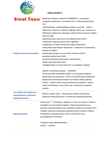 OPIS OFERTY Realizacja imprezy autokarami PREMIUM to gwarancja transportu autokarami z roczników 2015 i 2016 produkcji Irizar i VDL indywidualnego, multimedialnego systemu rozrywki - tablet z dotykowym ekranem w każdym zagłówku (filmy, gry, muzyka itp.). Możliwość podłączenia własnego nośnika danych poprzez wejście AUX lub USB. najwyższej klasy skórzanych lub półskórzanych foteli z możliwością regulacji oparcia lub/i zagłówka największej w Polsce przestrzeni między siedzeniami małej półki przed każdym siedzeniem + siateczki na czasopisma, książki czy telefon Przejazd autokarem premium bezpłatnego dostępu do sieci WiFi na terenie Polski* gniazdek elektrycznych 230V wydajnej klimatyzacji sterowanej indywidualnie bogato wyposażonego barku udostępnionego w czasie jazdy WC na pokładzie autokaru Idealna i komfortowa podróż… ZAWSZE! Na ternie Polski GWARANTUJEMY, że wszystkie przejazdy realizowane są autobusem, busem lub samochodem osobowym. Zapewnimy komfortowy transport na każdym etapie podróży. Ważne - Autokar Premium jest autokarem docelowym. *jakość usług internetowych może różnić się w zależności od jakości sygnału Tour guide oprowadzanie z indywidualnym systemem nagłośnieniowym Mobilny zestaw audio - indywidulany zestaw słuchawkowy połączony bezprzewodowo z mikrofonem pilota/przewodnika. Hotel Avion *** w Świdniku, oddalony o 12 km od centrum Lublina, z dostępem do komunikacji miejskiej. Pokoje wyposażone są w łazienkę, telewizję kablową oraz bezpłatny dostęp do Internetu Wi-Fi. Program wycieczki przewiduje zakwaterowanie w jednym miejscu. Zakwaterowanie Przykładowe zakwaterowanie, które może różnić się w poszczególnych terminach. Dostępne opcje zakwaterowania pokój 2 - osobowy pokój 3 - osobowy dokwaterowanie (bez dopłat*) lub pokój 1 - osobowy (dopłata) wyżywienie HB - 3 śniadania i 3 obiadokolacje Dostępne opcje wyżywienia śniadania bufet - pieczywo, ser, szynka, jajka lub parówki itp., napoje - kawa, herbata, sok obiadokolacje serwowane - zupa, danie główne, sałatka/deser/owoc; napoje do obiadokolacji dodatkowo płatne gwarancja wyboru miejsca w autokarze Pakiet komfort napoje w autokarze w cenie (6 x do wyboru - kawa, herbata, zimny napój 0,2l) cena - 50 zł/os gwarancja wyboru miejsca w autokarze napoje w autokarze w cenie (6 x do wyboru - kawa, herbata, zimny napój 0,2l) Pakiet prestige pierwszeństwo wejścia na pokład autokaru nadbagaż 5 kg w cenie napoje do obiadokolacji (0,2l) cena - 100 zł/os W związku z powołaniem do życia w dniu 26.11.2016 Turystycznego Funduszu Gwarancyjnego każdy klient Biura Podróży zobowiązany jest do zapłaty kwoty w wysokości 10zł/os. przy każdorazowej Turystyczny fundusz gwarancyjny rezerwacji imprezy turystycznej (obowiązuje od dnia 26.11.2016). Kwota przeznaczona na Turystyczny Fundusz Gwarancyjny zostanie automatycznie doliczona do wartości rezerwacji (w momencie jej dokonania). Wyjątkiem są imprezy turystyczne odbywające się w krajach posiadających granicę z Rzeczpospolitą Polską. Składka nie jest przychodem biura. Ubezpieczenie Warunki ubezpieczenia Bezpieczne Podróże Signal Iduna Warunki ubezpieczenia Kosztów Imprezy Turystycznej Signal Iduna przejazd autokarem klasy PREMIUM (powiększona przestrzeń między siedzeniami, multimedialny system rozrywki, klimatyzacja, DVD, WC, barek) zakwaterowanie - 3 noclegi w hotelu *** Cena obejmuje wyżywienie HB - 3 śniadania i 3 obiadokolacje ubezpieczenie Signal Iduna KL 10000 €, NNW 10000 zł, bagaż (utrata 500 zł) opiekę pilota realizację programu w oparciu o system TOUR GUIDE Dopłaty wymagane na miejscu koszty programowe (bilety wstępu do zwiedzanych obiektów, lokalni przewodnicy, opłatę klimatyczną w hotelu) - 55 zł/os. - płatne obowiązkowo u pilota w autokarze; koszty nie podlegają rozliczeniu program jest programem ramowym – kolejność realizacji może ulec zmianie lub odwróceniu pilot nie oprowadza po obiektach muzealnych, centrach Informacje dodatkowe historycznych i innych obiektach turystycznych * dokwaterowanie (Warunki Uczestnictwa §16, pkt. 11) cena nie obejmuje dodatkowych posiłków, napoi oraz wydatków własnych dokumenty - dowód osobisty lub paszport DZIEŃ 1 (czwartek) Wyjazd ze Szczecina. Przejazd przez Polskę. Przyjazd do Kazimierza Dolnego około południa. Zwiedzanie Starego Miasta - około 2h. Następnie czas wolny. W godzinach popołudniowych przejazd do Nałęczowa . Wizyta w Domu Zdrojowym, gdzie mieści się Pijalnia Wód Mineralnych oraz Pijalnia Czekolady (wstęp dla chętnych). Następnie przejazd do hotelu w okolicy Lublina. Obiadokolacja. Nocleg. (Trasa zwiedzania i przejazd do hotelu ok. 80 km) DZIEŃ 2 (piątek) Śniadanie. Przejazd do Lublina . Zwiedzanie miasta z przewodnikiem. W programie - Wzgórze Zamkowe, Neogotycki Zamek Lubelski (zwiedzanie Kaplicy Trójcy Świętej jednego z najciekawszych i najcenniejszych zabytków sztuki Program ramowy średniowiecznej w Europie, miejsce, gdzie wśród bajecznie kolorowych fresków spotykają się dwie kultury - Wschodu i Zachodu) oraz Stare Miasto o przepięknej, magicznej zabudowie, z charakterystycznymi wąskimi uliczkami. Następnie czas wolny. Wieczorem powrót do hotelu. Obiadokolacja. Nocleg. (Trasa ok. 30 km) DZIEŃ 3 (sobota) Śniadanie. Przejazd do Zamościa . Zwiedzanie miasta z przewodnikiem - około 3,5h. Następnie czas wolny. Powrót do hotelu w godzinach popołudniowych. Obiadokolacja. Nocleg. (Trasa ok. 170 km) DZIEŃ 4 (niedziela) Śniadanie. Wykwaterowanie z hotelu. Przejazd do Sandomierza . Zwiedzanie miasta z przewodnikiem - około 4h. Następnie czas wolny. Wyjazd w drogę powrotną ok. godz. 16 - 00. Powrót do Szczecina w godzinach nocnych. ubezpieczenie od chorób przewlekłych i nowotworowych KL 20000 Dopłaty opcjonalne euro, NNW 10000 zł, bagaż (utrata 500 zł) - 120 zł/os. ubezpieczenie od kosztów rezygnacji - 3,5% wartości rezerwacji pakiet komfor