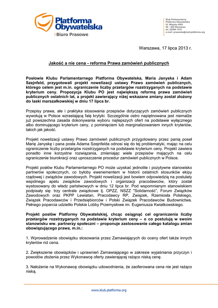 Klub Parlamentarny Platforma Obywatelska Ul. Wiejska 4/6/8 00 – 902 Warszawa tel. 22/694 1515 e-mail: [email protected] Biuro Prasowe Warszawa, 17 lipca 2013 r. Jakość a nie cena - reforma Prawa zamówień publicznych Posłowie Klubu Parlamentarnego Platforma Obywatelska, Maria Janyska i Adam Szejnfeld, przygotowali projekt nowelizacji ustawy Prawo zamówień publicznych, którego celem jest m.in. ograniczenie liczby przetargów rozstrzyganych na podstawie kryterium ceny. Propozycja Klubu PO jest największą reformą prawa zamówień publicznych ostatnich lat, a projekt zawierający niżej wskazane zmiany został złożony do laski marszałkowskiej w dniu 17 lipca br. Przepisy prawa, ale i praktyka stosowania przepisów dotyczących zamówień publicznych wywołują w Polsce wzrastającą falę krytyki. Szczególnie ostro napiętnowana jest niemalże już powszechna zasada dokonywania wyboru najlepszych ofert na podstawie wyłącznego albo dominującego kryterium ceny, z pominięciem lub marginalizowaniem innych kryteriów, takich jak jakość. Projekt nowelizacji ustawy Prawo zamówień publicznych przygotowany przez panią poseł Marię Janyskę i pana posła Adama Szejnfelda odnosi się do tej problematyki, mając na celu ograniczenie liczby przetargów rozstrzyganych na podstawie kryterium ceny. Projekt zawiera ponadto inne korzystne rozwiązania, zmieniając wiele przepisów mających na celu ograniczenie biurokracji oraz uproszczenie procedur zamówień publicznych w Polsce. Projekt posłów Klubu Parlamentarnego PO może uzyskać jednolite i pozytywne stanowisko partnerów społecznych, co byłoby ewenementem w historii ostatnich stosunków ekipy rządowej i związków zawodowych. Projekt nowelizacji jest bowiem odpowiedzią na postulaty wspólnego apelu związków zawodowych i organizacji pracodawców, który został wystosowany do władz państwowych w dniu 12 lipca br. Pod wspomnianym stanowiskiem podpisały się: trzy centrale związkowe tj. OPZZ, NSZZ "Solidarność”, Forum Związków Zawodowych oraz PKPP Lewiatan, Pracodawcy RP, Związek, Rzemiosła Polskiego, Związek Pracodawców i Przedsiębiorców i Polski Związek Pracodawców Budownictwa. Pełnego poparcia udzieliło Polskie Lobby Przemysłowe im. Eugeniusza Kwiatkowskiego. Projekt posłów Platformy Obywatelskiej, chcąc osiągnąć cel ograniczenia liczby przetargów rozstrzyganych na podstawie kryterium ceny – o co postulują w swoim stanowisku ww. partnerzy społeczni – proponuje zastosowanie całego katalogu zmian obowiązującego prawa, m.in.: 1. Wprowadzenie obowiązku stosowania przez Zamawiających do oceny ofert także innych kryteriów niż cena. 2. Zwiększenie obowiązków i uprawnień Zamawiającego w zakresie wyjaśniania przyczyn i powodów złożenia przez Wykonawcę oferty zawierającej rażąco niską cenę. 3. Nałożenie na Wykonawcę obowiązku udowodnienia, że zaoferowana cena nie jest rażąco niską. www.klub.platforma.org Klub Parlamentarny Platforma Obywatelska Ul. Wiejska 4/6/8 00 – 902 Warszawa tel. 22/694 1515 e-mail: [email protected] Biuro Prasowe 4. Ustalenie obowiązków stron postępowania odwoławczego w zakresie dowodów, że oferta nie zawiera rażąco niskiej ceny. 5. Zwiększenie możliwości korzystania przez Zamawiających z publikowanych przez Urząd Zamówień Publicznych wzorców i stosowania dobrych praktyk. 6. Wprowadzenie przepisów ograniczających zjawisko fałszywego udostępniania potencjału podwykonawców na rzecz wykonawców – wprowadzenie solidarnej odpowiedzialności wykonawcy i podwykonawcy za wyrządzoną szkodę. 7. Prawo wymagania przez Zamawiającego zatrudniania przez wykonawcę pracowników na umowę o pracę. 8. Obowiązek kalkulowania przez Wykonawcę w ofercie wskaźników płacy na poziomie nie niższym niż minimalne wynagrodzenie za pracę stosowane w Polsce. Jednocześnie projekt zawiera wiele innych, bardzo ważnych oraz postulowanych przez zainteresowane strony albo koniecznych ze względu na orzecznictwo zmian, wśród nich m.in.: 1. Zwiększenie jawności procesów przetargowych. 2. Wprowadzenie obowiązkowej waloryzacji niektórych składników oferty niezależnych od stron umowy, tj. zmiana stawki podatku VAT, wysokości płacy minimalnej oraz składek na ubezpieczenia społeczne i zdrowotne. 3. Podniesienie progu, od zamówieniach publicznych. którego powstaje obowiązek stosowania przepisów o 4. Zmianę przesłanek wykluczenia z zamówień publicznych z powodu wyrządzenia szkody oraz zmianę kryterium podstawy wykluczenia z powodu rozwiązania, wypowiedzenia lub odstąpienia od umowy. 5. Likwidację możliwości zatrzymywania wadium wykonawcom, którzy nie uzupełnią dokumentów na wezwanie zamawiającego, jeśli nie zostali zwycięzcami postępowania przetargowego. Szczegółowych informacji udzielają posłowie: Adam Szejnfeld Maria Janyska www.klub.platforma.org