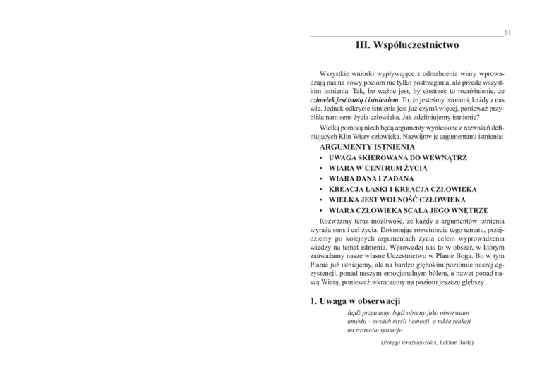 81 III. Współuczestnictwo Wszystkie wnioski wypływające z odrealnienia wiary wprowadzają nas na nowy poziom nie tylko postrzegania, ale przede wszystkim istnienia. Tak, bo ważne jest, by dostrzec to rozróżnienie, że człowiek jest istotą i istnieniem. To, że jesteśmy istotami, każdy z nas wie. Jednak odkrycie istnienia jest już czymś więcej, ponieważ przybliża nam sens życia człowieka. Jak zdefiniujemy istnienie? Wielką pomocą niech będą argumenty wyniesione z rozważań definiujących Klin Wiary człowieka. Nazwijmy je argumentami istnienia: ARGUMENTY ISTNIENIA • UWAGA SKIEROWANA DO WEWNĄTRZ • WIARA W CENTRUM ŻYCIA • WIARA DANA I ZADANA • KREACJA ŁASKI I KREACJA CZŁOWIEKA • WIELKA JEST WOLNOŚĆ CZŁOWIEKA • WIARA CZŁOWIEKA SCALA JEGO WNĘTRZE Rozważmy teraz możliwość, że każdy z argumentów istnienia wyraża sens i cel życia. Dokonując rozwinięcia tego tematu, przejdziemy po kolejnych argumentach życia celem wyprowadzenia wiedzy na temat istnienia. Wprowadzi nas to w obszar, w którym zauważamy nasze własne Uczestnictwo w Planie Boga. Bo w tym Planie już istniejemy, ale na bardzo głębokim poziomie naszej egzystencji, ponad naszym emocjonalnym bólem, a nawet ponad naszą Wiarą, ponieważ wkraczamy na poziom jeszcze głębszy… 1. Uwaga w obserwacji Bądź przytomny, bądź obecny jako obserwator umysłu – swoich myśli i emocji, a także reakcji na rozmaite sytuacje. (Potęga teraźniejszości, Eckhart Tolle) 82 Taniec Sfer III. Współuczestnictwo Uwaga w obserwacji, cóż to takiego? Wielu z nas nie jest skłonnych przywiązywać do tego wagi ani się nad tym zastanawiać. Zwykle uwagę kierujemy na zewnątrz, ale jak to jest, gdy skierujemy ją do wewnątrz. Niektórzy z nas znają odpowiedź na to pytanie i wiedzą, że wtedy wiele się zmienia w życiu każdego człowieka. Co ciekawe, każda obserwacja jest związana z uwagą, lecz nie każda uwaga jest związana z obserwacją (w potocznym sensie). Tak jak pierwsza część tego zdania jest w miarę oczywista, tak druga część nie jest już wcale taka oczywista. Przykładowo kierujemy uwagę na wzór dywanu pod naszymi stopami, oczy skierowane w dół, obserwujemy ułożenie obrazu i jego kolory. Obserwujemy dywan. A teraz skierujmy uwagę do swego wnętrza, jak się czujemy TERAZ, nie zagłębiamy się w przeszłość i przyszłość, odczuwamy jedność ze wszystkim, zagłębiamy się w pustkę… (oddalając myśli). W stanie pustki jest uwaga, ale nie ma obserwacji. Dopiero gdy pojawia się jakaś myśl, gdy ją zaobserwujemy, możemy ją odrzucić. Z tego krótkiego opisu widać, że obserwacja jest związana z rzeczami (w tym nawet z myślą), natomiast zagłębianie się w swojej duchowości nie wymaga już obserwacji. Natomiast UWAGA jest tym, co łączy świat duchowy i materialny, ponieważ odpowiednio nakierowana stymuluje rozwój duchowy. Skoro UWAGA jest tak ważna, to człowiek powinien zdawać sobie z tego sprawę w każdej chwili, w każdej okoliczności swego życia. Bowiem „uważna uwaga” przekierowuje myślenie człowieka w sfery duchowe, gdzie ogląd każdej sytuacji życiowej jest „szerszy”, bo widoczny w wielu perspektywach, z uwzględnieniem wymiaru duchowego. Uwaga jest tym „uważniejsza”, im mniej związana jest z obserwacją, a więc im bardziej skierowana jest do „wewnątrz”. Przykładem jest wszelka staranność materialna, która staje się jeszcze staranniejsza, gdy uwagę skierujemy do wnętrza, wtedy znajdziemy jeszcze inne sposoby dochowania tej staranności. Uwaga powinna być skierowana nie tylko na zaspokojenie podstawowych potrzeb życia materialnego, ale powinna sięgać do wnętrza, w celu odnalezienia celów duchowych. Za- 83 wsze, gdy kierujemy uwagę do wnętrza, korzystamy z wiedzy intuicyjnej i inspiracyjnej. Od czego zależy uważność w obserwacji? Z poprzednich analiz wiemy, że decydująca jest czystość parametrów duchowych człowieka. Każde zranienie z przeszłości pozostawia pewną traumę, przez którą człowiek jak przez filtr kieruje swoją uwagę. Przez to uwaga staje się mniej uważna, co ogranicza możliwość prawidłowego pojęcia przyczyn zjawisk i okoliczności, z którymi człowiek się spotyka. Rozszerzenie uwagi w kontekście, o którym tutaj mówimy, zawiera też projekcję wektora kreacji w przeszłość, która tę przeszłość zmienia w czasie TERAZ. Nie oznacza to, że zmieniamy przeszłość, bo nie możemy jej zmienić, ale likwidujemy możliwość oddziaływania na nas zranienia z przeszłości. W kontekście przeprowadzonych dotąd analiz możemy stwierdzić, że czasem zranienia wynikały z powodu niewłaściwego pojmowania miłości, przez nas i innych ludzi, albo były wynikiem naszej lekkomyślności lub innych osób, mogły też być niezawinione… Odpuśćmy więc to, bo nie jest to warte zachodu w świetle możliwości przemiany człowieka, duchowej przemiany, by wznieść się wyżej… Czy w uwadze odkrywamy ISTNIENIE? Z pewnością tak, przecież dzięki niej wiemy, że żyjemy. 2. Wiara w centrum życia Jesteś obecny całym swoim Istnieniem, każdą komórką ciała. (Potęga teraźniejszości, Eckhart Tolle) Skoro już kierujemy uwagę do naszego wnętrza, odkrywamy centrum życia, w którym znajduje się wszystko, co BYŁO, JEST I BĘDZIE. A to z tego powodu, że w centrum życia czas toczy się w TERAZ. Czy jest jakiś czas na Drodze Świętości człowieka wykresu emocji? Nie, w tej Drodze nie ma czasu. Tylko podążanie drogami 84 Taniec Sfer III. Współuczestnictwo emocjonalnego rozwoju odbywa się w czasie i w czasie jest przemierzanie bezkresnych obszarów ludzkiej niemocy. Jednak już każdy powrót na Drogę Świętości jest poza czasem, człowiek bowiem, objęty Miłością Zbawczą, poza ten czas wykracza do strefy bez czasu… Istnieje jednak czas odmierzany na zegarze i jesteśmy wciąż mu poddani, ponieważ żyjemy w Świecie kreacji materii, k