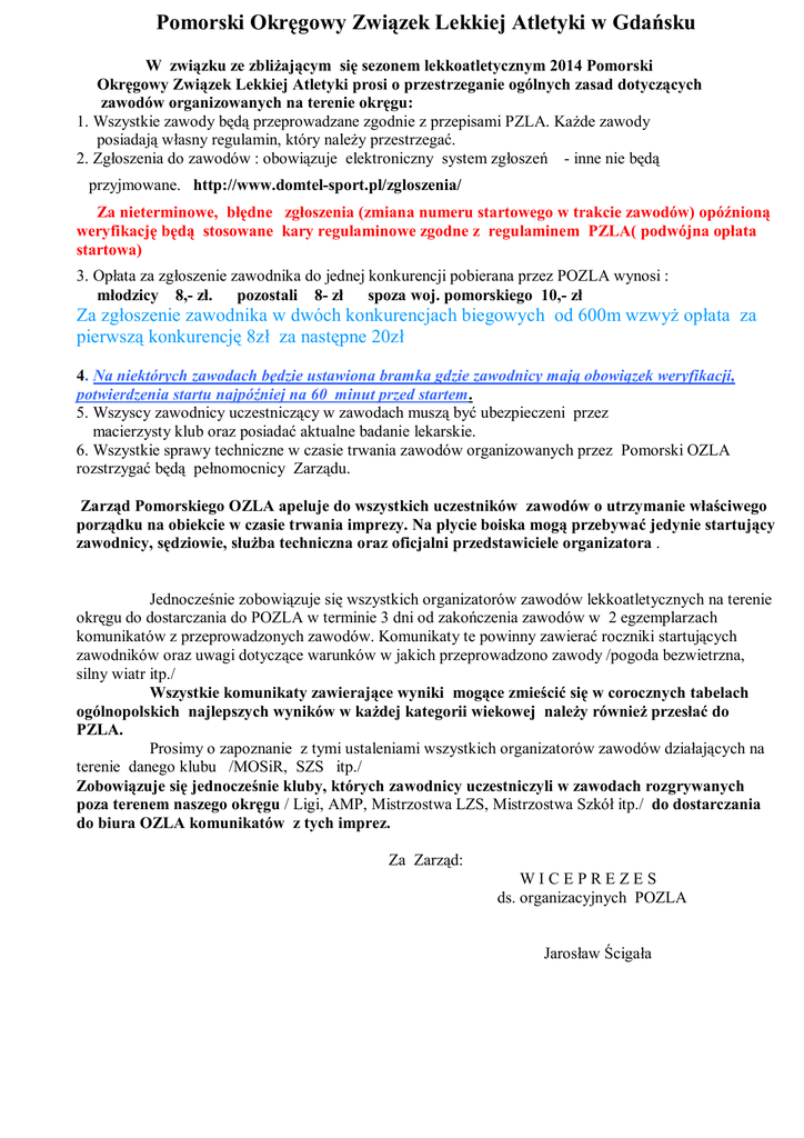 Pomorski Okręgowy Związek Lekkiej Atletyki w Gdańsku W związku ze zbliżającym się sezonem lekkoatletycznym 2014 Pomorski Okręgowy Związek Lekkiej Atletyki prosi o przestrzeganie ogólnych zasad dotyczących zawodów organizowanych na terenie okręgu: 1. Wszystkie zawody będą przeprowadzane zgodnie z przepisami PZLA. Każde zawody posiadają własny regulamin, który należy przestrzegać. 2. Zgłoszenia do zawodów : obowiązuje elektroniczny system zgłoszeń - inne nie będą przyjmowane. http://www.domtel-sport.pl/zgloszenia/ Za nieterminowe, błędne zgłoszenia (zmiana numeru startowego w trakcie zawodów) opóźnioną weryfikację będą stosowane kary regulaminowe zgodne z regulaminem PZLA( podwójna opłata startowa) 3. Opłata za zgłoszenie zawodnika do jednej konkurencji pobierana przez POZLA wynosi : młodzicy 8,- zł. pozostali 8- zł spoza woj. pomorskiego 10,- zł Za zgłoszenie zawodnika w dwóch konkurencjach biegowych od 600m wzwyż opłata za pierwszą konkurencję 8zł za następne 20zł 4. Na niektórych zawodach będzie ustawiona bramka gdzie zawodnicy mają obowiązek weryfikacji, potwierdzenia startu najpóźniej na 60 minut przed startem. 5. Wszyscy zawodnicy uczestniczący w zawodach muszą być ubezpieczeni przez macierzysty klub oraz posiadać aktualne badanie lekarskie. 6. Wszystkie sprawy techniczne w czasie trwania zawodów organizowanych przez Pomorski OZLA rozstrzygać będą pełnomocnicy Zarządu. Zarząd Pomorskiego OZLA apeluje do wszystkich uczestników zawodów o utrzymanie właściwego porządku na obiekcie w czasie trwania imprezy. Na płycie boiska mogą przebywać jedynie startujący zawodnicy, sędziowie, służba techniczna oraz oficjalni przedstawiciele organizatora . Jednocześnie zobowiązuje się wszystkich organizatorów zawodów lekkoatletycznych na terenie okręgu do dostarczania do POZLA w terminie 3 dni od zakończenia zawodów w 2 egzemplarzach komunikatów z przeprowadzonych zawodów. Komunikaty te powinny zawierać roczniki startujących zawodników oraz uwagi dotyczące warunków w jakich przeprowadzono zawody /pogoda bezwietrzna, silny wiatr itp./ Wszystkie komunikaty zawierające wyniki mogące zmieścić się w corocznych tabelach ogólnopolskich najlepszych wyników w każdej kategorii wiekowej należy również przesłać do PZLA. Prosimy o zapoznanie z tymi ustaleniami wszystkich organizatorów zawodów działających na terenie danego klubu /MOSiR, SZS itp./ Zobowiązuje się jednocześnie kluby, których zawodnicy uczestniczyli w zawodach rozgrywanych poza terenem naszego okręgu / Ligi, AMP, Mistrzostwa LZS, Mistrzostwa Szkół itp./ do dostarczania do biura OZLA komunikatów z tych imprez. Za Zarząd: WICEPREZES ds. organizacyjnych POZLA Jarosław Ścigała REGULAMIN Otwarcia Sezonu Lekkoatletycznego 1. Organizatorem zawodów jest Pomorski Okręgowy Związek Lekkiej Atletyki w Gdańsku 2. Zawody odbędą się w dniu 26. 04. 2014 r. /sobota/ na stadionie CETNIEWO. Początek zawodów o godzinie 11.00 dysk M i K, tyczka K , pozostałe konkurencje od godziny 12.00 3. Program zawodów : Kobiety 100m, 300m, 600m, 1000m, 300mppł,wzwyż /p. w. - 125cm/, w dal, kula, dysk, oszczep, młot Mężczyźni 100m, 300m,600m , 1000m, 2000m, 300mppł, wzwyż /p. w. - 145 cm/, w dal, , kula, dysk, oszczep, młot 4. Prawo startu mają zawodnicy/czki urodzeni w roku 2000-1992 / pozostali PK/. Zawodnik ma prawo startu w dwóch konkurencjach. Zawodnicy innych roczników (w tym również Weterani) mogą startować P K – W konkurencjach technicznych odbędą się 4 próby w każdej kategorii wiekowej. Biegi odbędą się w seriach na czas. Obowiązuje sprzęt zgodnie z kategorią wiekową. 5. Zgłoszenia elektroniczny system zgłoszeń http://www.domtel-sport.pl/zgloszenia/ w nieprzekraczalnym terminie do dnia 23. 04. 2014 r. /środa/. 6. Koszty organizacyjne zawodów pokrywa Urząd Marszałkowski w Gdańsku, koszty osobowe zgłaszające kluby. Opłata startowa wynosi 8,oo zł. od konkurencji dla zawodników zrzeszonych w klubach województwa pomorskiego, natomiast dla zawodników spoza województwa, opłata za osobostart wynosi 10,oo zł. Za zgłoszenie zawodnika w dwóch konkurencjach biegowych od 600m wzwyż opłata za pierwszą konkurencję 8zł za następne 20zł Za nieterminowe, niepełne lub nieprawidłowe zgłoszenia będzie stosowana kara regulaminowa w postaci dwukrotnej opłaty startowej od osobo-startu. 7. Każdy zawodnik startujący w zawodach musi być ubezpieczony oraz posiadać aktualne badania lekarskie jak również podwójny numer startowy (zgodny ze zgłoszeniem). Za powyższe odpowiedzialność ponoszą zgłaszające kluby. 8. Pełnomocnikiem Zarządu POZLA na zawodach będzie Pan Eugeniusz Markowicz 9. Funkcję Sędziego Głównego Zawodów pełnić będzie Pan Henryk Fiederowicz W uzasadnionych przypadkach program zawodów może ulec zmianie, o czym decydują wspólnie: Sędzia główny zawodów i pełnomocnik Zarządu POZLA. ORGANIZATOR 2 REGULAMIN Mityng Kwalifikacyjny Juniorów i Juniorów Młodszych 1. Organizatorem zawodów jest Pomorski Okręgowy Związek Lekkiej Atletyki w Gdańsku. 2. Zawody odbędą się w dniu 10.05.2014 r. /sobota/ na stadionie w AWFiS GDAŃSK. Początek zawodów o godzinie 13ºº /tyczka M, dysk K i M, chód / pozostałe konkurencje będą kontynuowane od godziny 15.00 3. Program zawodów: Kobiety 100m, 200m, 400m, 800m, 1500m, 100mppł., chód 5000m, wzwyż, tyczka, w dal, kula, dysk, oszczep, Mężczyźni 100m, 200m, 400m, 800m, 1500m, 110mppł., chód 100000m wzwyż, tyczka, w dal, kula, dysk, oszczep. 4. Prawo startu mają zawodnicy/czki urodzeni w latach 1998- 95 oraz starsi. Dopuszcza się również start P.K w konkurencjach biegowych, skoku w dal, skoku wzwyż, skoku o tyczce ( z zachowaniem podanych wysokości początkowych) w innych kategoriach wiekowych (oprócz dzieci starszych i młodszych). W konkurencjach rzutowych starty P.K. młodzików tylko w oszczepie i pchnięci