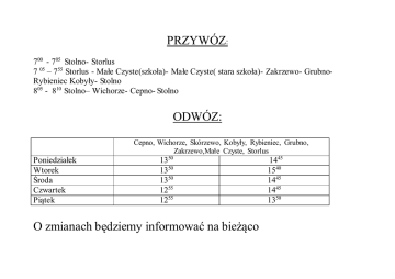 PRZYWÓZ: 700 - 705 Stolno- Storlus 7 05 – 755 Storlus - Małe Czyste(szkoła)- Małe Czyste( stara szkoła)- Zakrzewo- GrubnoRybieniec Kobyły- Stolno 805 - 810 Stolno– Wichorze- Cepno- Stolno ODWÓZ: Cepno, Wichorze, Skórzewo, Kobyły, Rybieniec, Grubno, Zakrzewo,Małe Czyste, Storlus Poniedziałek Wtorek Środa Czwartek Piątek 1350 1350 1350 1255 1255 O zmianach będziemy informować na bieżąco 1445 1540 1445 1445 1350