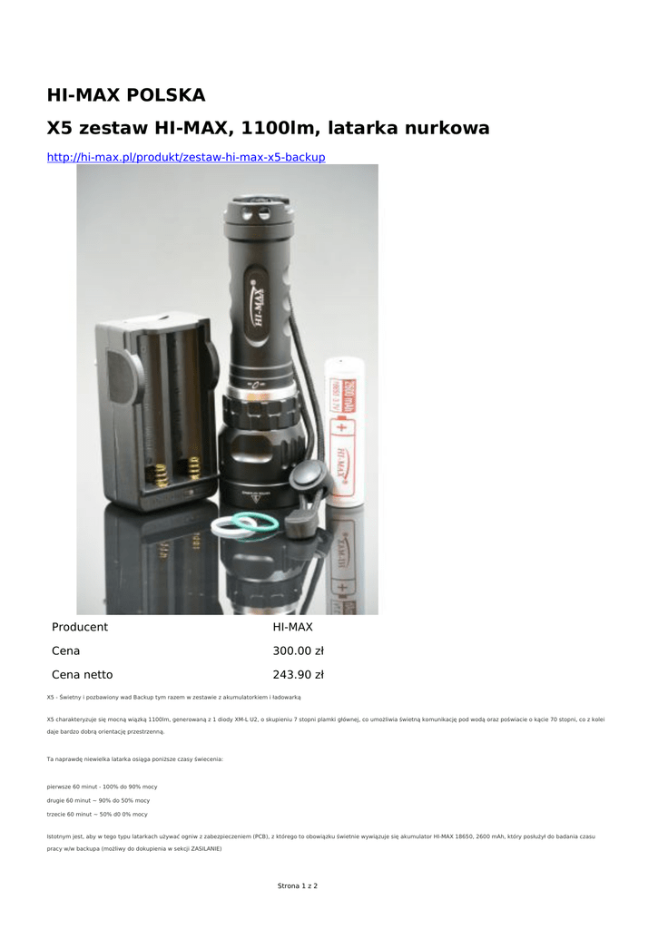 HI-MAX POLSKA X5 zestaw HI-MAX, 1100lm, latarka nurkowa http://hi-max.pl/produkt/zestaw-hi-max-x5-backup Producent HI-MAX Cena 300.00 zł Cena netto 243.90 zł X5 - Świetny i pozbawiony wad Backup tym razem w zestawie z akumulatorkiem i ładowarką X5 charakteryzuje się mocną wiązką 1100lm, generowaną z 1 diody XM-L U2, o skupieniu 7 stopni plamki głównej, co umożliwia świetną komunikację pod wodą oraz poświacie o kącie 70 stopni, co z kolei daje bardzo dobrą orientację przestrzenną. Ta naprawdę niewielka latarka osiąga poniższe czasy świecenia: pierwsze 60 minut - 100% do 90% mocy drugie 60 minut ~ 90% do 50% mocy trzecie 60 minut ~ 50% d0 0% mocy Istotnym jest, aby w tego typu latarkach używać ogniw z zabezpieczeniem (PCB), z którego to obowiązku świetnie wywiązuje się akumulator HI-MAX 18650, 2600 mAh, który posłużył do badania czasu pracy w/w backupa (możliwy do dokupienia w sekcji ZASILANIE) Strona 1 z 2 Maksymalna głębokość operacyjna X5 to 100m. Gwarantuje to, zastosowanie dwóch o-ringów nitrylowych z których pierwszy, dodatkowo jest wyposażony w substancję antykorozyjną na wypadek używania X5 w środowiskach aktywnych chemicznie. Kompaktowy rozmiar X5, wąskie skupienie plamki głównej, duża moc, bardzo długi czas świecenia oraz niewielka cena czynią naszym zdaniem z X5 backup idealny. Wyposażenie: - latarka X5 - ładowarka - akumulatorek HI-MAX 18650, 2600 mAh - smycz na rękę - zapasowe o-ringi Zobacz niezależny test naszych latarek na Nuras. info nr 2. luty 2015 - tutaj Strona 2 z 2
