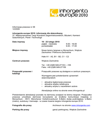 Informacja prasowa nr 06 12/2009 inhorgenta europe 2010: informacje dla dziennikarzy 37. Międzynarodowe Targi Wyrobów Zegarmistrzowskich, Biżuterii, Kamieni Szlachetnych, Pereł i Technologii Data imprezy Miejsce imprezy 19 - 22 lutego 2010 piątek - niedziela poniedziałek 9.00 - 18.00 9.00 - 17.00 Nowe tereny targowe w Monachium, Wejście Zachodnie i Północno-Zachodnie Hale A1 - A2, B1 - B2, C1 - C2 Centrum prasowe Wejście Zachodnie Tel.: +49 (0)89 949-27153 i –155 Faks: +49 (0)89 949-27159 Przepustki prasowe i katalogi Przepustki prasowe są dostępne w centrum prasowym. Wymagane jest potwierdzenie uprawnień dziennikarskich: • • • aktualna legitymacja prasowa aktualna stopka redakcyjna aktualny artykuł z nazwiskiem autora Akredytacja online na stronie www.inhorgenta.pl Potwierdzenie akredytacji pozwala na darmowy przejazd na tereny targowe. Przepustka prasowa umożliwia darmowe korzystanie ze środków komunikacji miejskiej w Monachium - MVV: Münchener Verkehrsverbund: S-Bahn (kolej podmiejska), U-Bahn (metro), autobusy i tramwaje - w czasie trwania targów inhorgenta europe 2010. Fotografie dla prasy Archiwum na stronie www.inhorgenta.com Parking dla prasy garaż parkingowy, Wejście Zachodnie Obsługa prasowa: Susanne Fischer, dyrektor marketingu działu targów dóbr konsumpcyjnych Tel.: +49 (0)89 949 20870, Faks: +49 (0)89 949 97 20870, [email protected] Maud von Hoff, menedżer ds. komunikacji Tel.: +49 (0)89 949 20610, Fax: +49 (0)89 949 97 20610, [email protected] Elisabeth Kandler, koordynator ds. public relations Tel.: +49 (0)89 949 20611, Fax: +49 (0)89 949 97 20611,[email protected] Christine Heufer, rzecznik prasowy (Radio i TV) Tel.: +49 (0)89 949 20715, Faks: +49 (0)89 949 20719, [email protected]